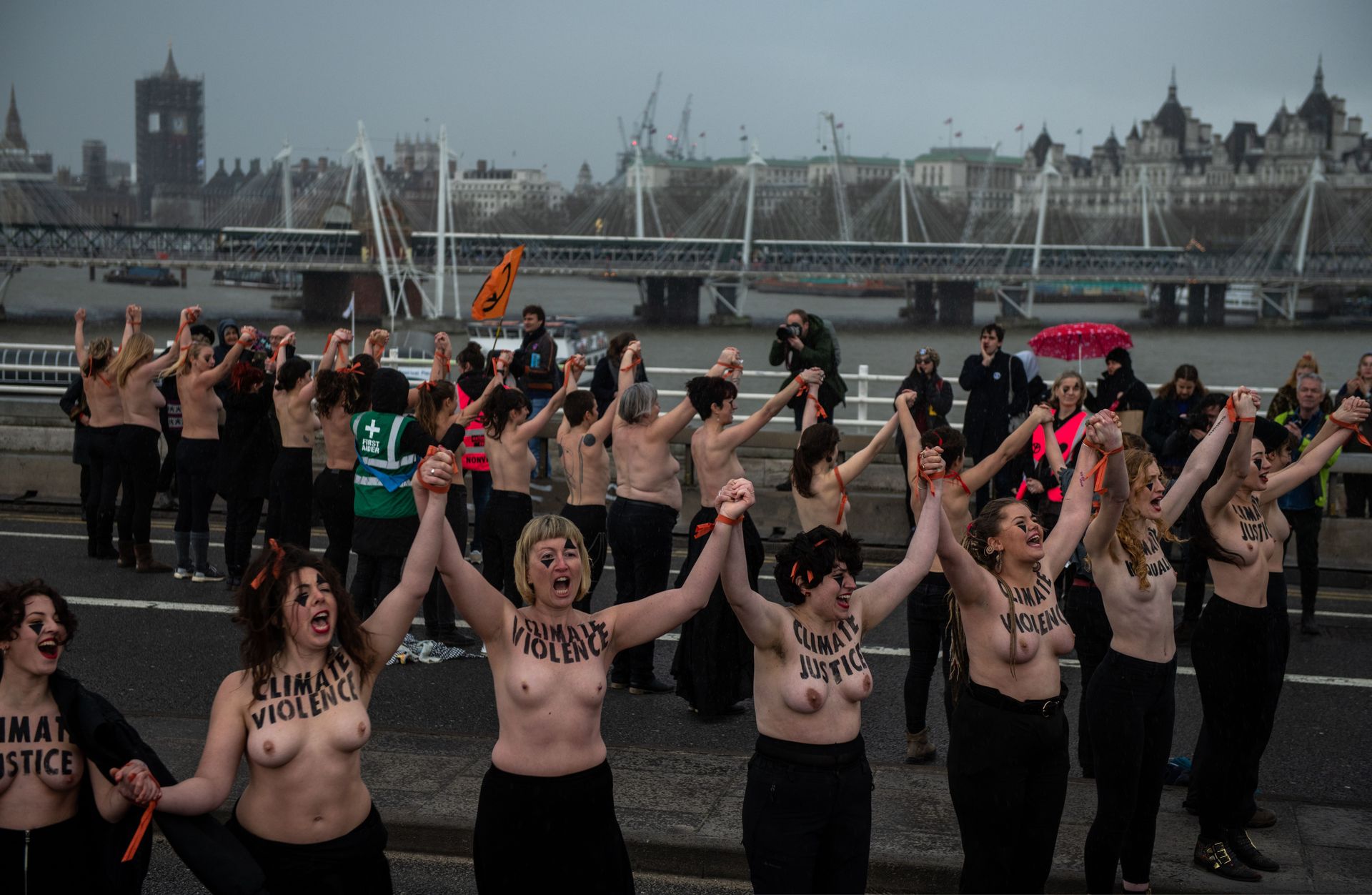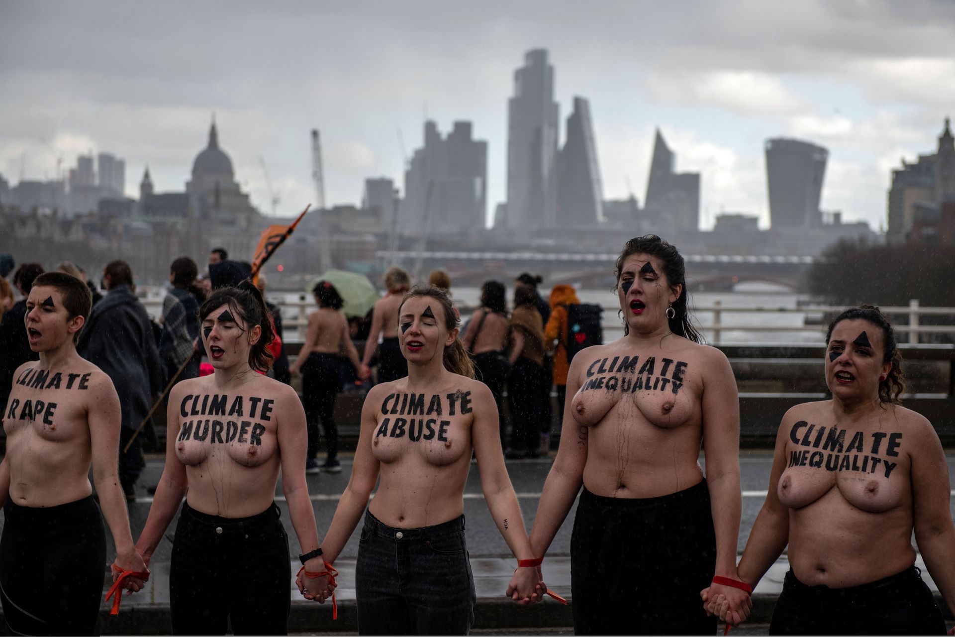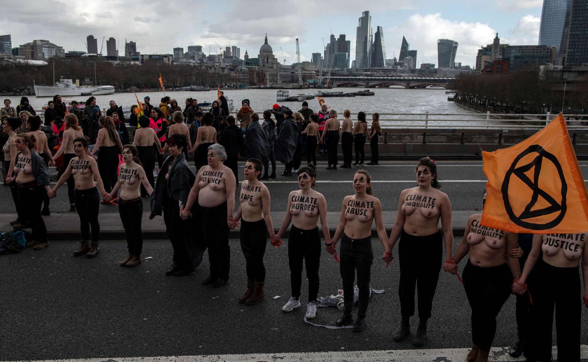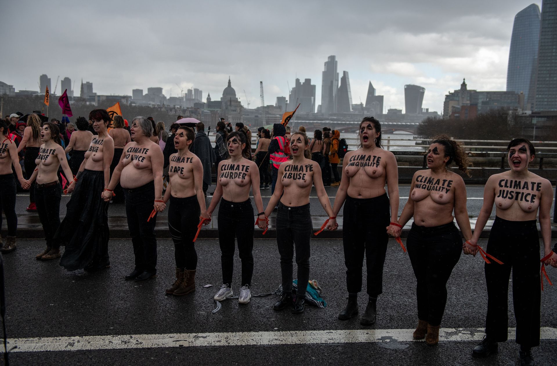 Miembros femeninas del grupo activista Extinction Rebellion por la Crisis Climática protestan sin camiseta mientras bloquean todo el tráfico en una acción para mostrar solidaridad con las mujeres de todo el mundo que se ven afectadas de manera desproporcionada por la Crisis Climática y Ecológica. Con frases como Justicia Climática, Violación Climática, Asesinato Climático e Inequidad Climática en sus pechos, la acción es una de muchas en todo el mundo hoy por el grupo, incluyendo acciones en Colombia, España, Turquía, Gambia, Pakistán, Nigeria, Uganda, RDC, Bélgica, Israel, Suecia y Argentina.