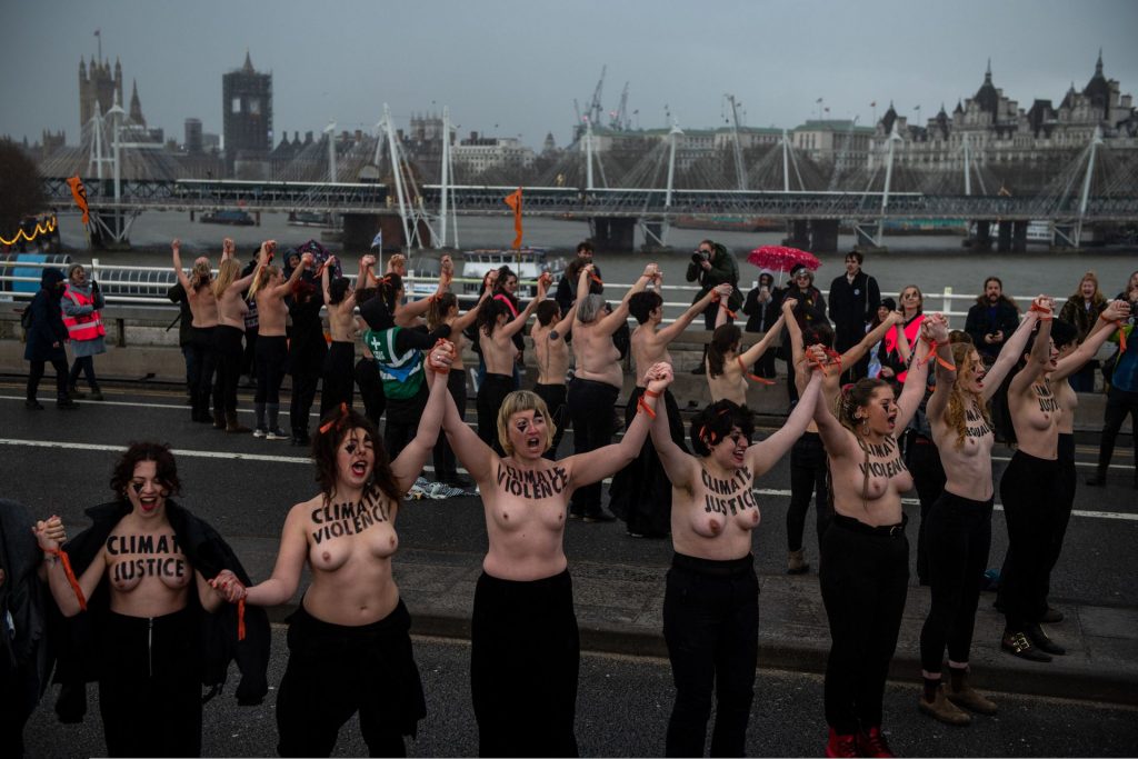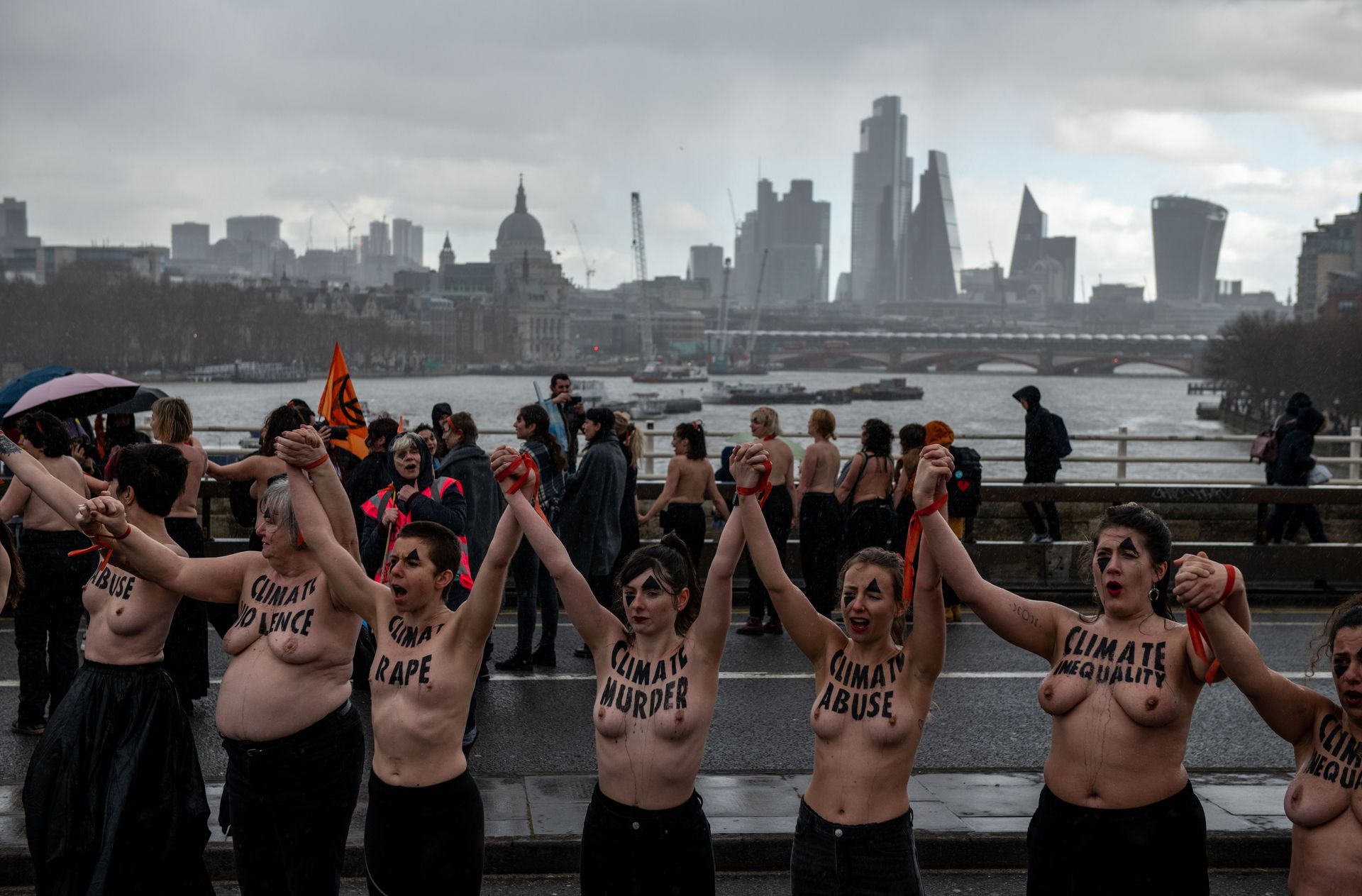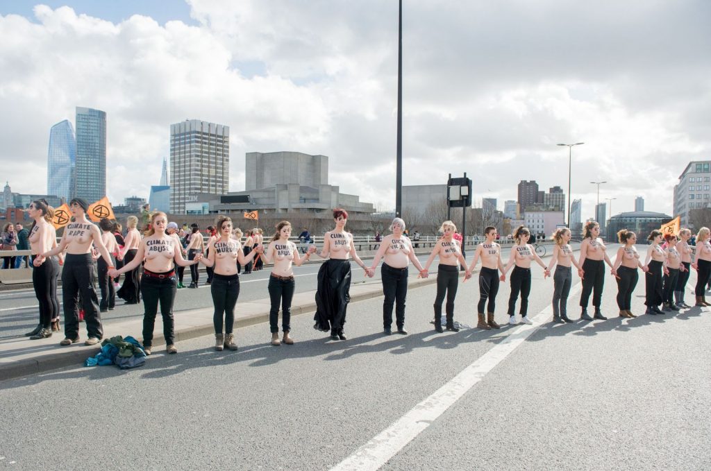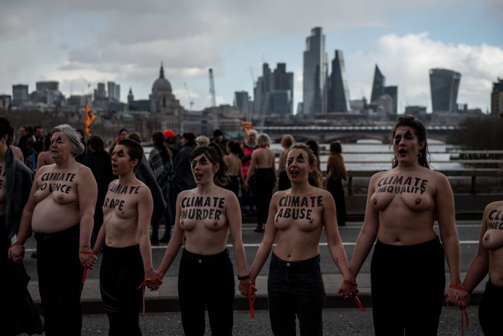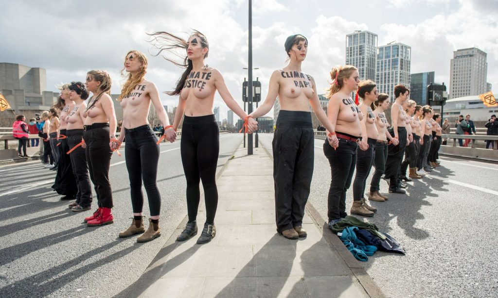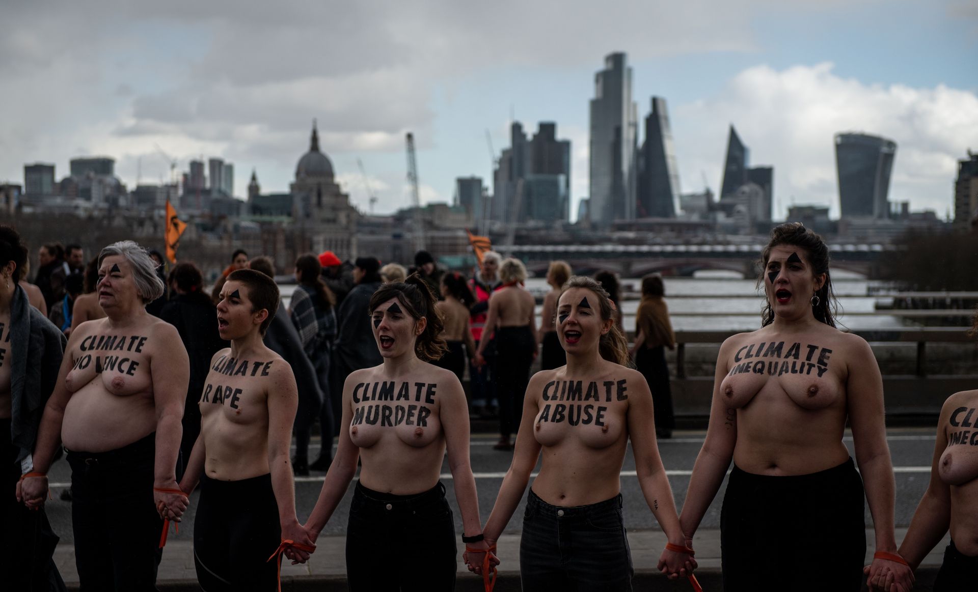 Miembros femeninas del grupo activista Extinction Rebellion por la Crisis Climática protestan sin camiseta mientras bloquean todo el tráfico en una acción para mostrar solidaridad con las mujeres de todo el mundo que se ven afectadas de manera desproporcionada por la Crisis Climática y Ecológica. Con frases como Justicia Climática, Violación Climática, Asesinato Climático e Inequidad Climática en sus pechos, la acción es una de muchas en todo el mundo hoy por el grupo, incluyendo acciones en Colombia, España, Turquía, Gambia, Pakistán, Nigeria, Uganda, RDC, Bélgica, Israel, Suecia y Argentina.