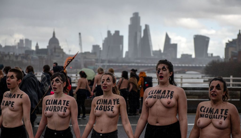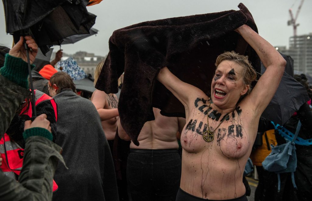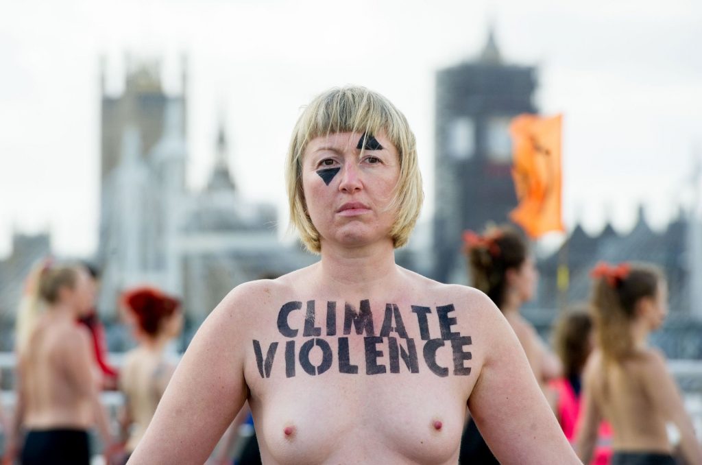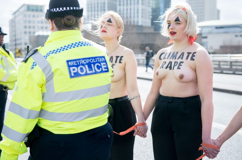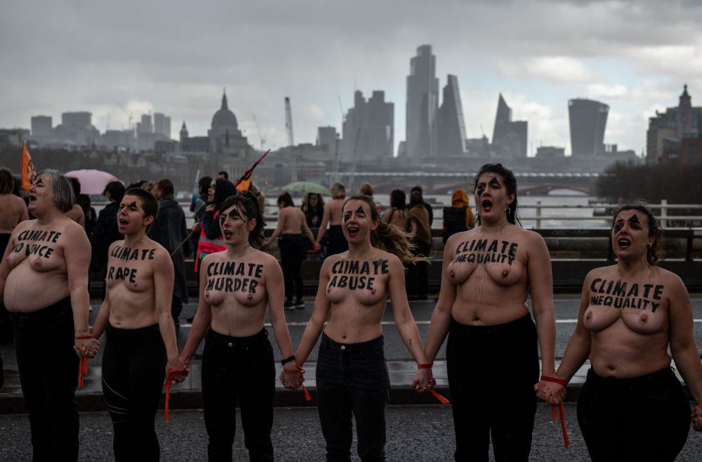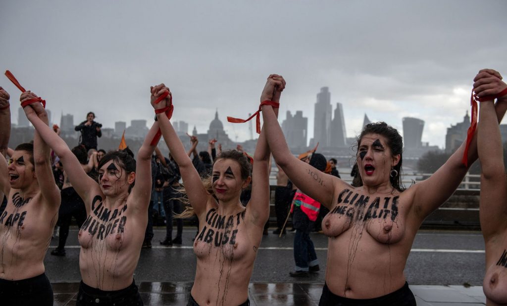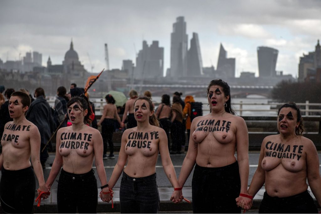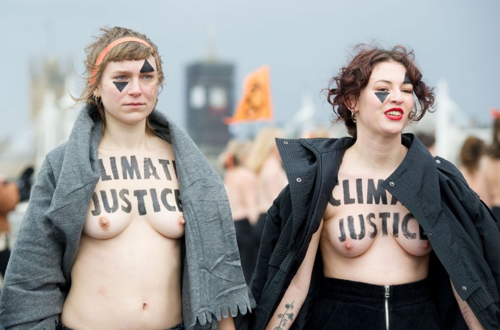 Miembros femeninas del grupo activista Extinction Rebellion por la Crisis Climática protestan sin camiseta mientras bloquean todo el tráfico en una acción para mostrar solidaridad con las mujeres de todo el mundo que se ven afectadas de manera desproporcionada por la Crisis Climática y Ecológica. Con frases como Justicia Climática, Violación Climática, Asesinato Climático e Inequidad Climática en sus pechos, la acción es una de muchas en todo el mundo hoy por el grupo, incluyendo acciones en Colombia, España, Turquía, Gambia, Pakistán, Nigeria, Uganda, RDC, Bélgica, Israel, Suecia y Argentina.