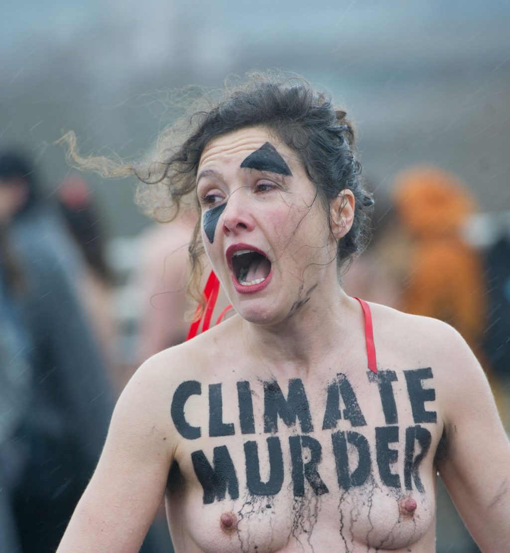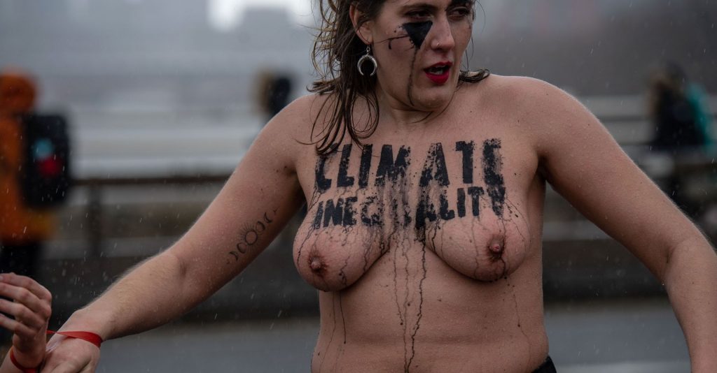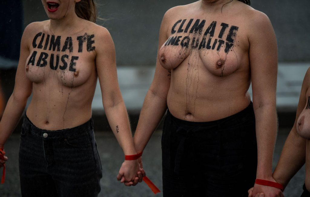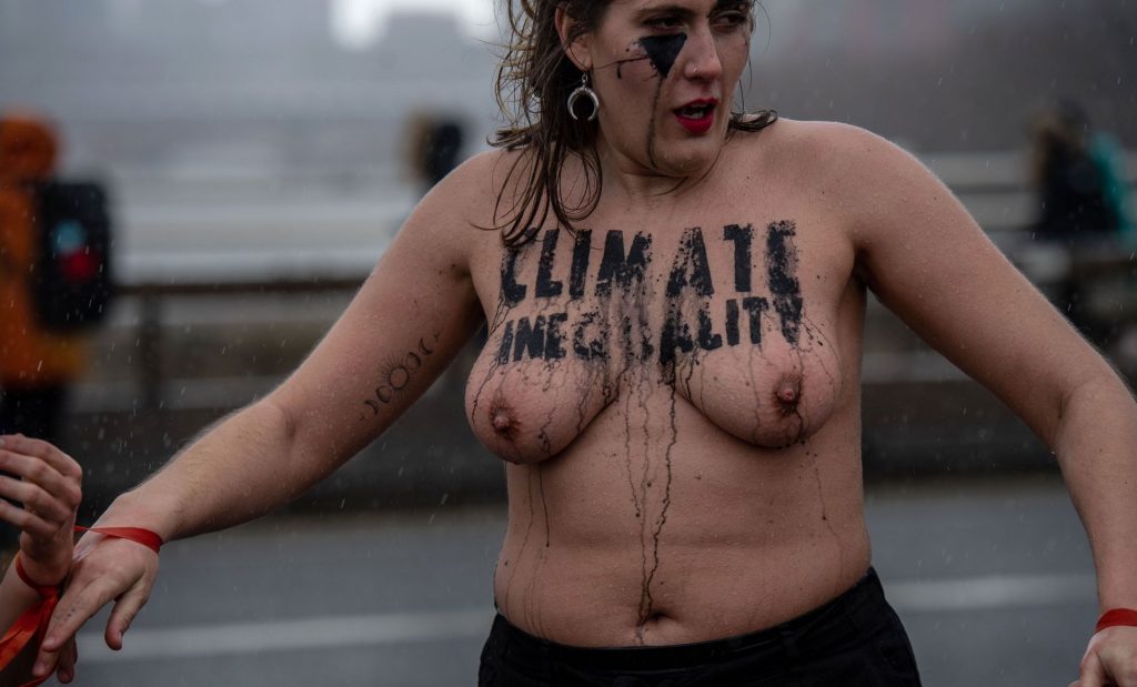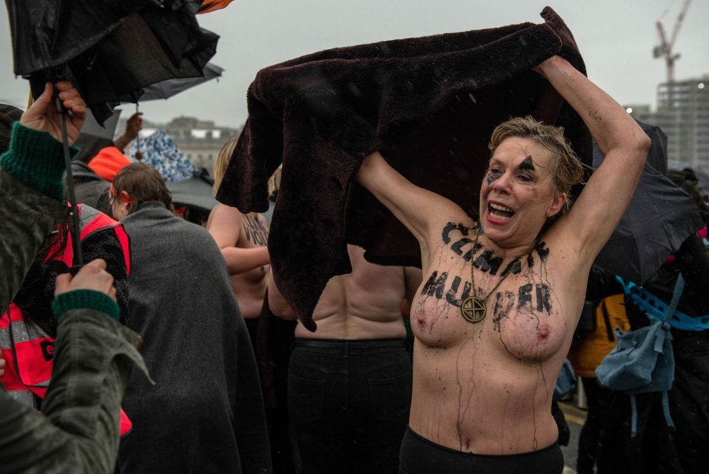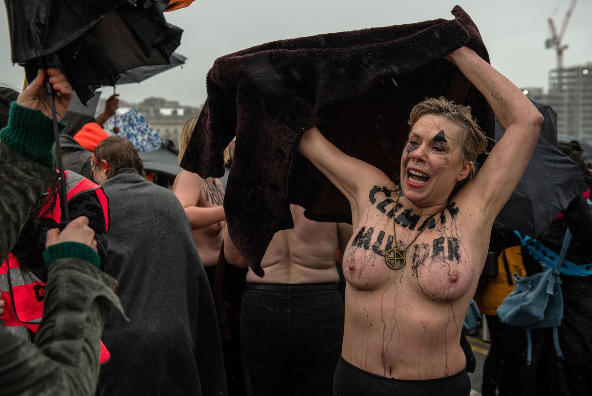 Miembros femeninas del grupo activista Extinction Rebellion por la Crisis Climática protestan sin camiseta mientras bloquean todo el tráfico en una acción para mostrar solidaridad con las mujeres de todo el mundo que se ven afectadas de manera desproporcionada por la Crisis Climática y Ecológica. Con frases como Justicia Climática, Violación Climática, Asesinato Climático e Inequidad Climática en sus pechos, la acción es una de muchas en todo el mundo hoy por el grupo, incluyendo acciones en Colombia, España, Turquía, Gambia, Pakistán, Nigeria, Uganda, RDC, Bélgica, Israel, Suecia y Argentina.
