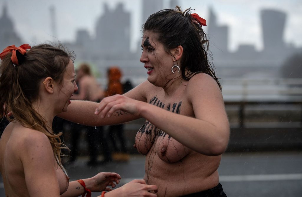 Activistas femeninas de Extinction Rebellion sin camiseta bloquean el Puente Waterloo en una manifestación por el Día Internacional de la Mujer el 8 de marzo de 2020 en Londres, Inglaterra. El Día Internacional de la Mujer se celebra cada año el 8 de marzo y es un día global que celebra los logros sociales, económicos, culturales y políticos de las mujeres, sirviendo como un punto focal para los derechos de las mujeres.