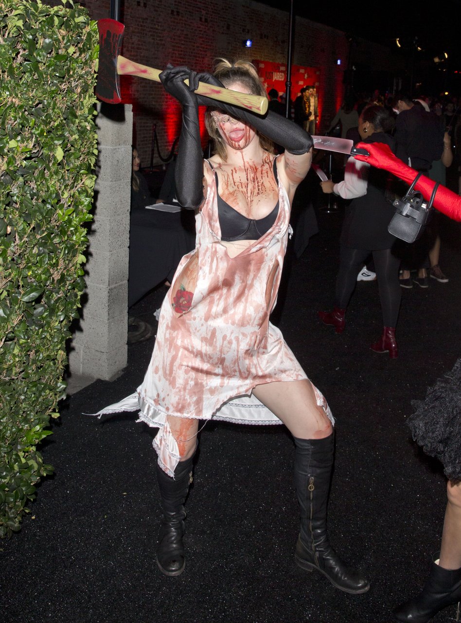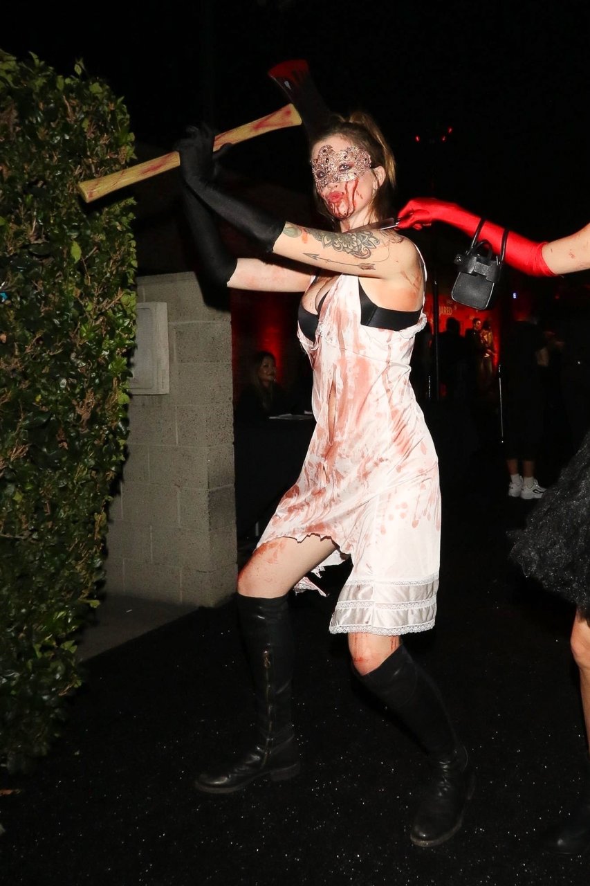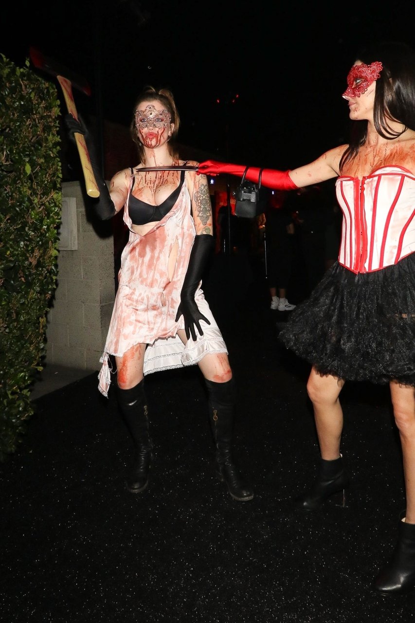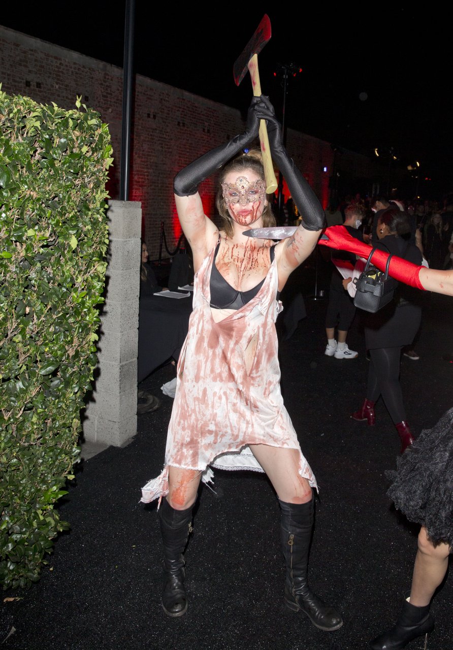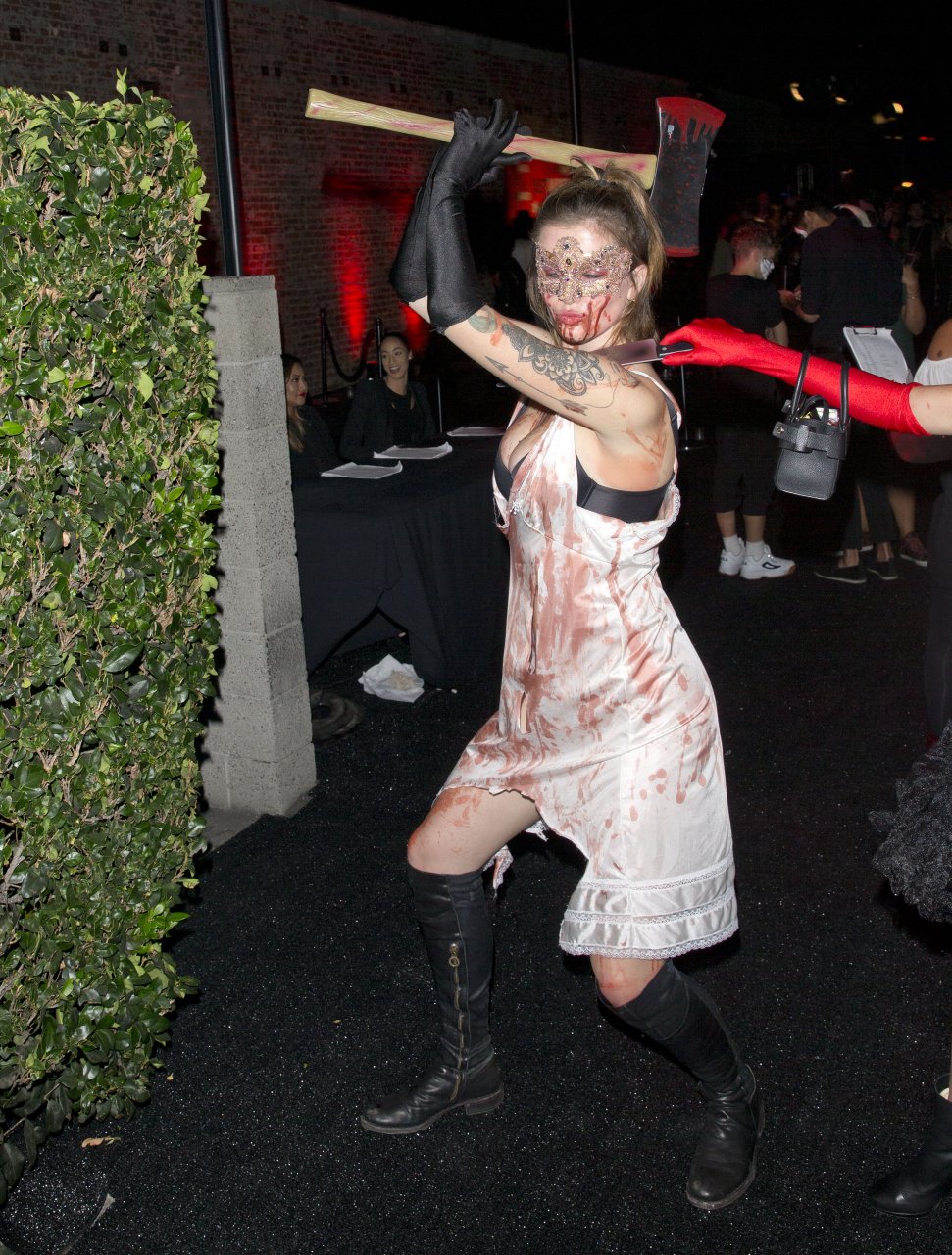 La modelo Ireland Baldwin fue vista llegando a la fiesta de Halloween de Just Jared en West Hollywood, 28/10/2018. Ireland estaba disfrazada de asesina con hacha ensangrentada para Halloween.