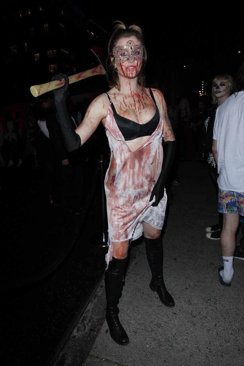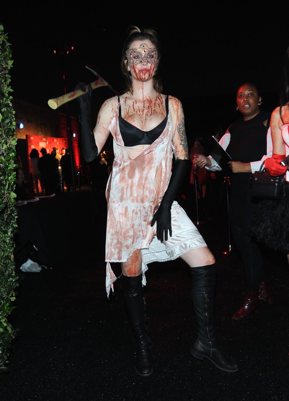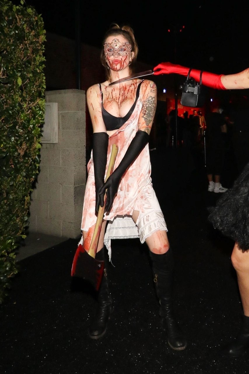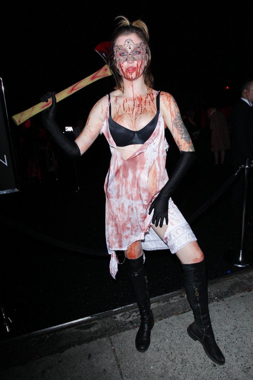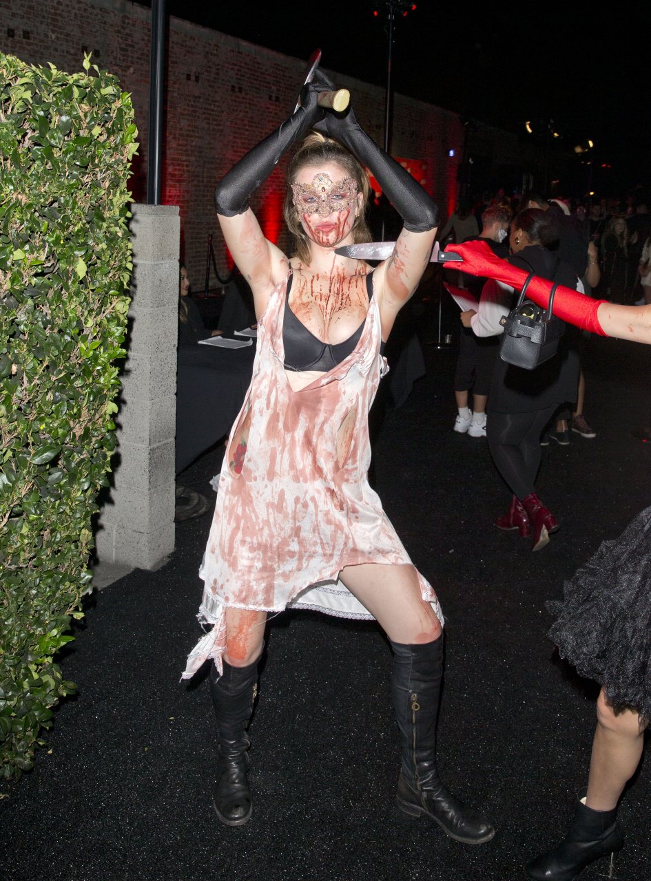 La modelo Ireland Baldwin fue vista llegando a la fiesta de Halloween de Just Jared en West Hollywood, 28/10/2018. Ireland estaba disfrazada de asesina con hacha ensangrentada para Halloween.