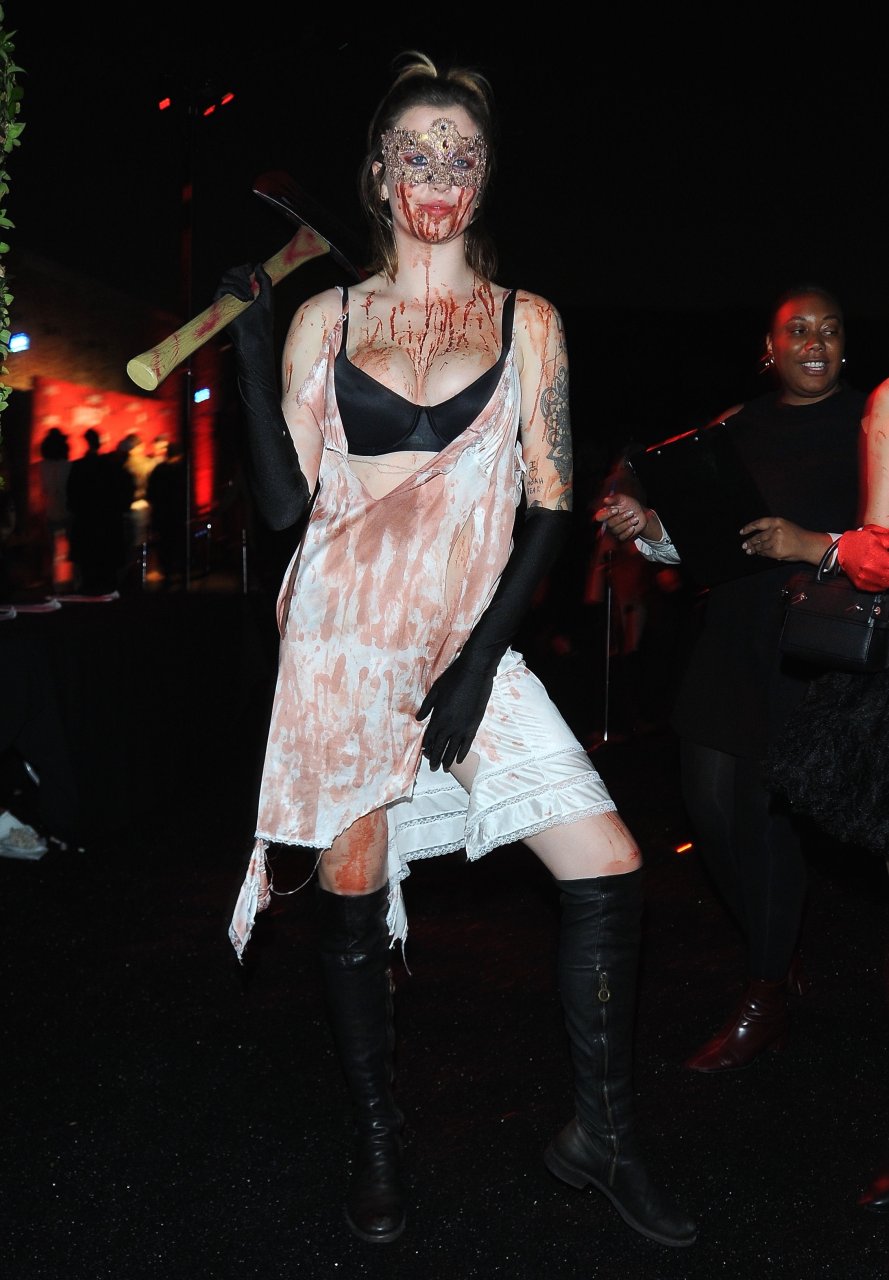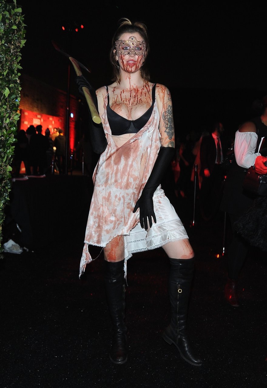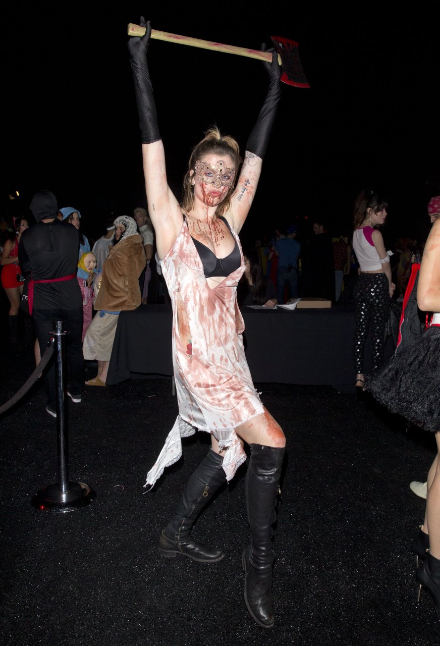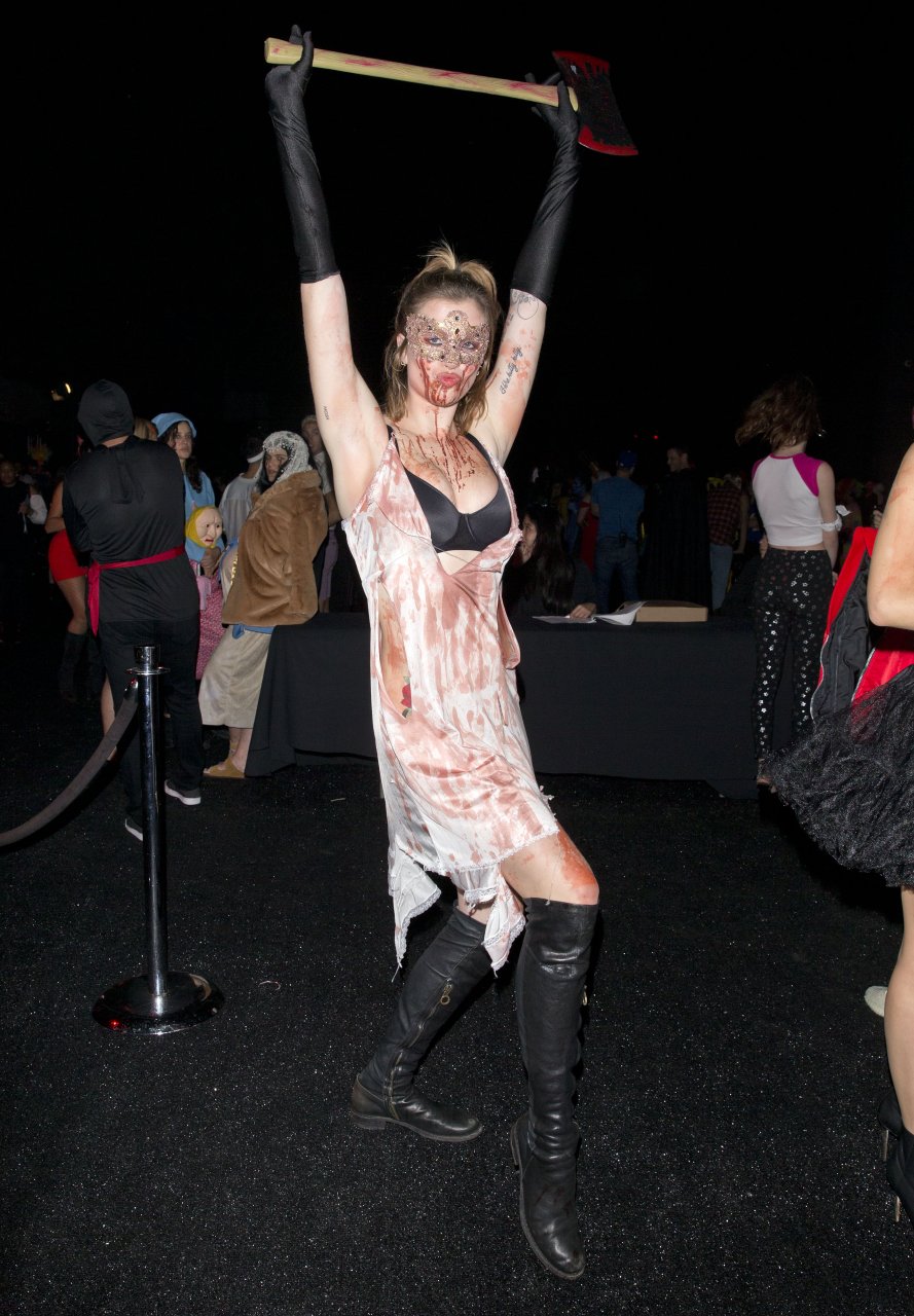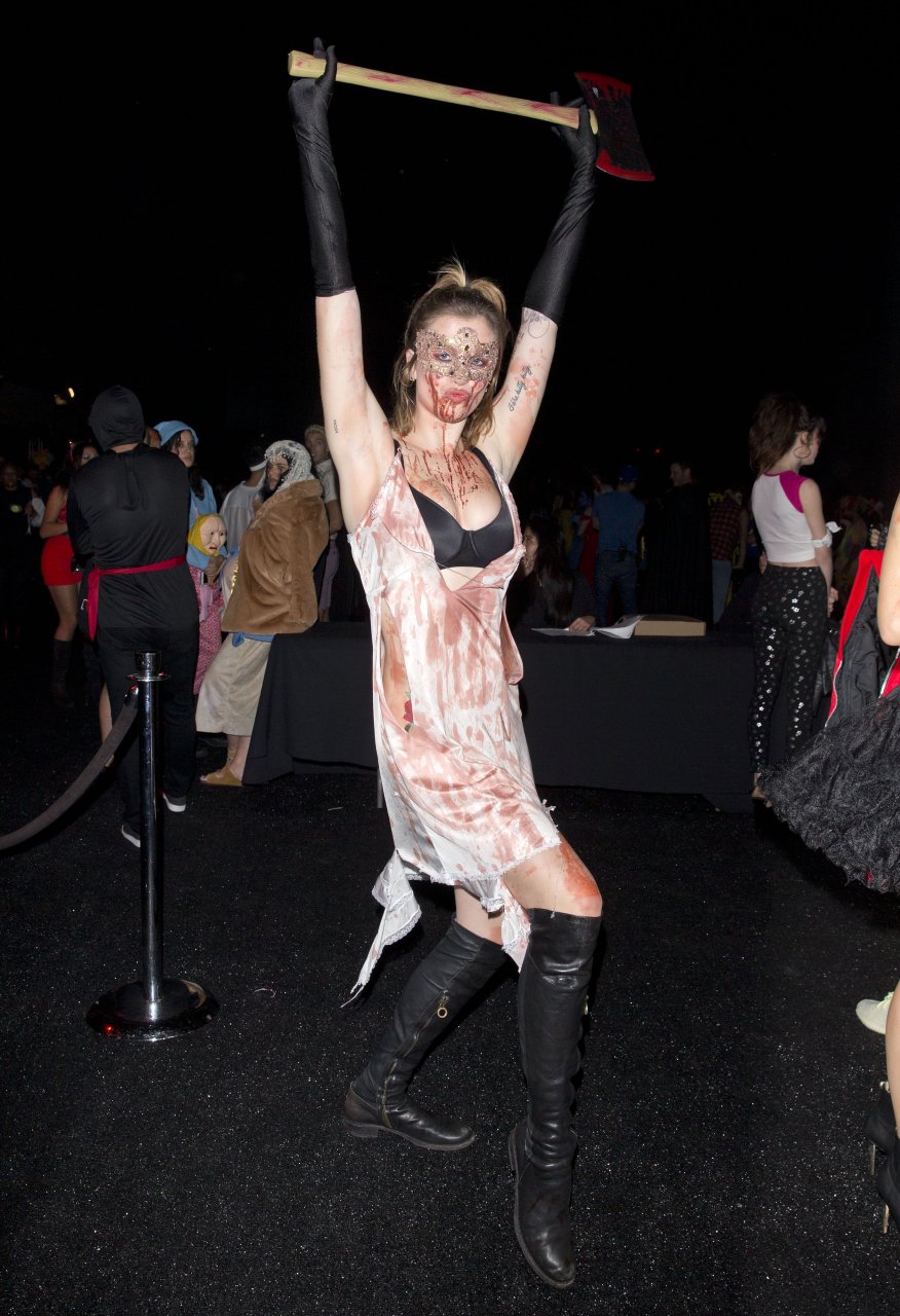 La modelo Ireland Baldwin fue vista llegando a la fiesta de Halloween de Just Jared en West Hollywood, 28/10/2018. Ireland estaba disfrazada de asesina con hacha ensangrentada para Halloween.