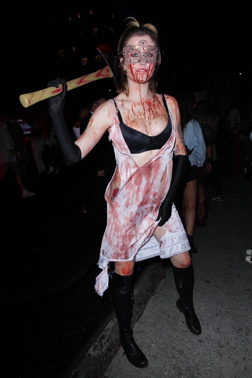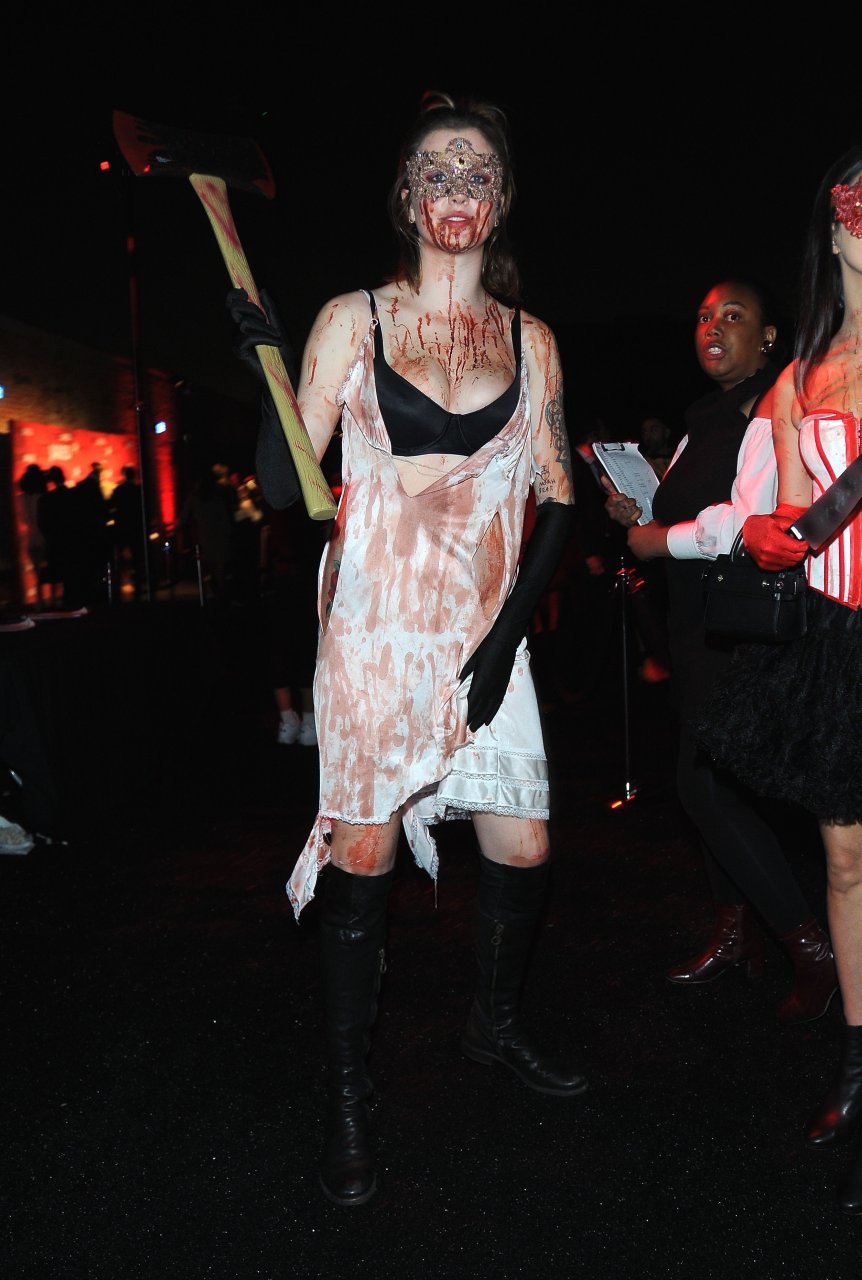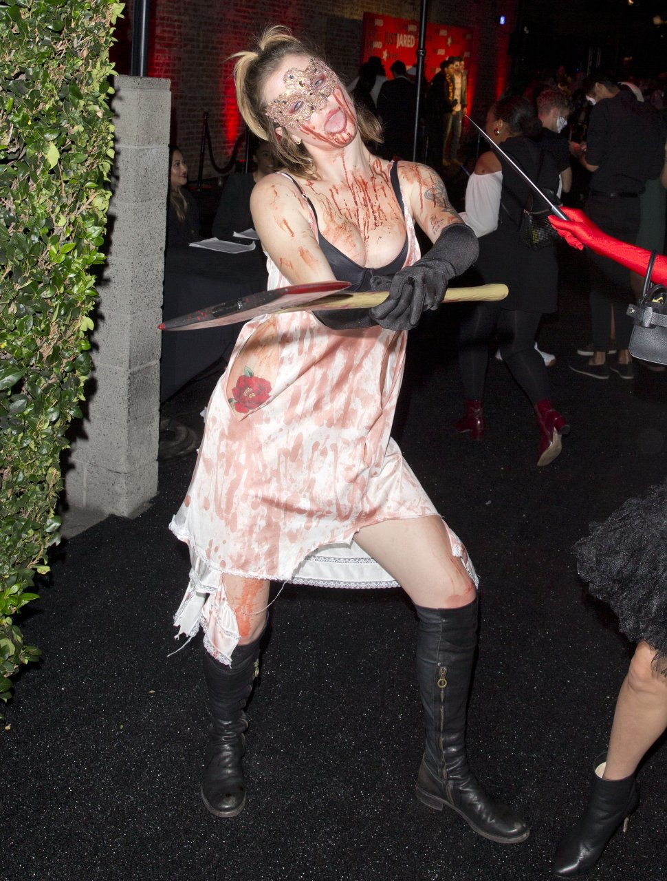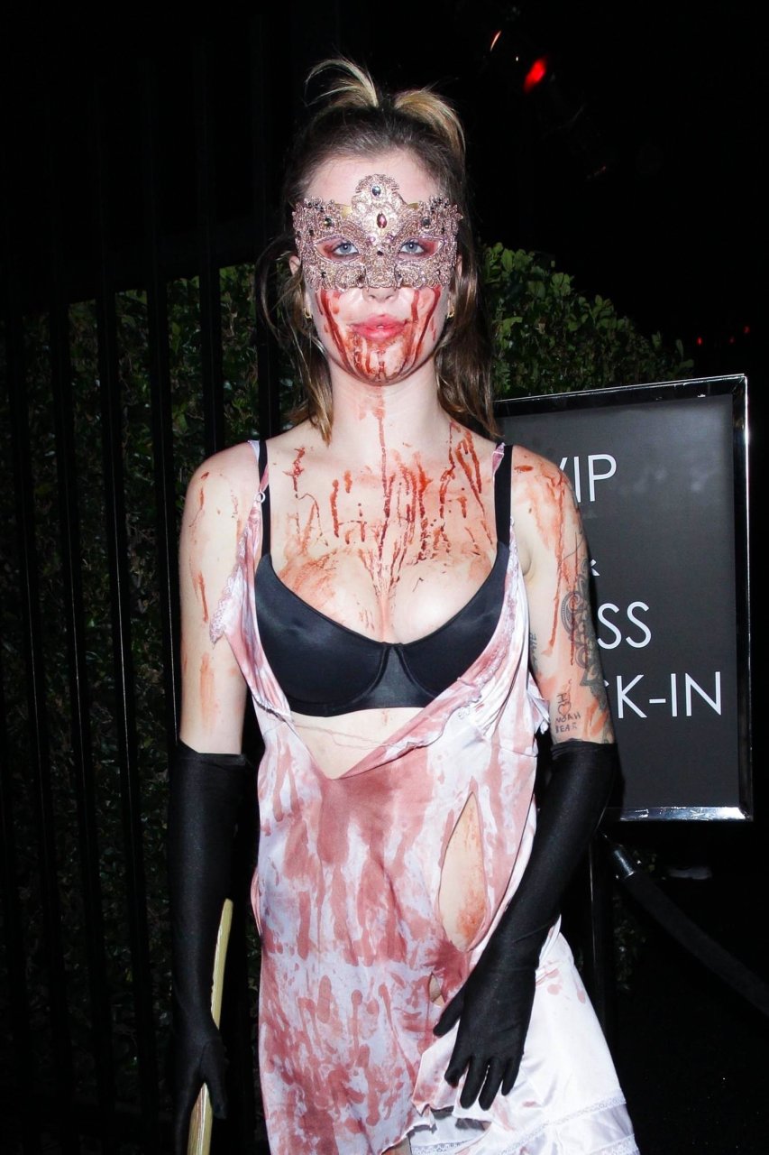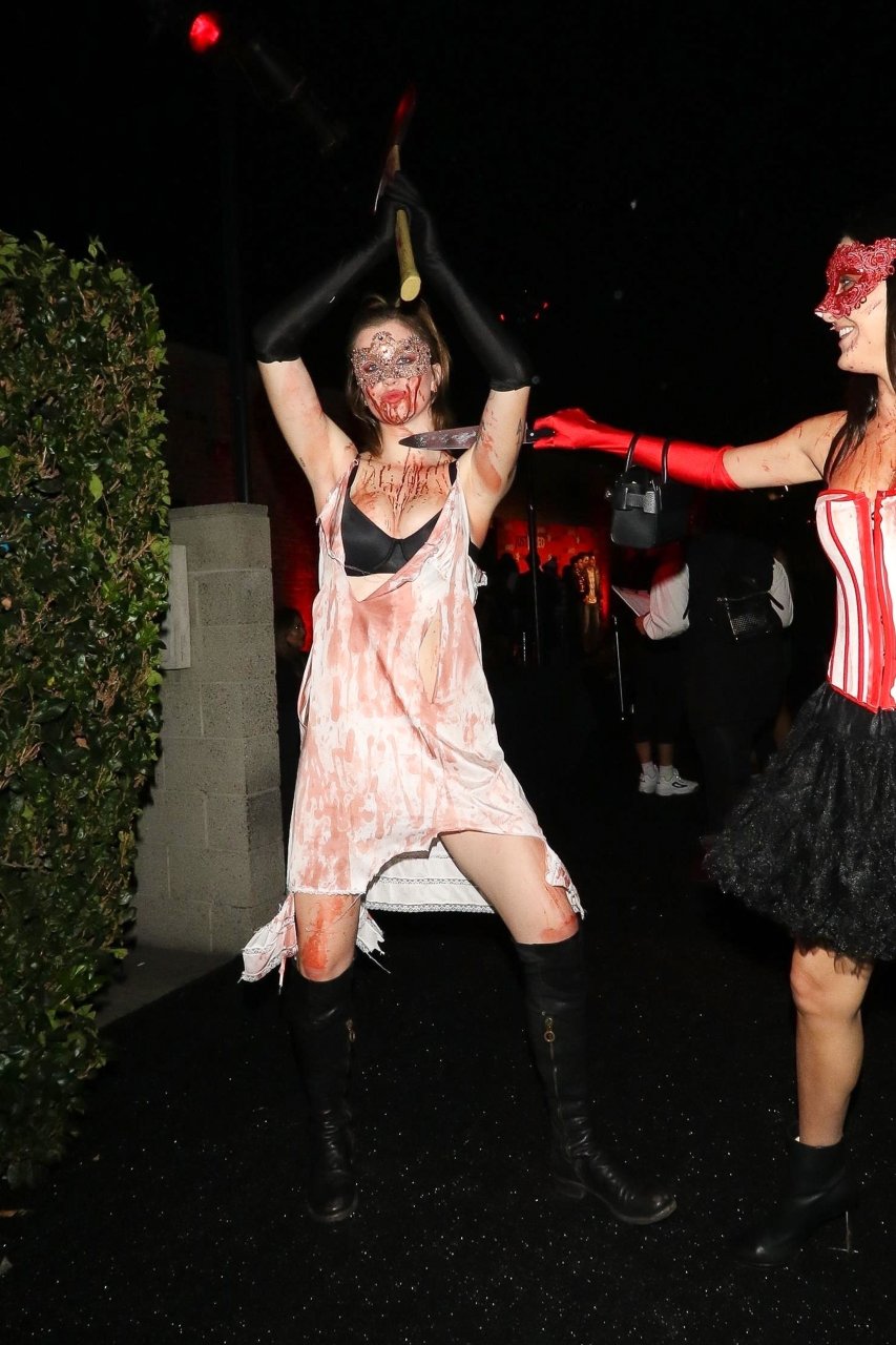 La modelo Ireland Baldwin fue vista llegando a la fiesta de Halloween de Just Jared en West Hollywood, 28/10/2018. Ireland estaba disfrazada de asesina con hacha ensangrentada para Halloween.