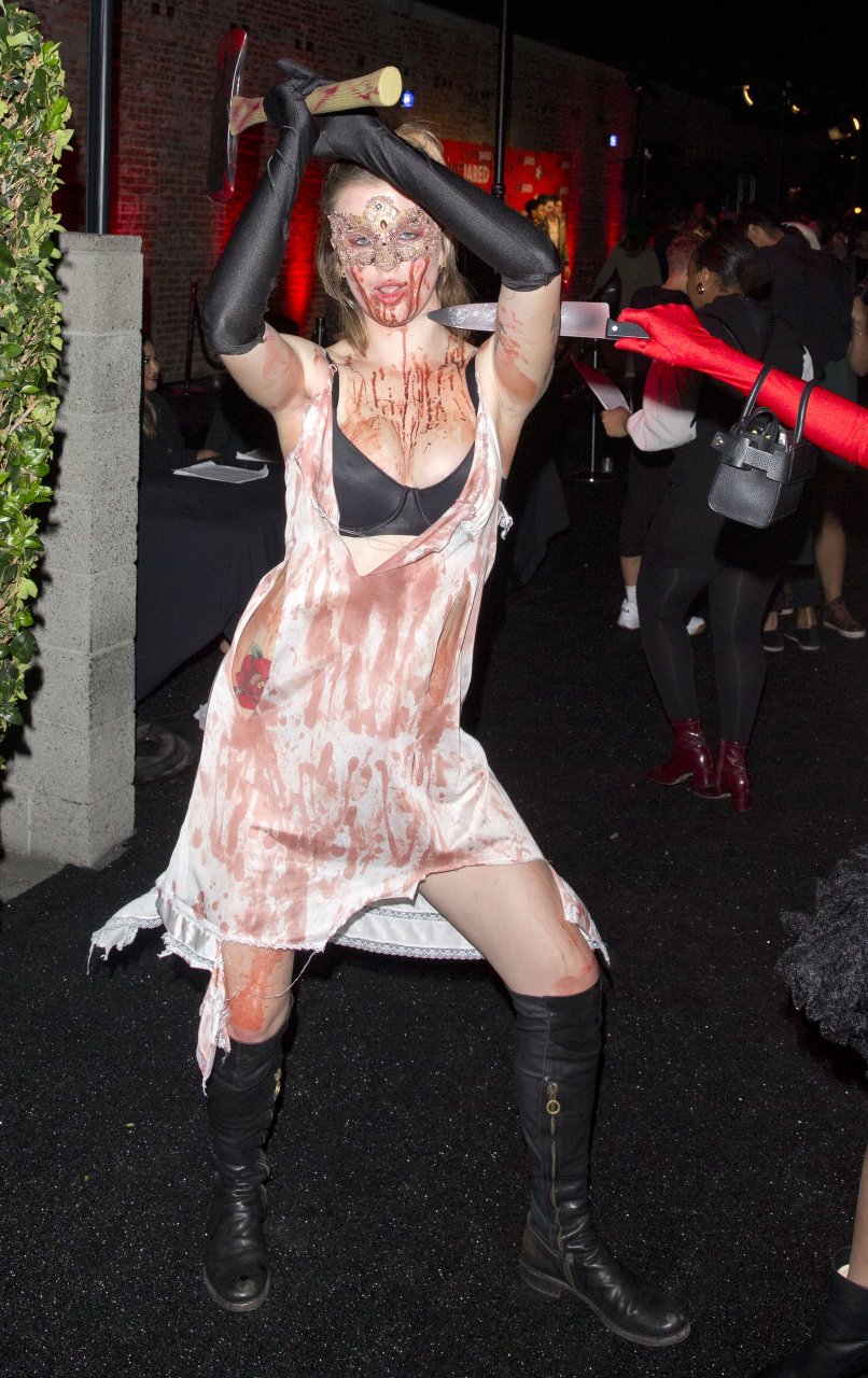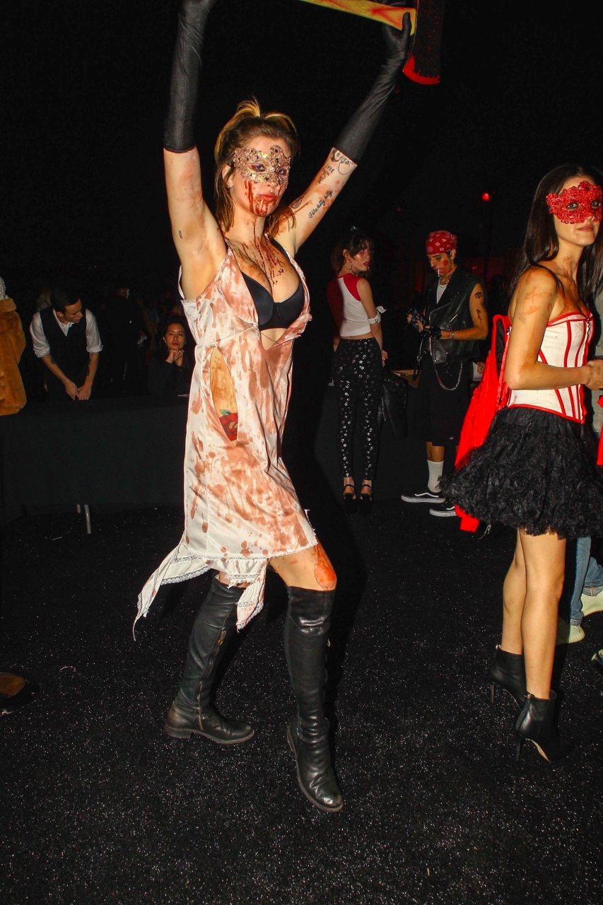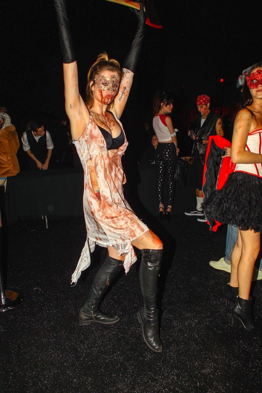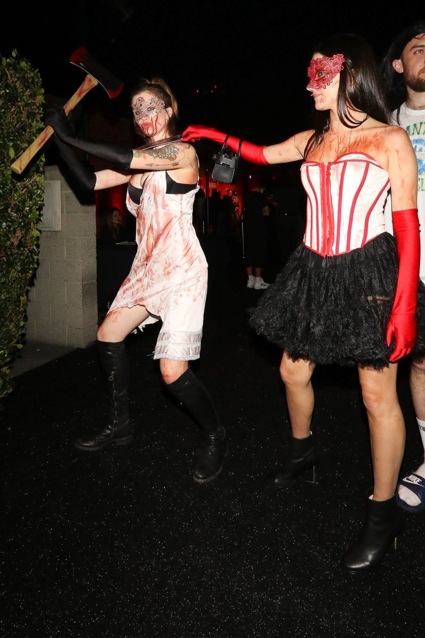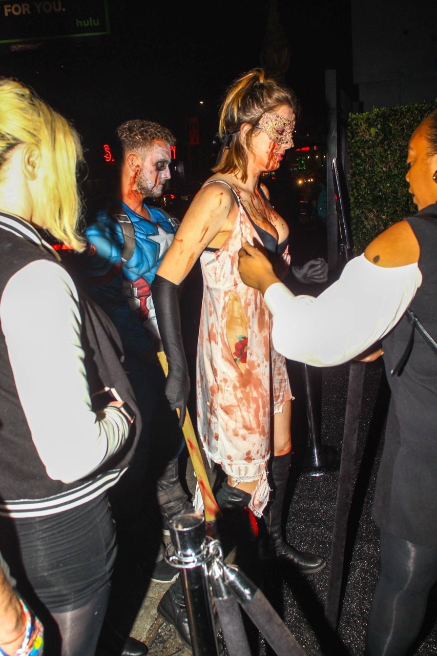La modelo Ireland Baldwin fue vista llegando a la fiesta de Halloween de Just Jared en West Hollywood, 28/10/2018. Ireland estaba disfrazada de asesina con hacha ensangrentada para Halloween.