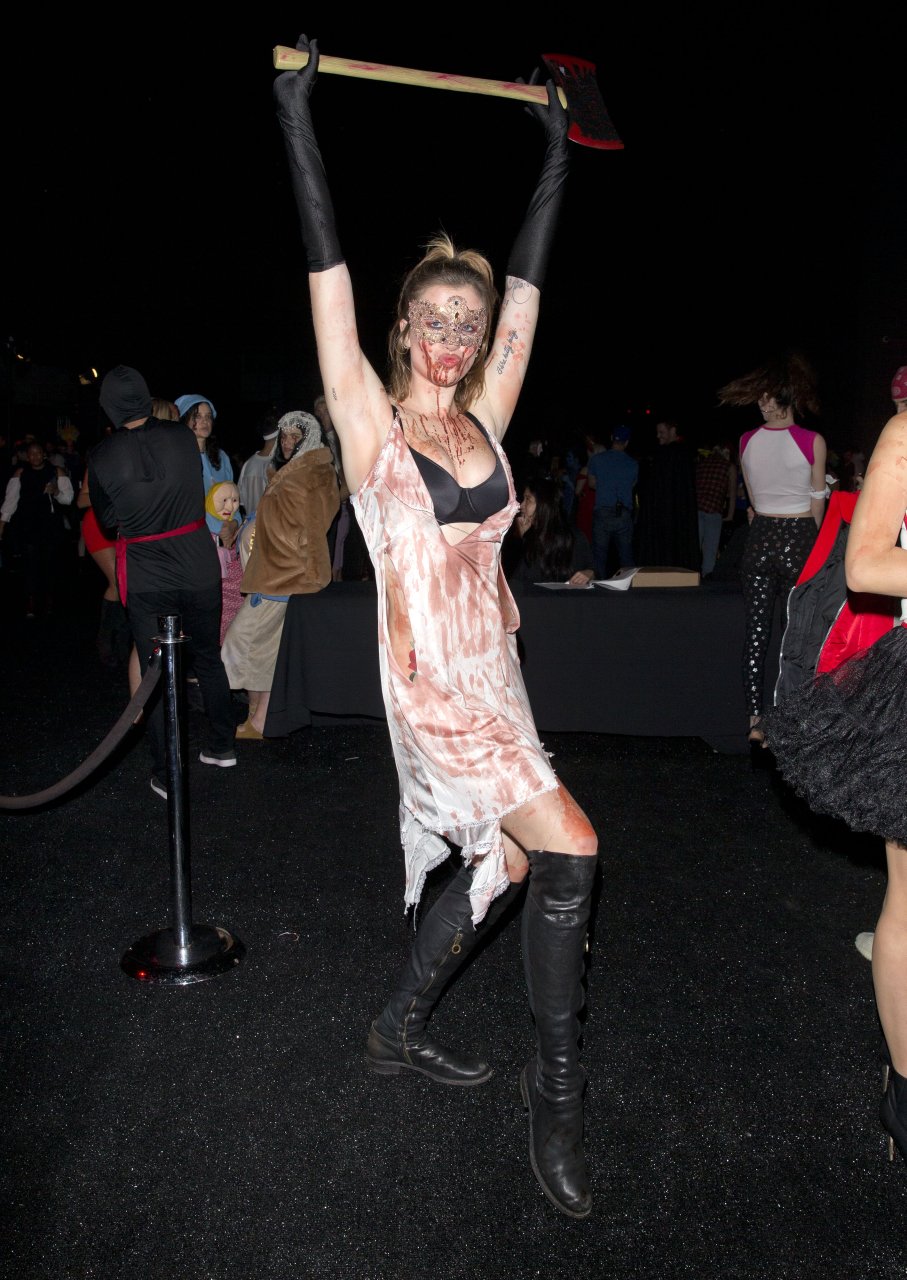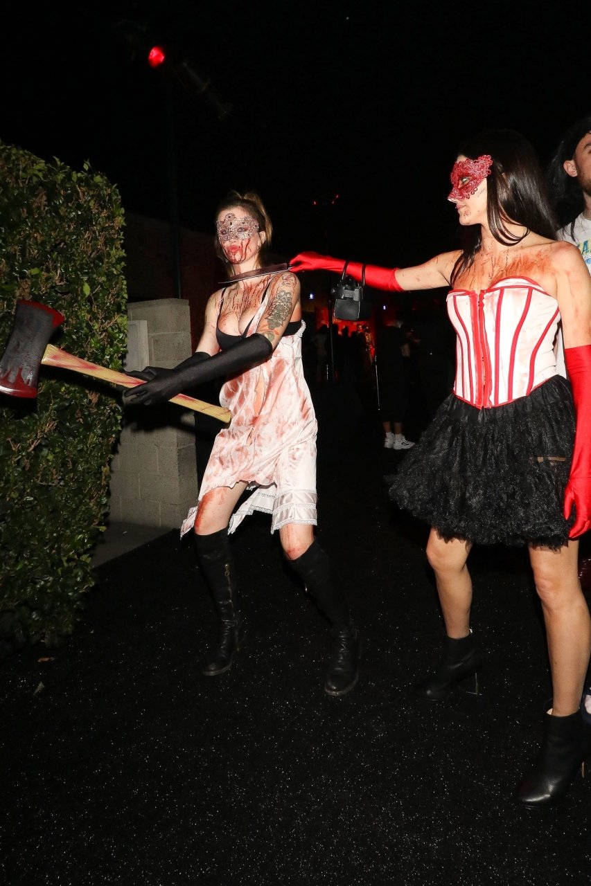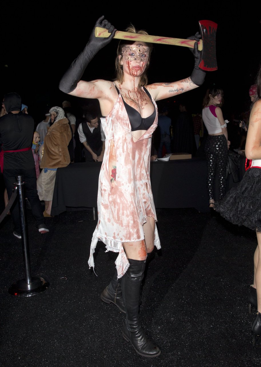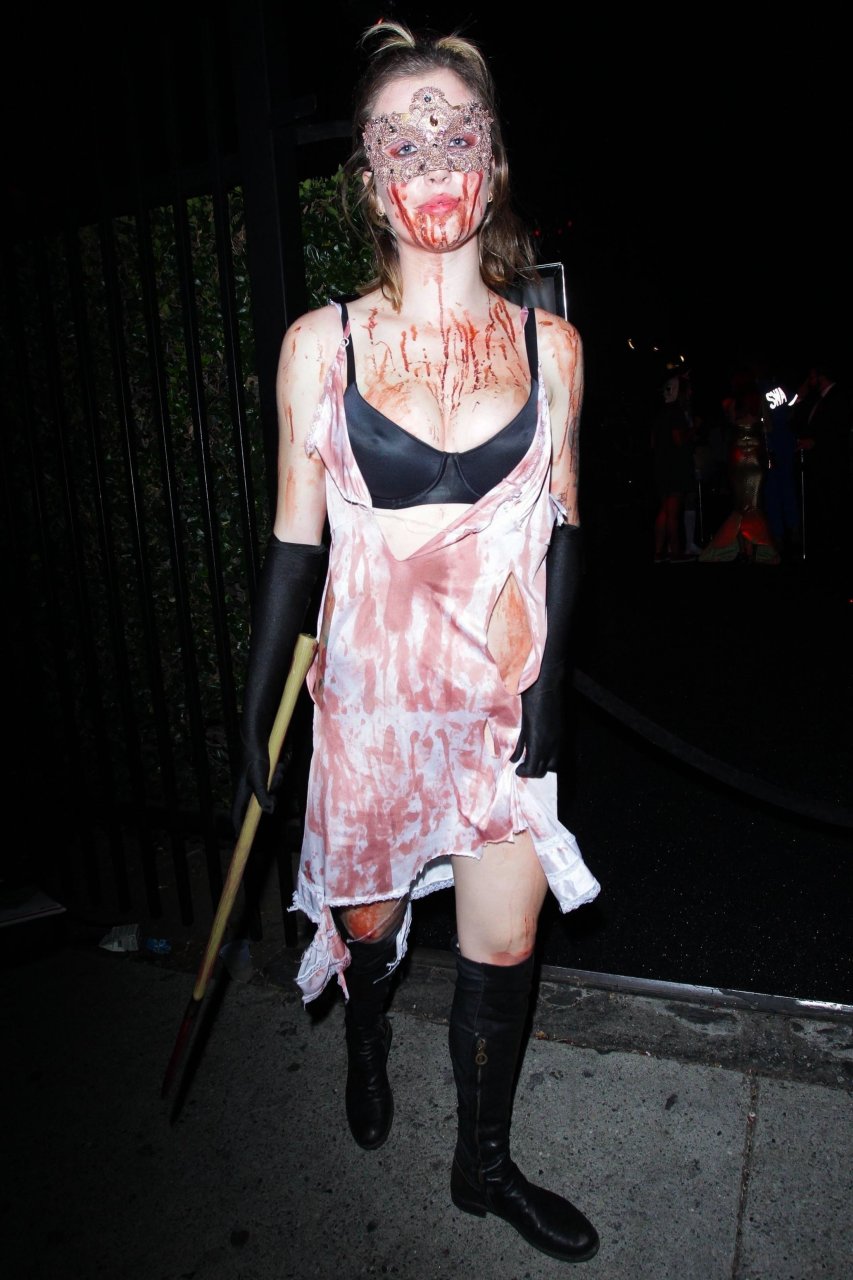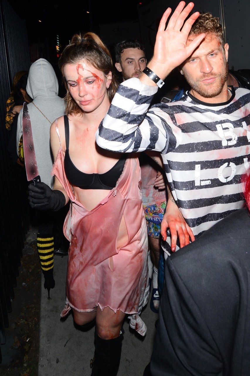 La modelo Ireland Baldwin fue vista llegando a la fiesta de Halloween de Just Jared en West Hollywood, 28/10/2018. Ireland estaba disfrazada de asesina con hacha ensangrentada para Halloween.