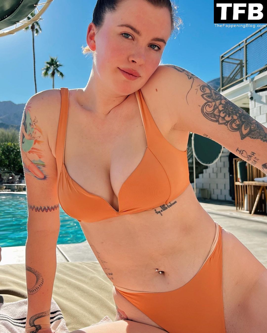 Model Ireland Baldwin muestra sus sexy pechos, posando en un bikini naranja en la piscina y rebotándolos para nosotros en el video de redes sociales a continuación (noviembre de 2021).
