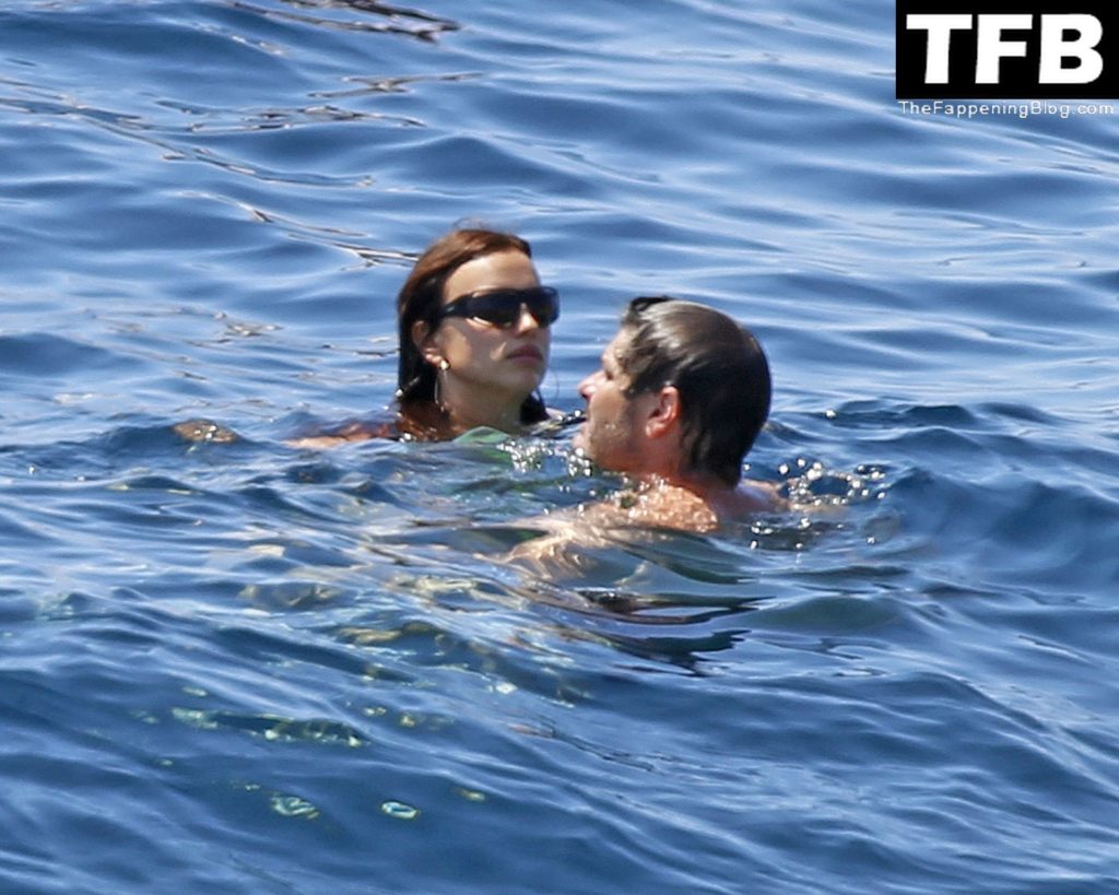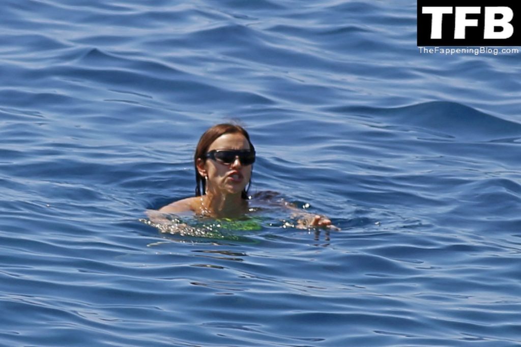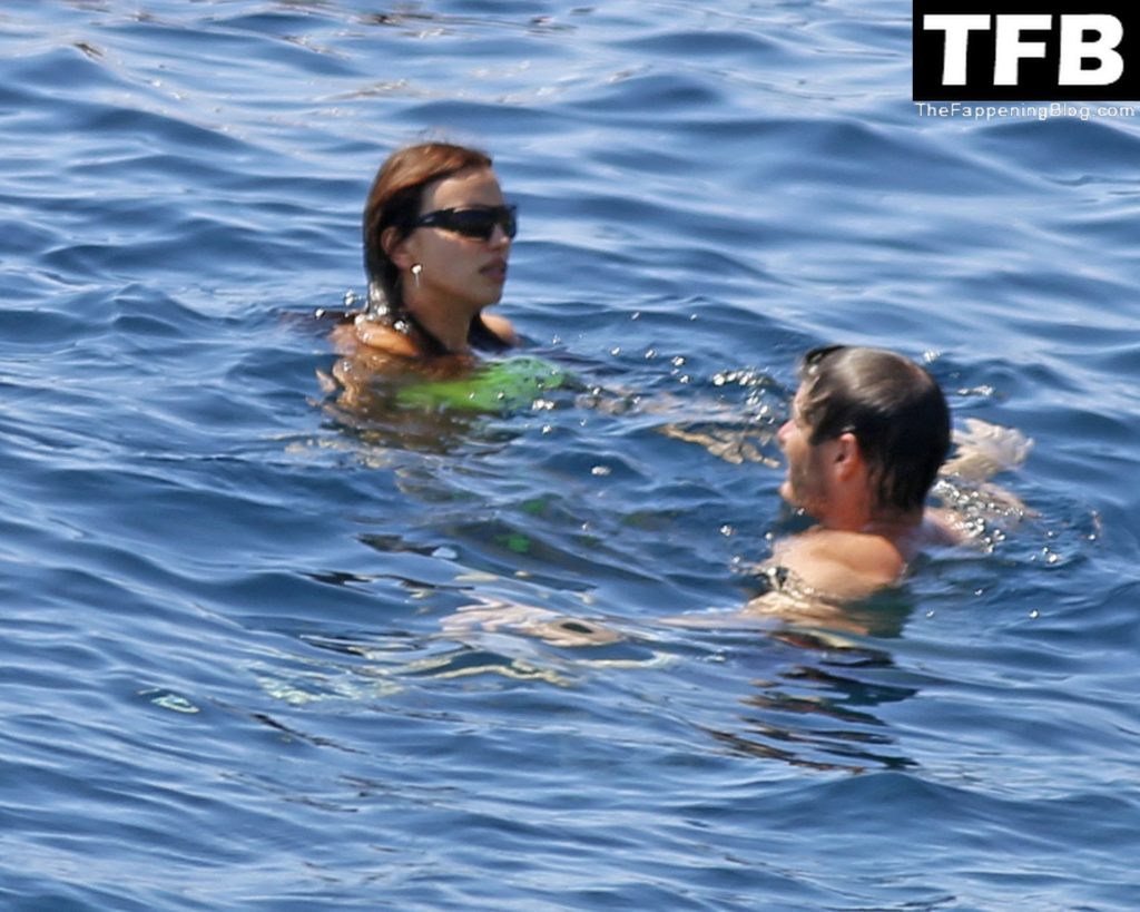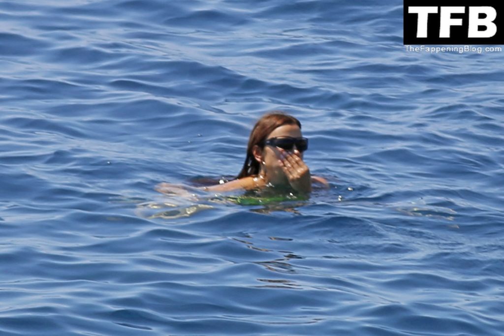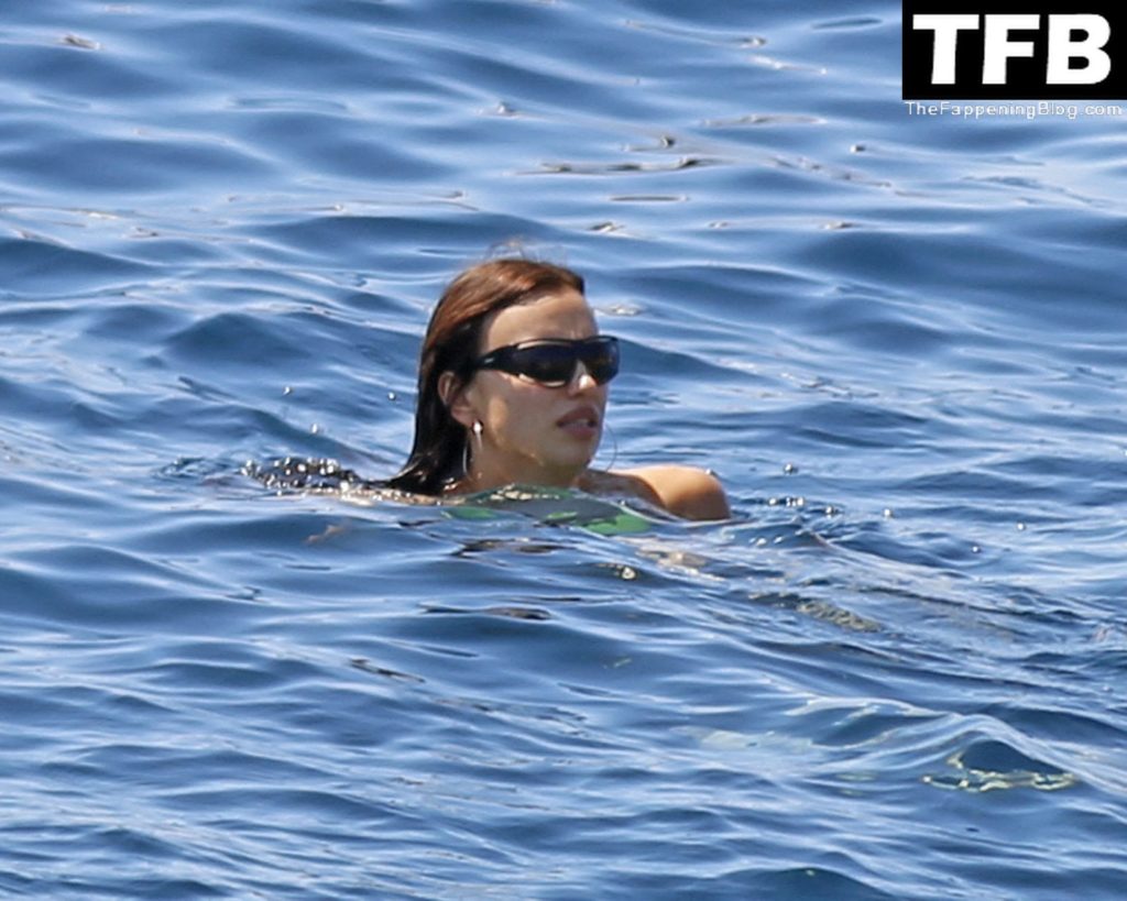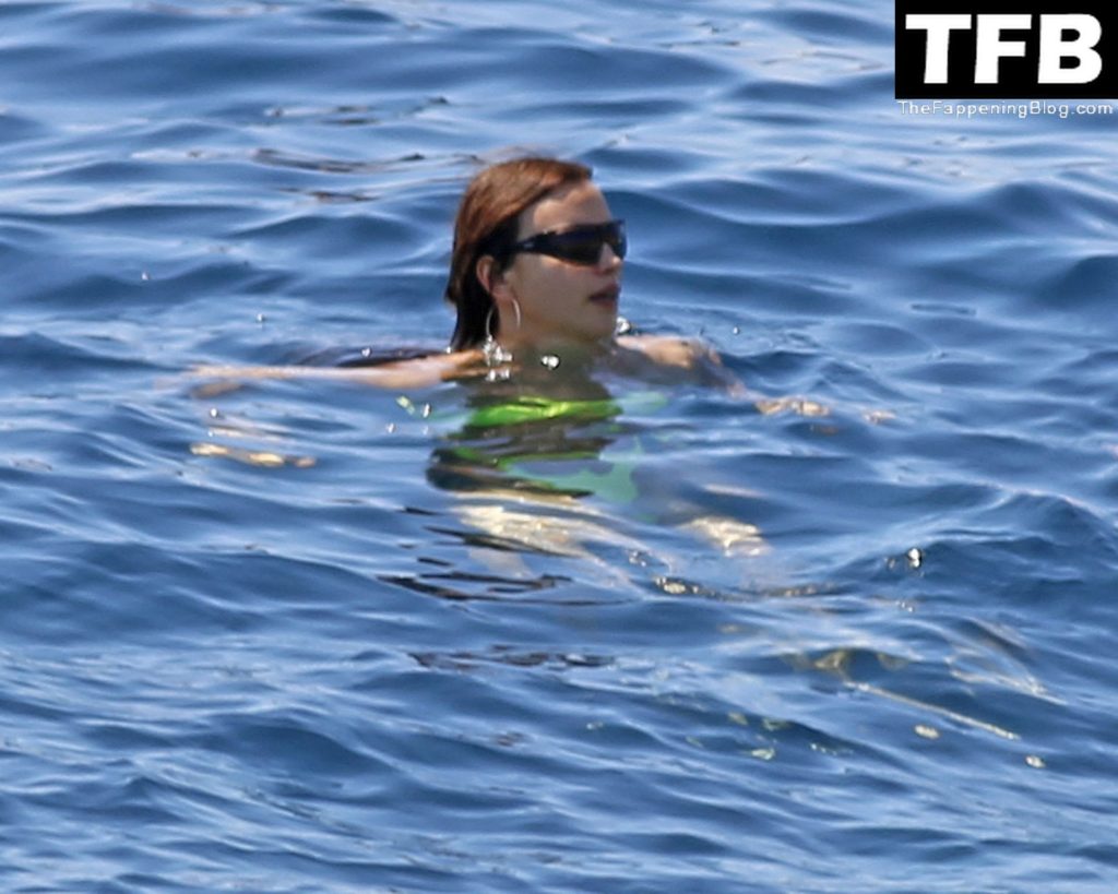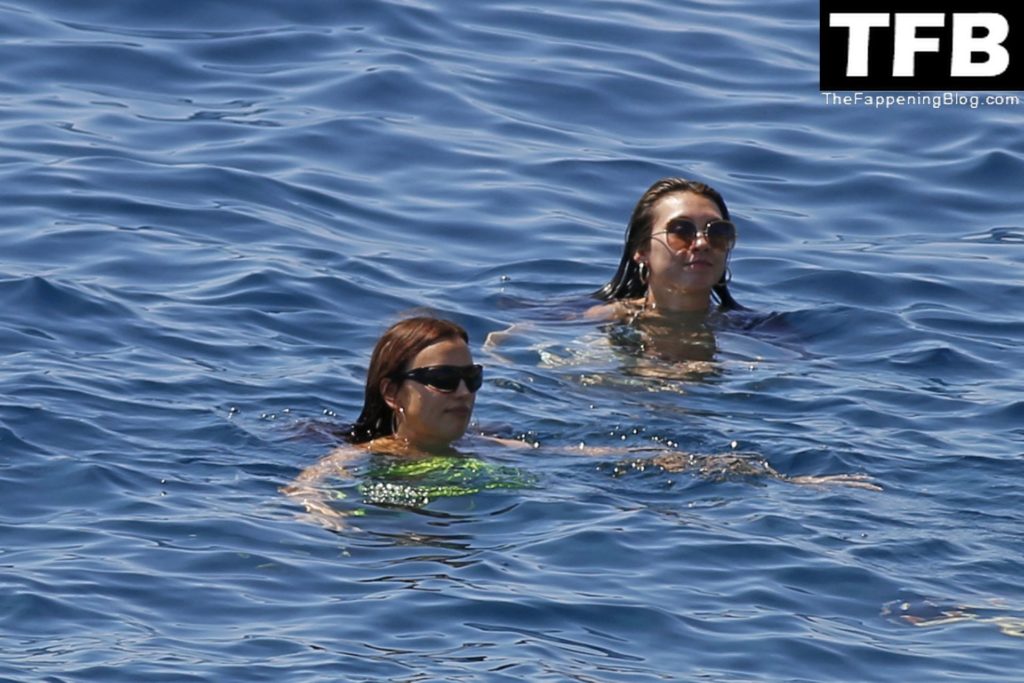 Irina Shayk se ve con un bikini verde en Ibiza mientras nada con un gran grupo de amigos que celebraban el cumpleaños del amigo Riccardo Tisci en el resort hotel Six Senses, 08/04/2022.