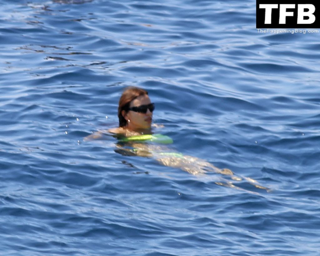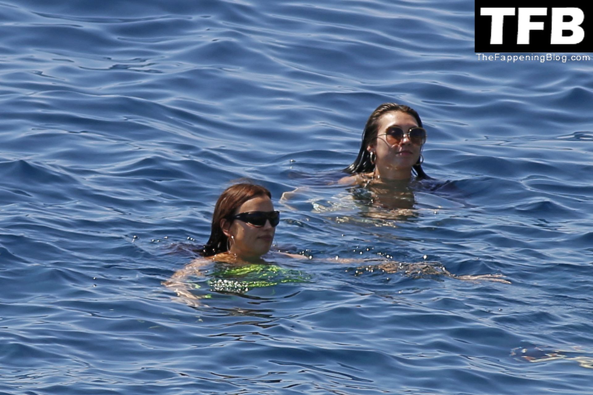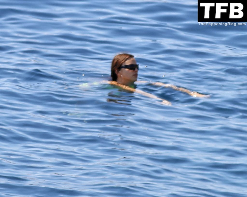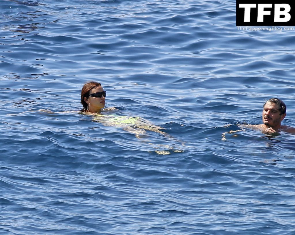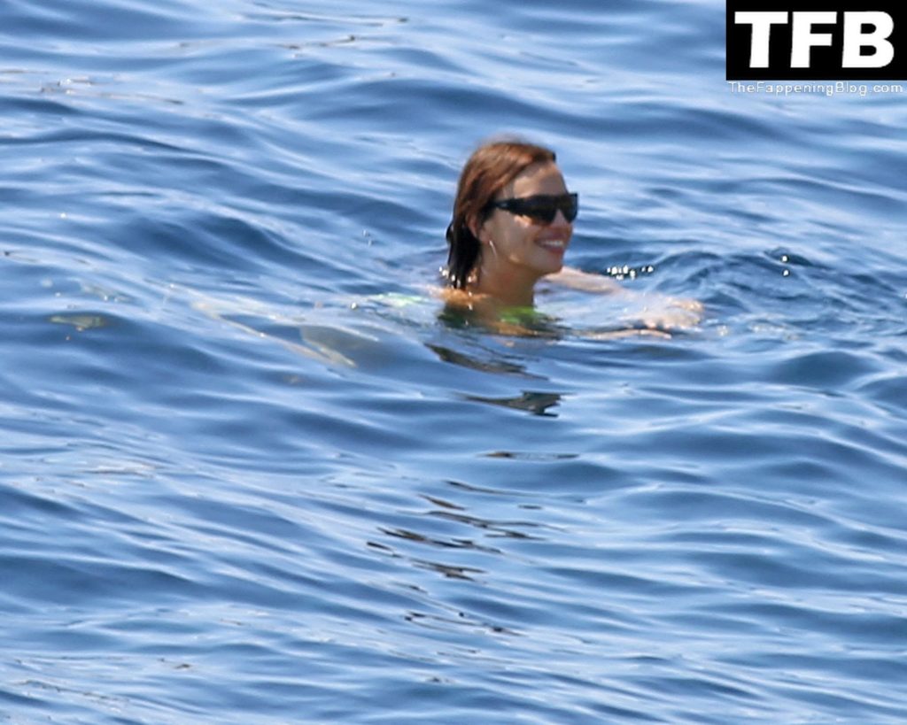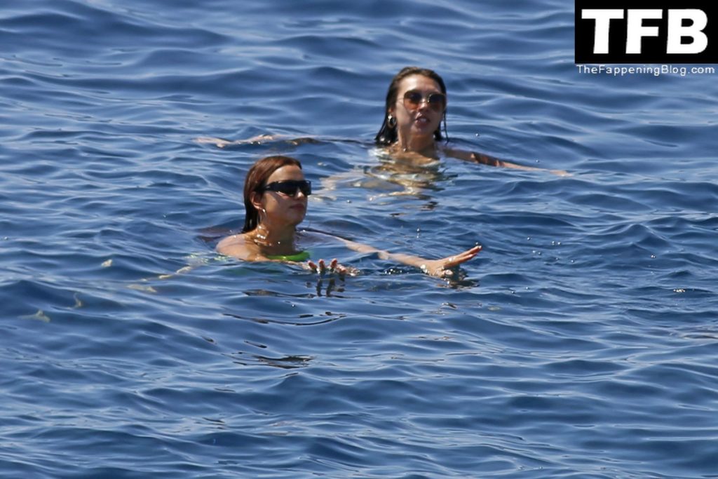 Irina Shayk se ve con un bikini verde en Ibiza mientras nada con un gran grupo de amigos que celebraban el cumpleaños del amigo Riccardo Tisci en el resort hotel Six Senses, 08/04/2022.