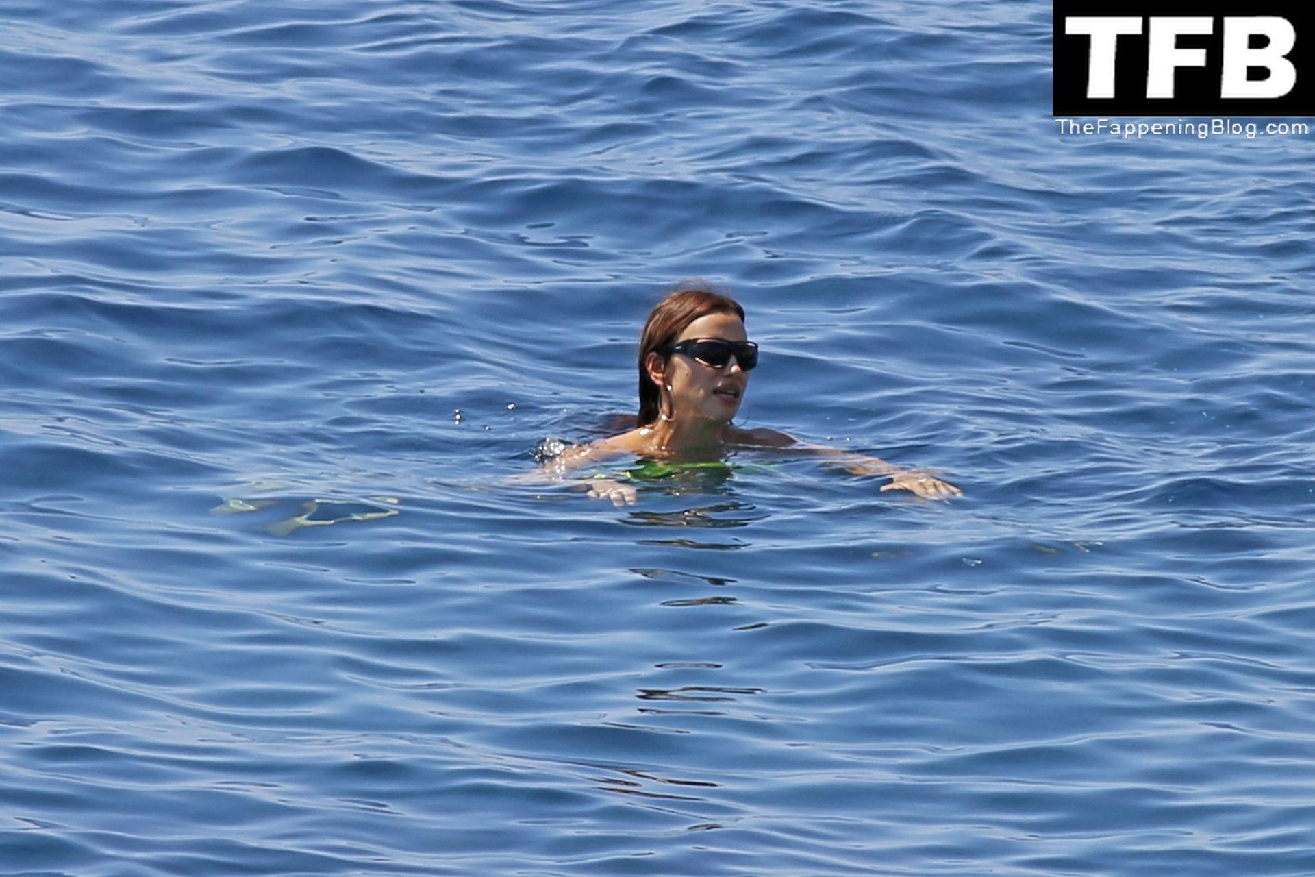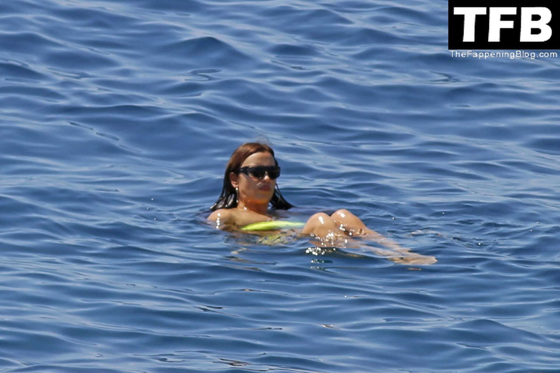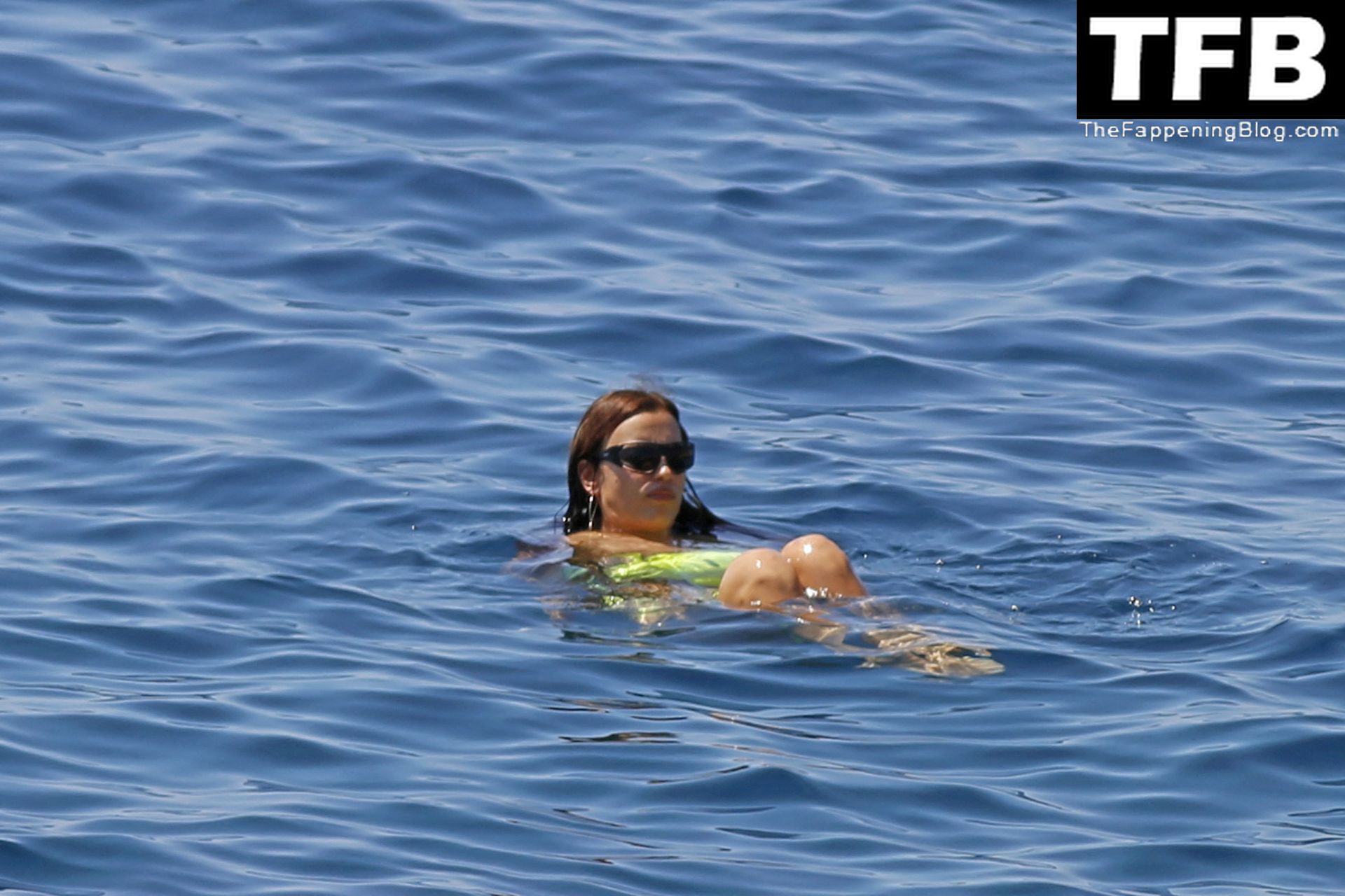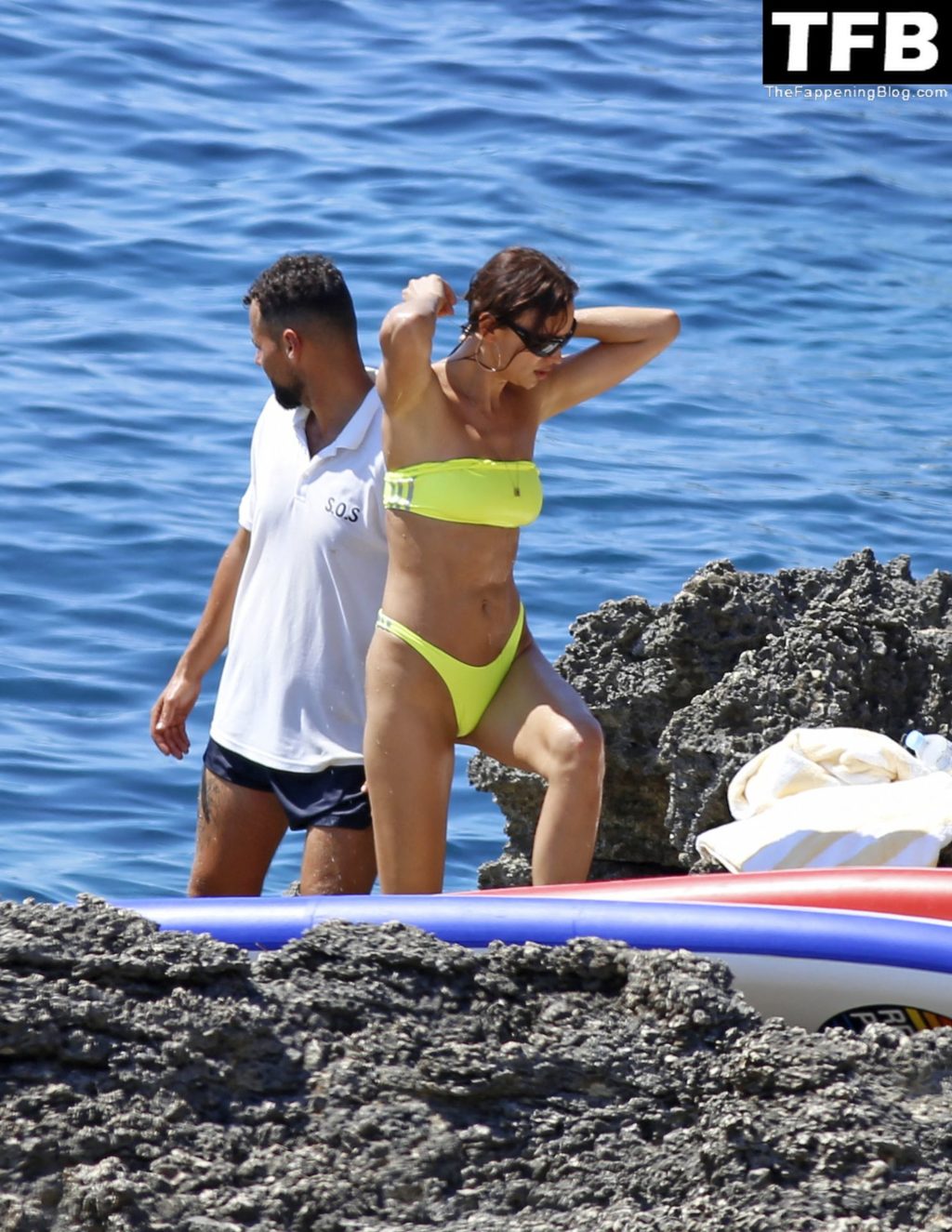 Irina Shayk se ve con un bikini verde en Ibiza mientras nada con un gran grupo de amigos que celebraban el cumpleaños del amigo Riccardo Tisci en el resort hotel Six Senses, 08/04/2022.