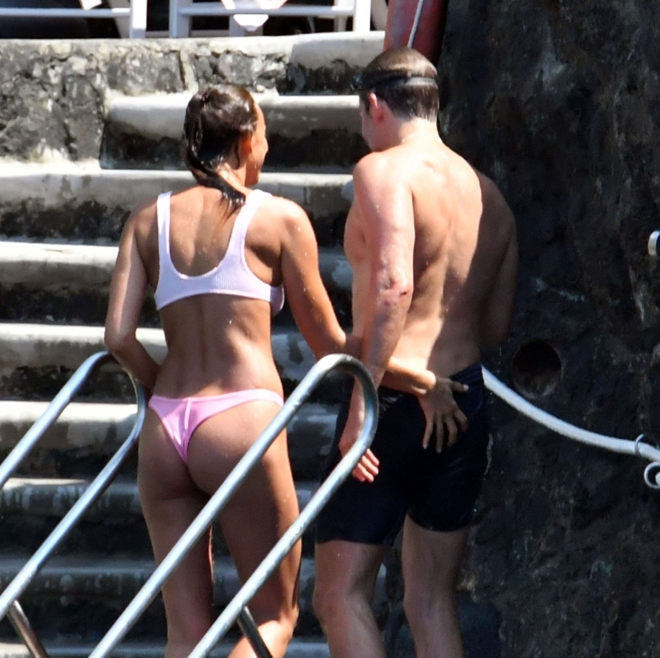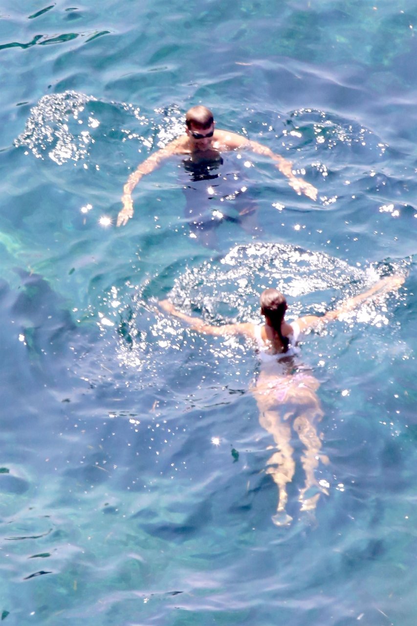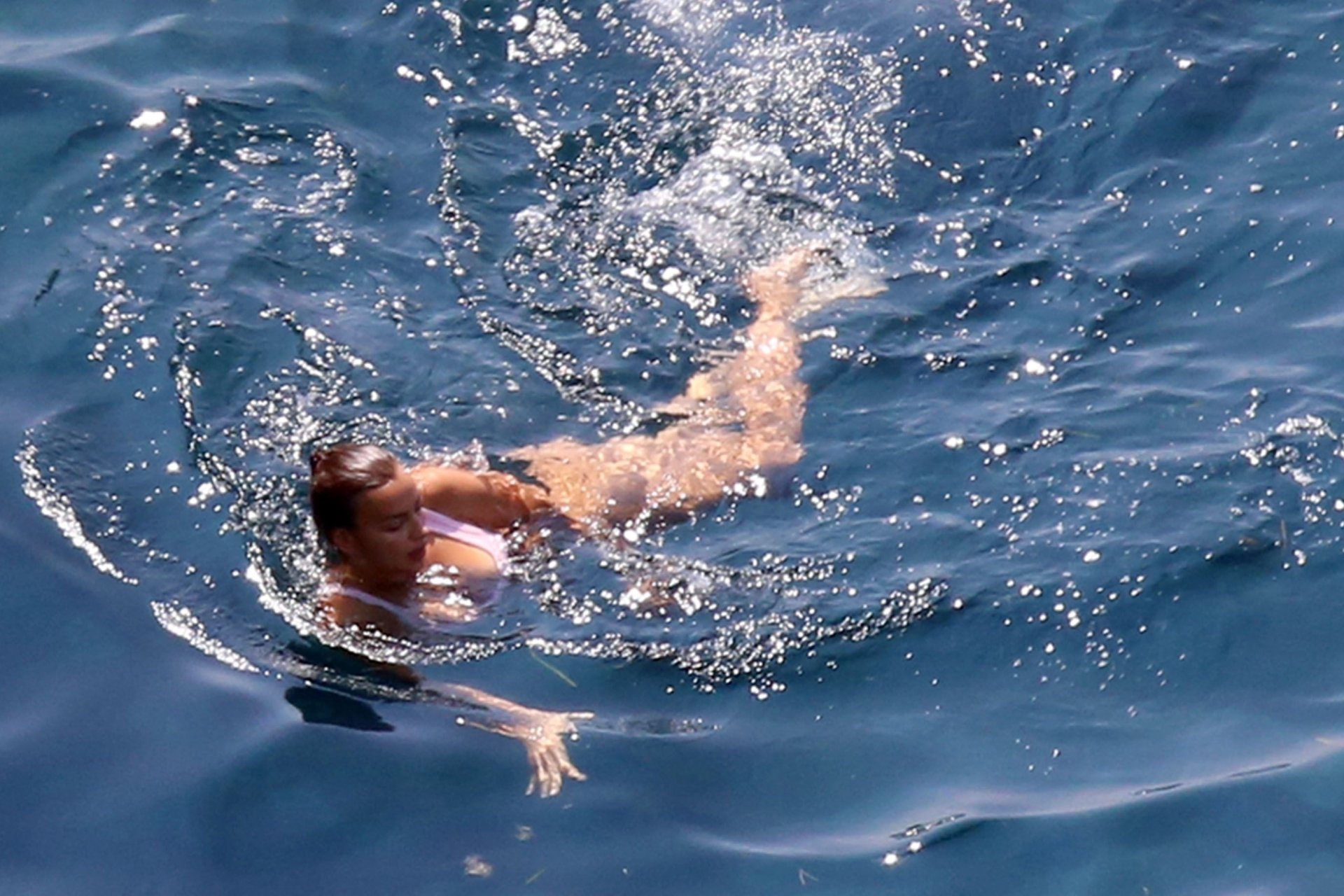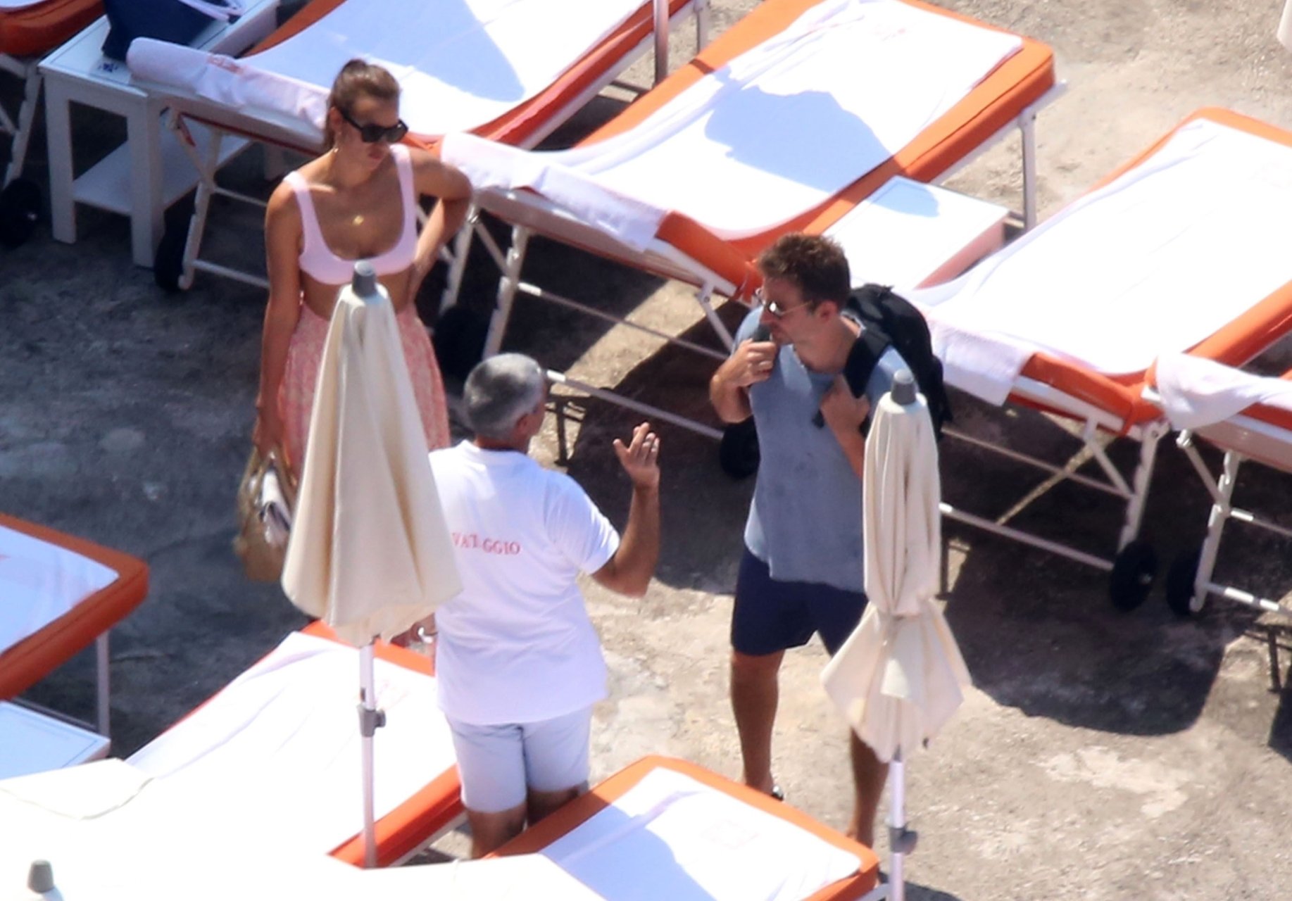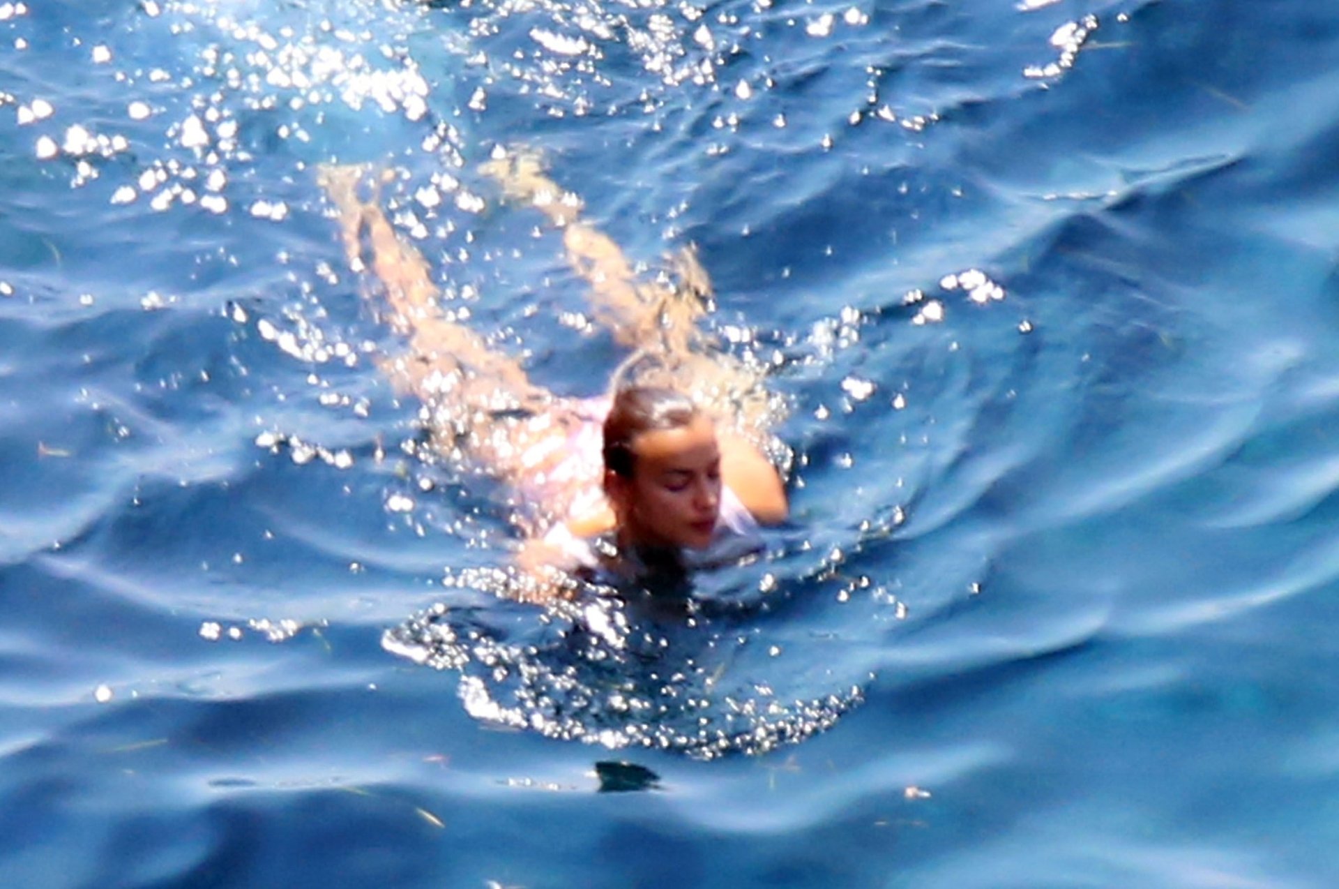 La feliz pareja fue vista nadando juntos en el mar azul turquesa antes de tomar el sol juntos disfrutando del sol. En un momento, Irina juguetonamente toca el trasero de Bradley, lo cual él encontró divertido.