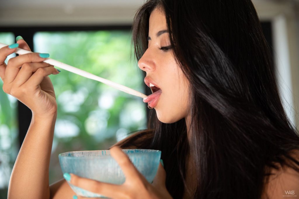 La encantadora modelo Iris Lucky posa desnuda en la cocina, pero no para preparar la cena, sino para quitarse hermosamente su lencería erótica y verter leche sobre su sabrosa pussy en una nueva sesión de fotos (2021).