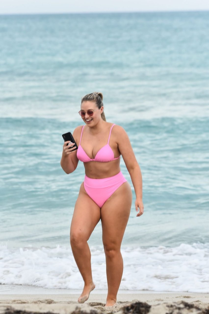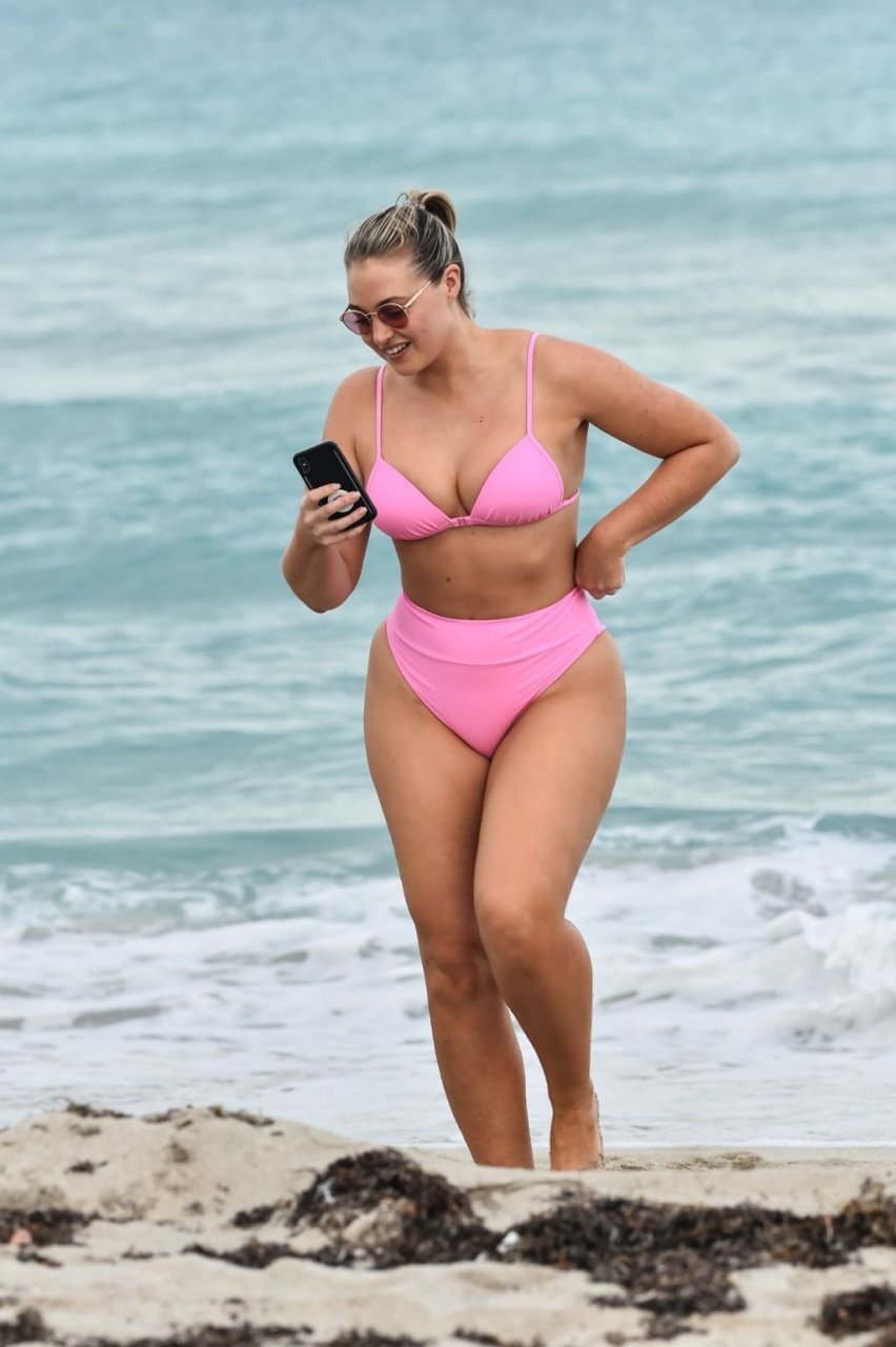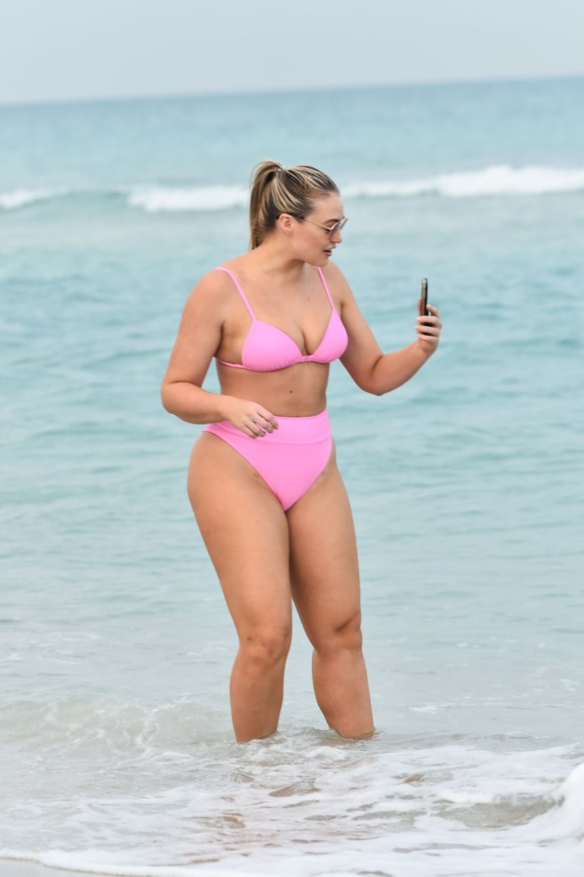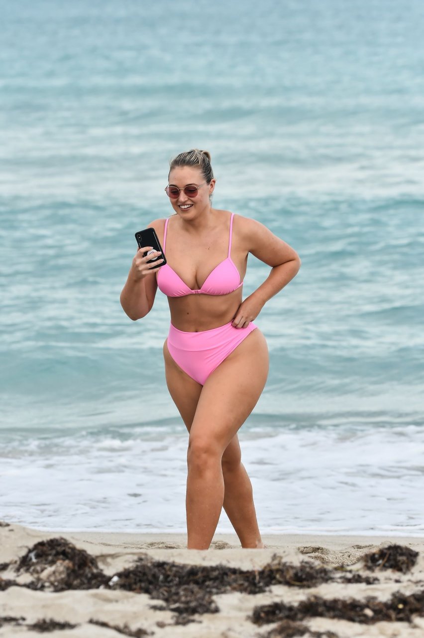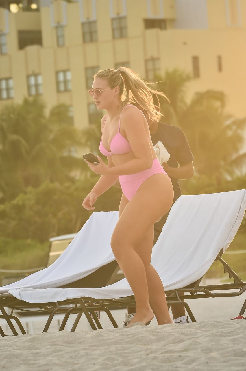 La modelo Iskra Lawrence muestra sus curvas en la playa con un bikini rosa en Miami, 12/09/2018. Iskra se ve genial mientras disfruta de su día en la playa.