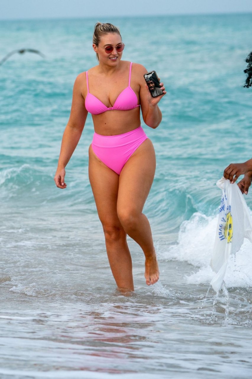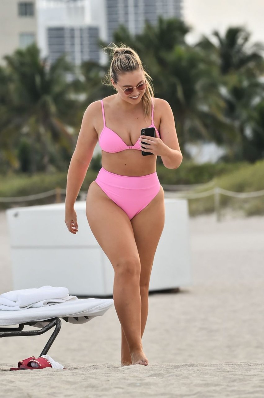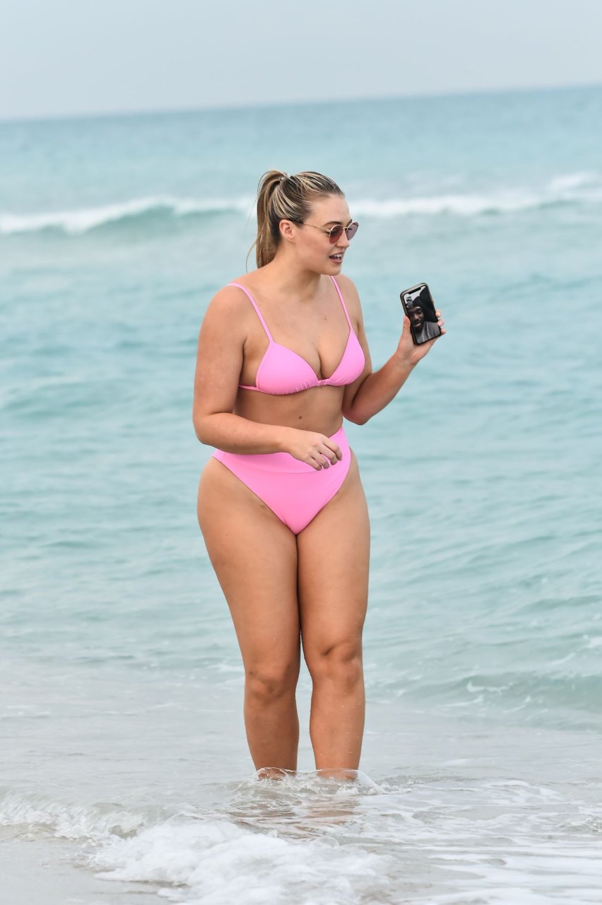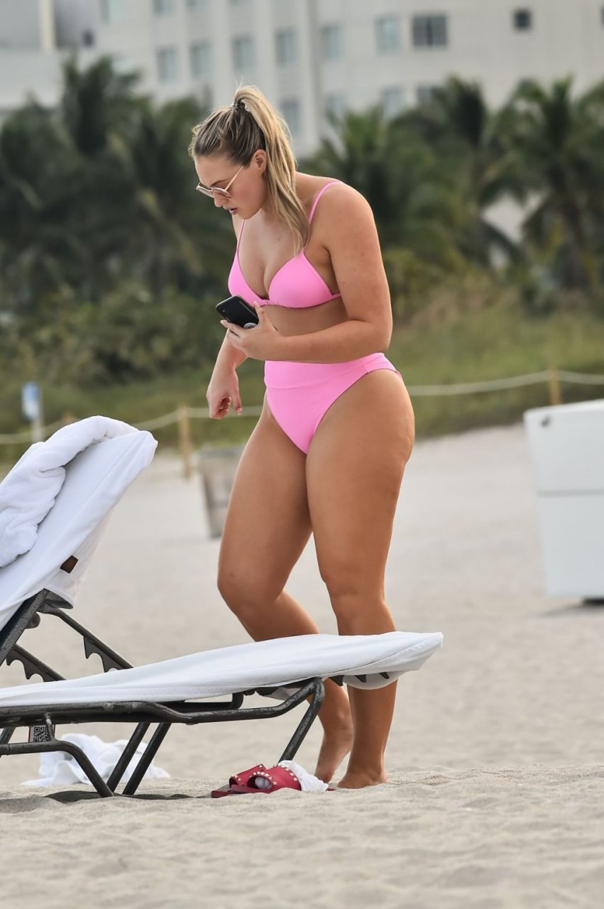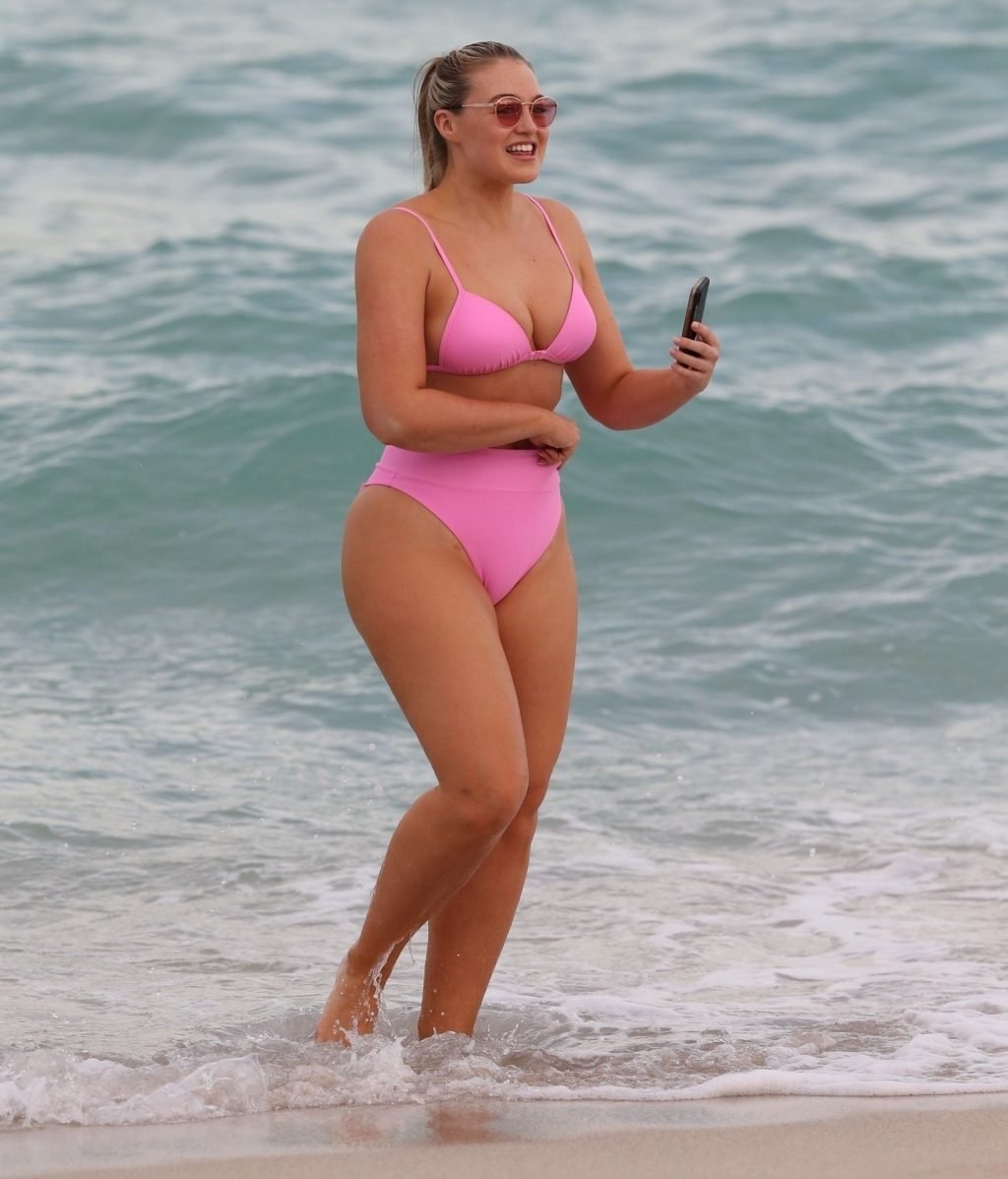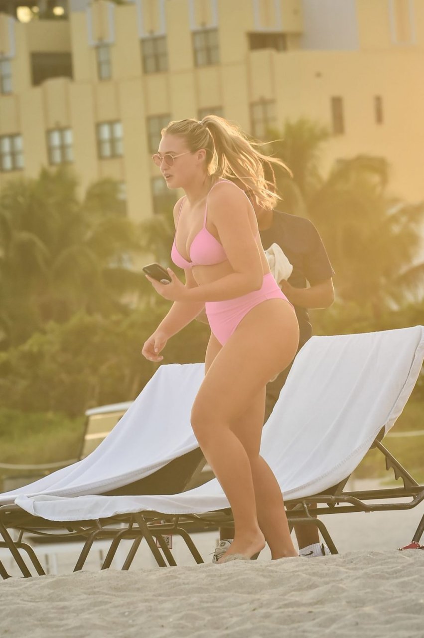 La modelo Iskra Lawrence muestra sus curvas en la playa con un bikini rosa en Miami, 12/09/2018. Iskra se ve genial mientras disfruta de su día en la playa.
