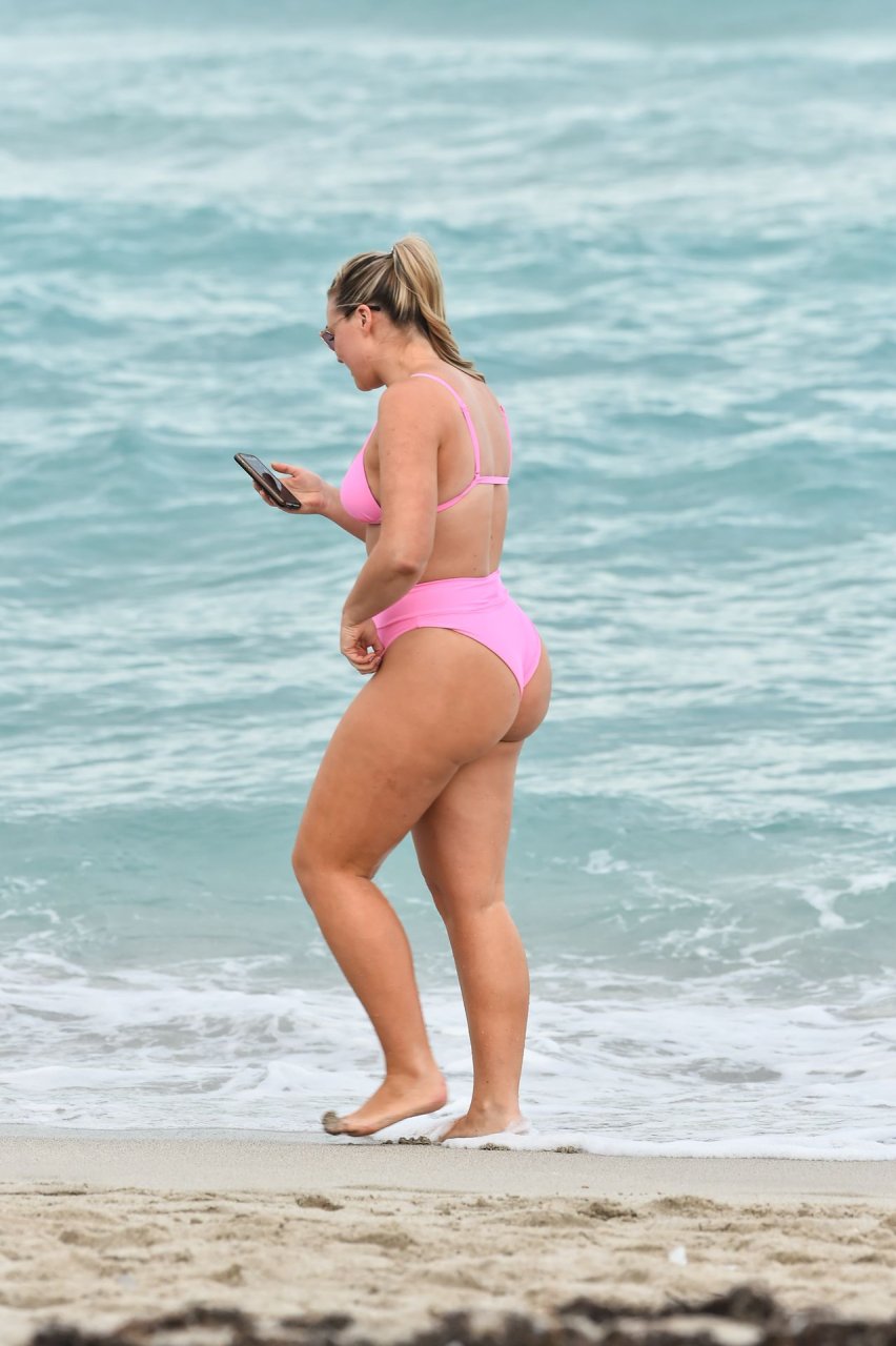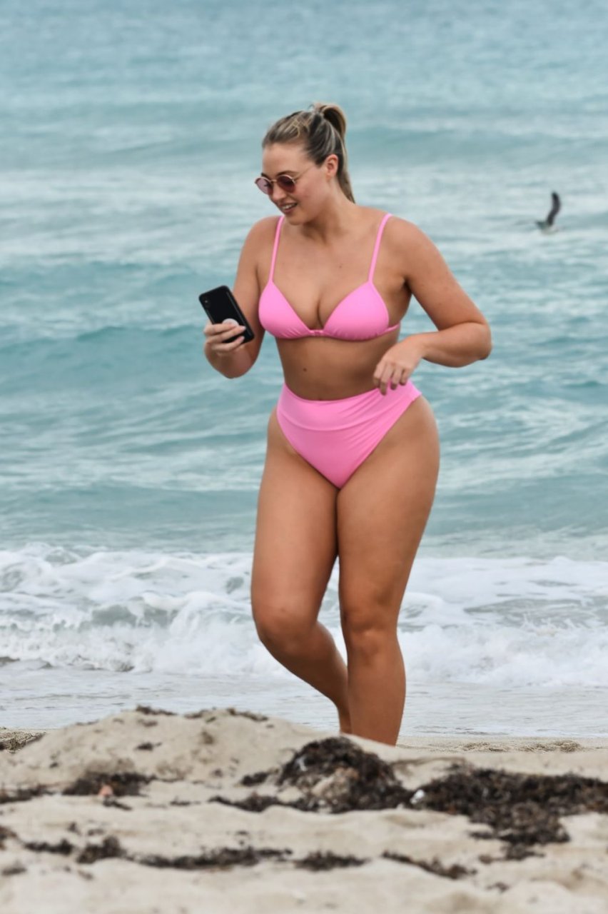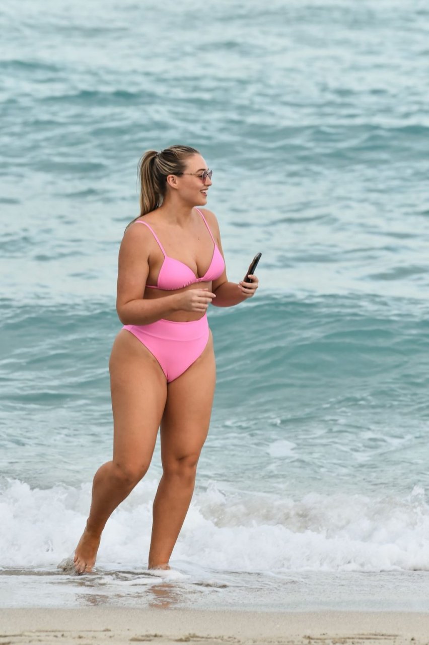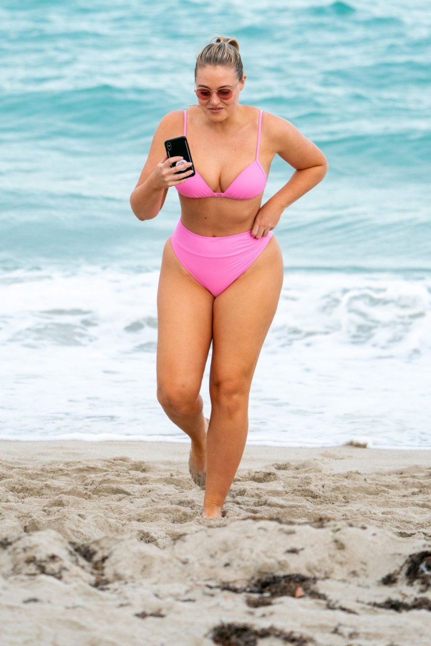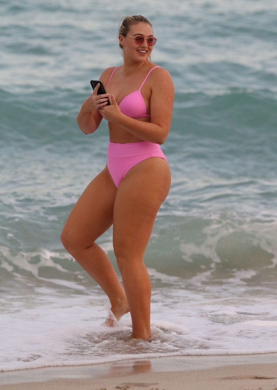 La modelo Iskra Lawrence muestra sus curvas en la playa con un bikini rosa en Miami, 12/09/2018. Iskra se ve genial mientras disfruta de su día en la playa.