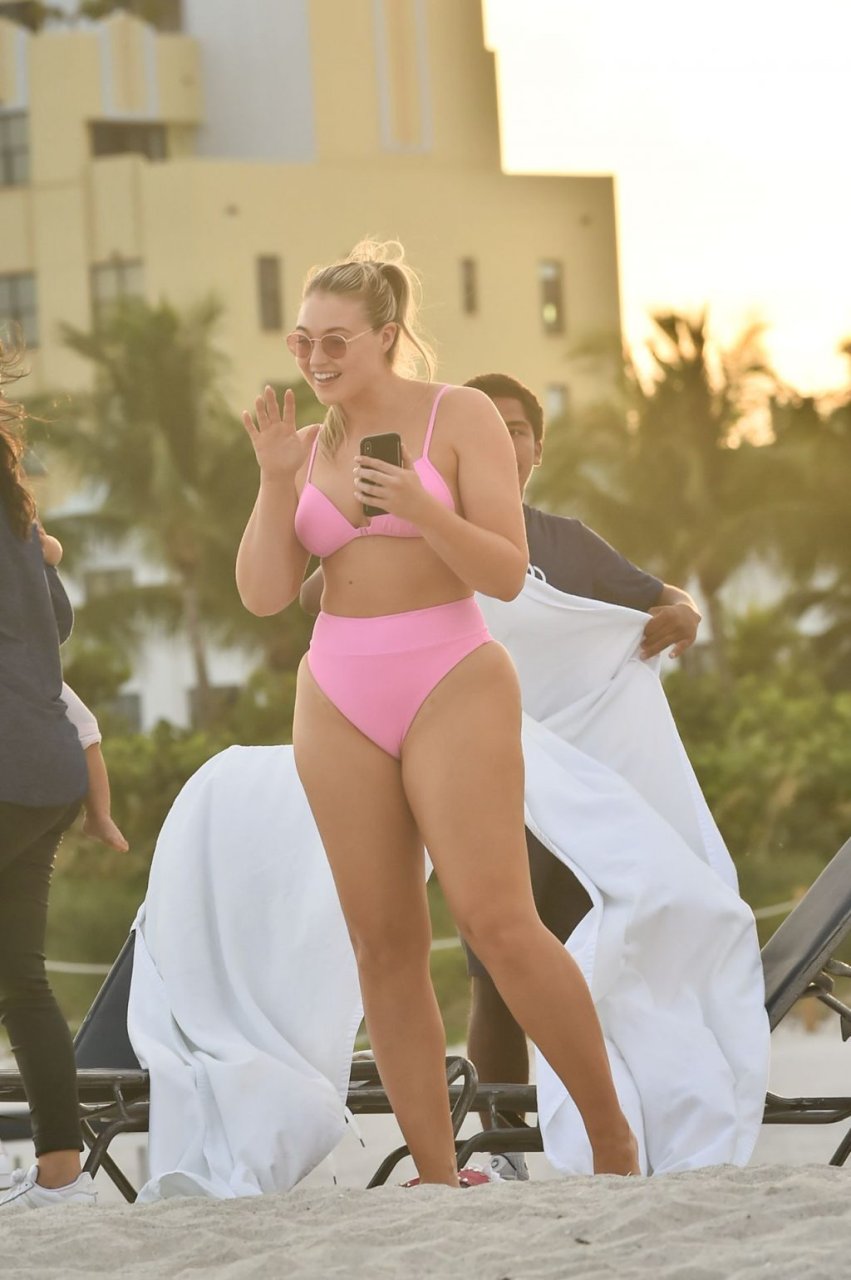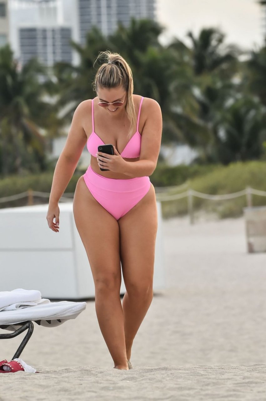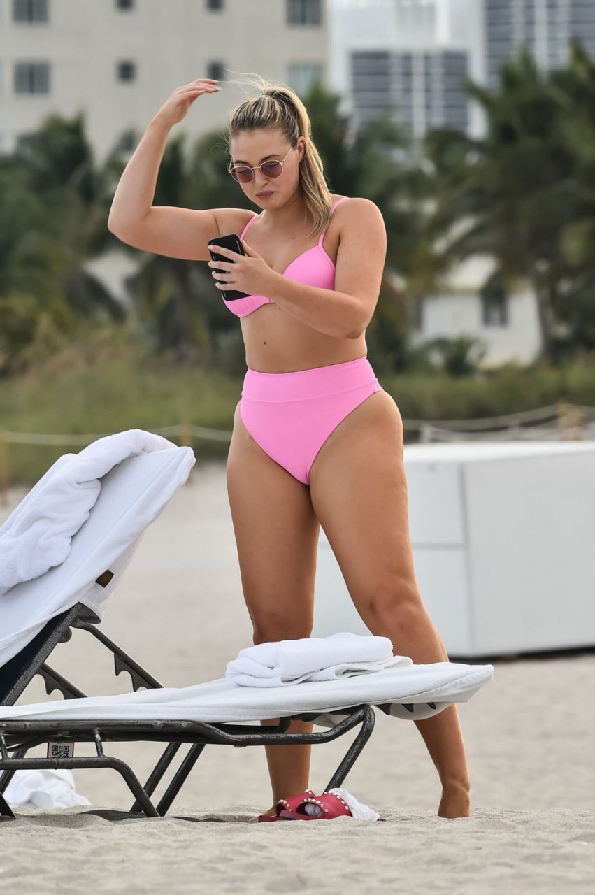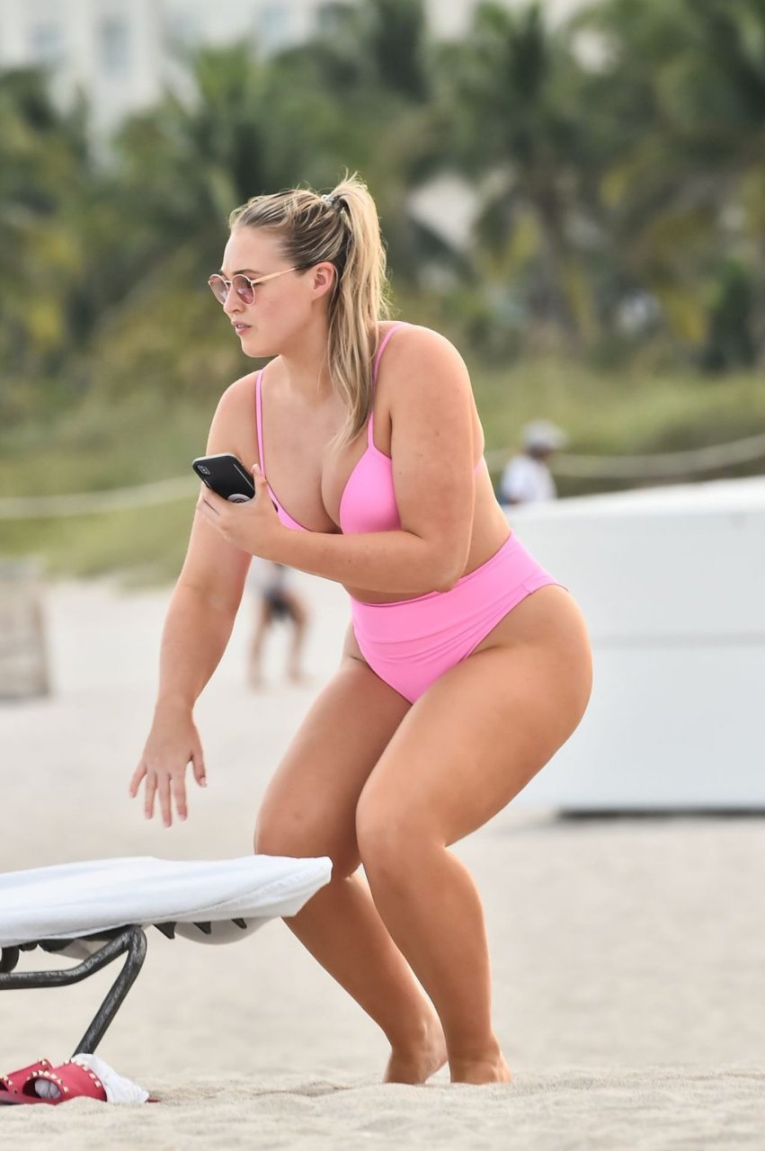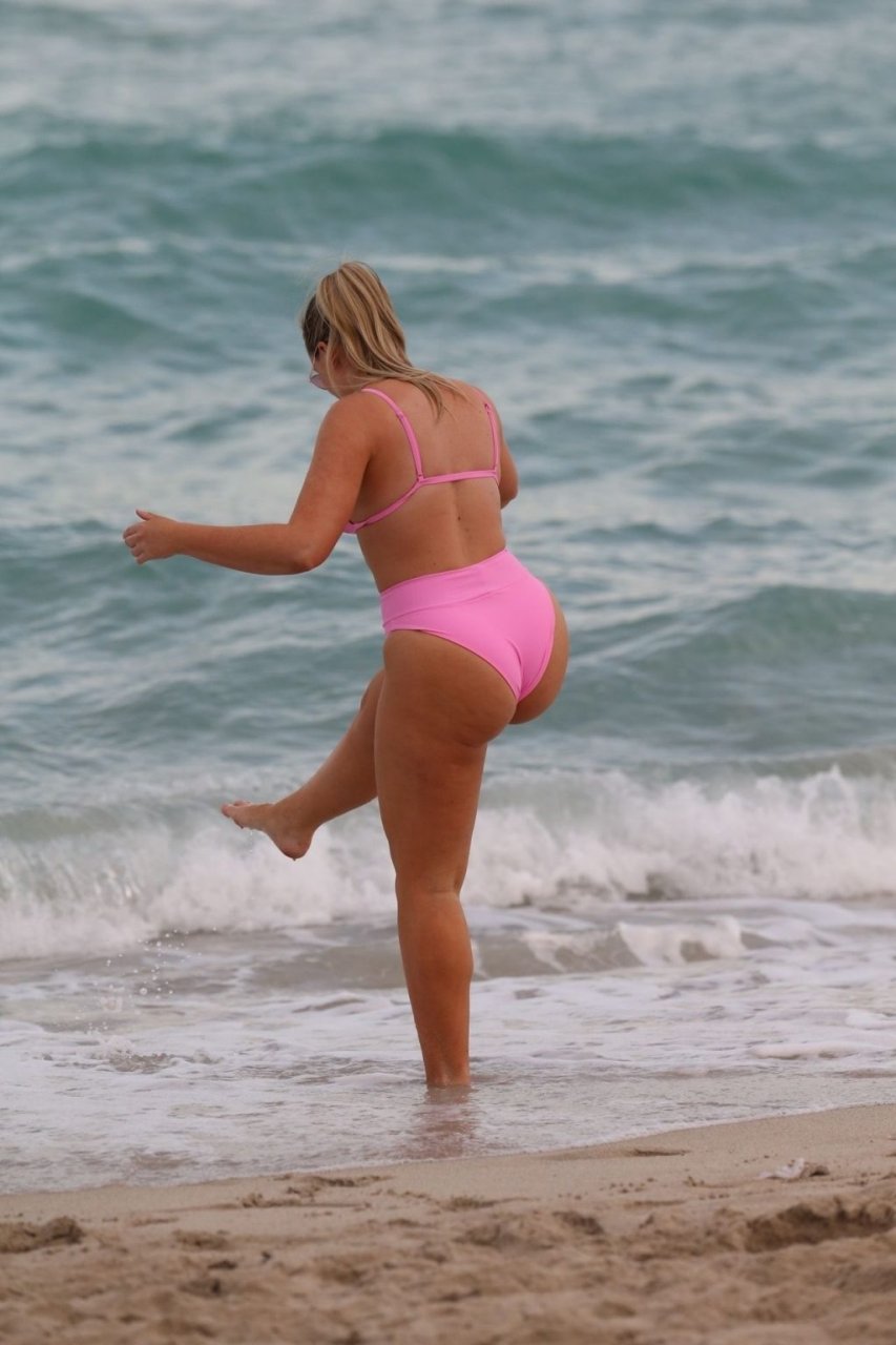 La modelo Iskra Lawrence muestra sus curvas en la playa con un bikini rosa en Miami, 12/09/2018. Iskra se ve genial mientras disfruta de su día en la playa.