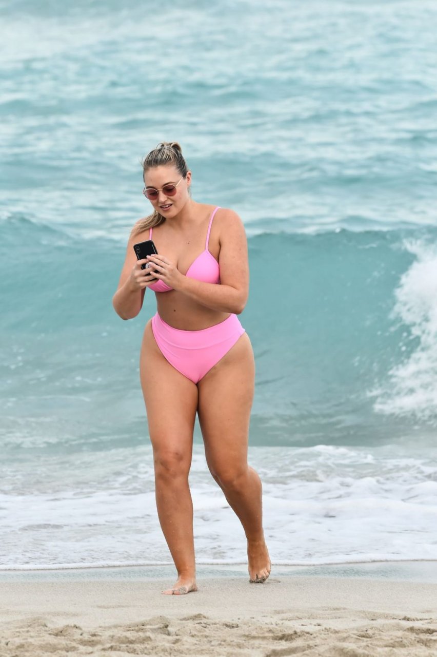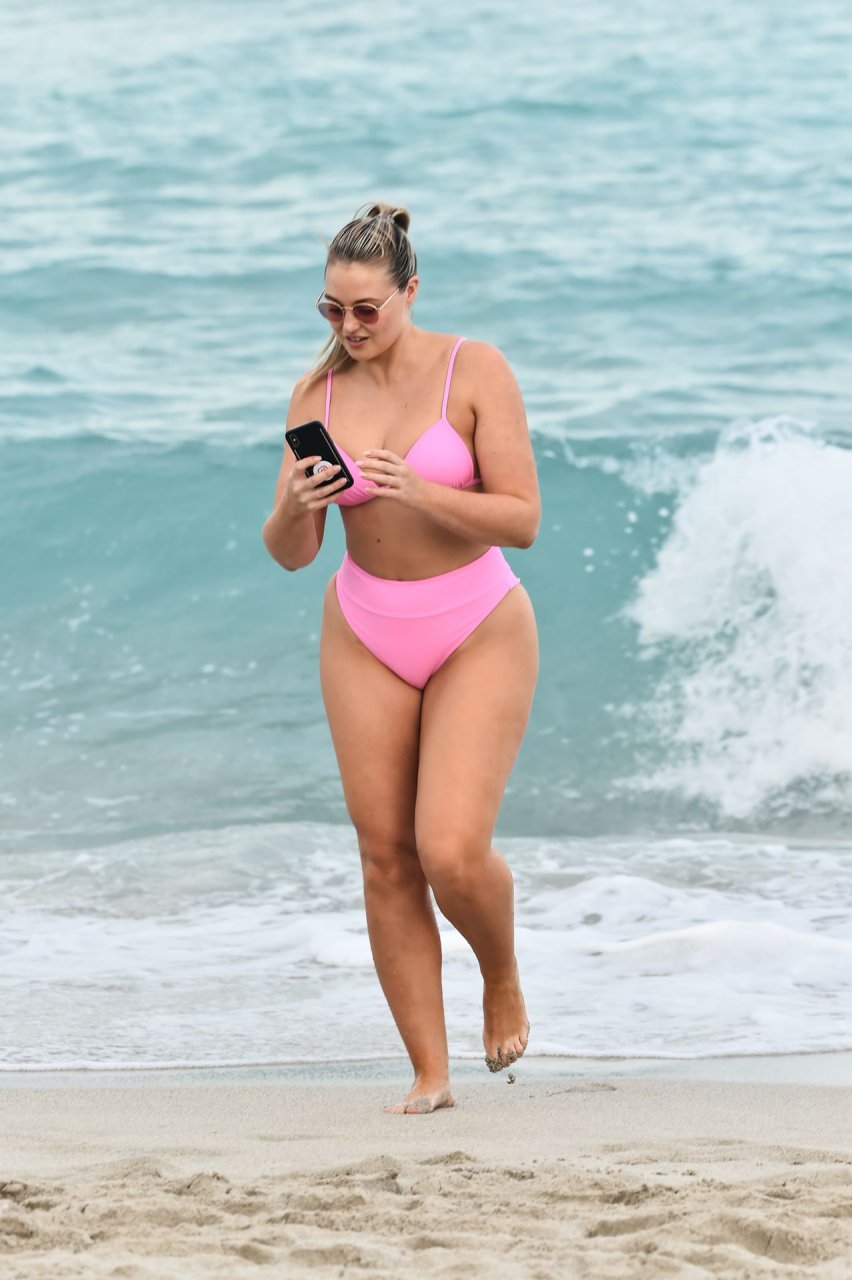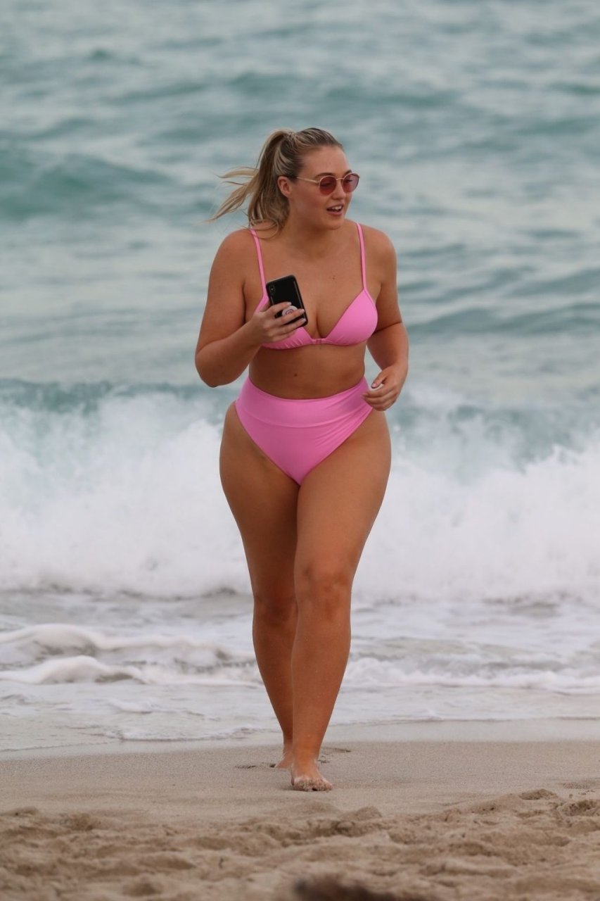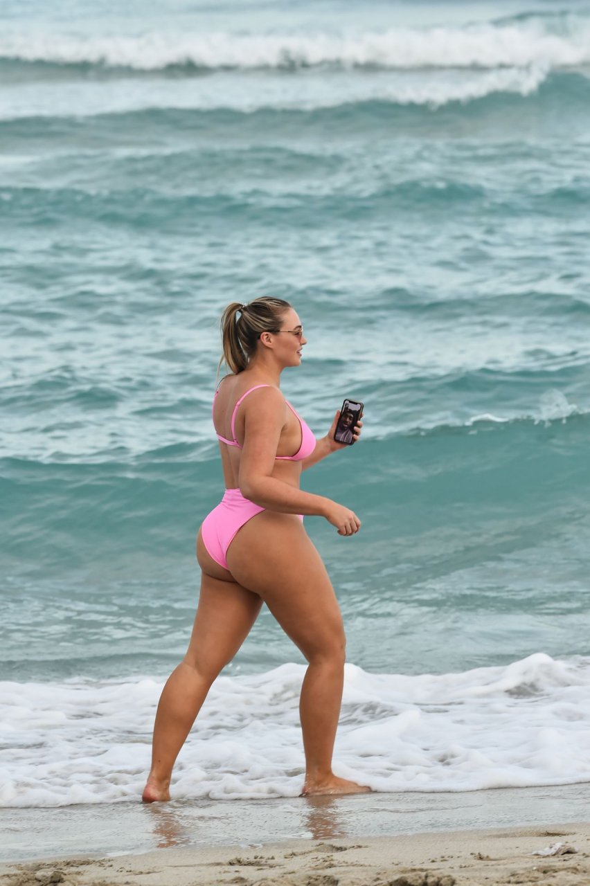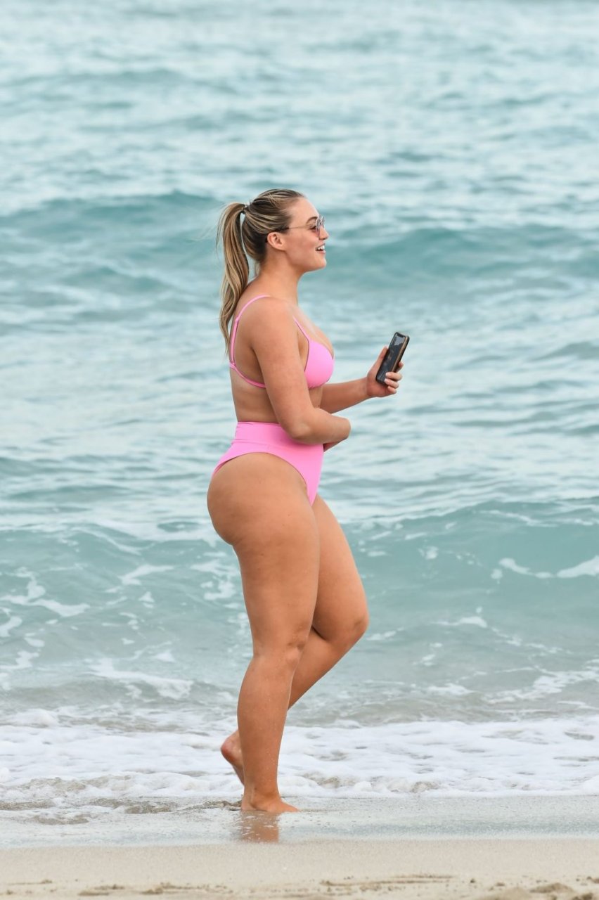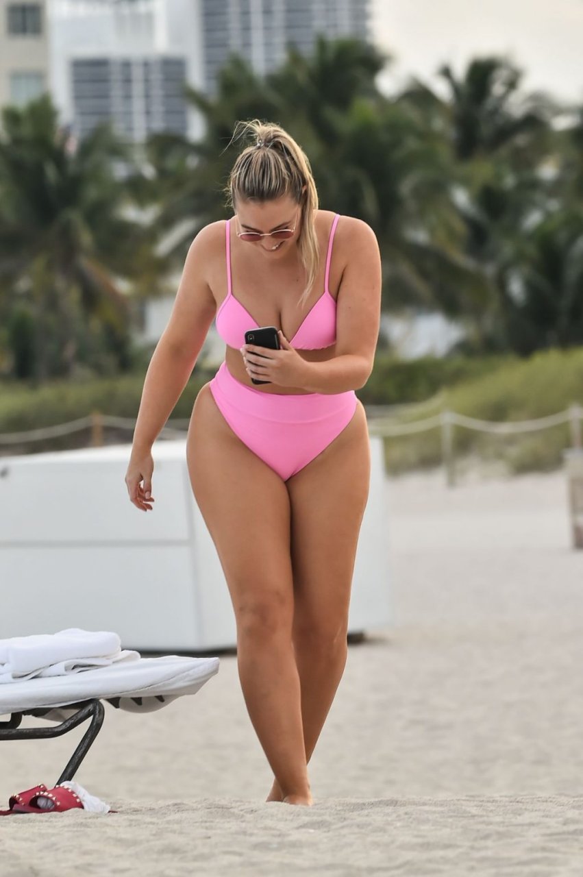 La modelo Iskra Lawrence muestra sus curvas en la playa con un bikini rosa en Miami, 12/09/2018. Iskra se ve genial mientras disfruta de su día en la playa.