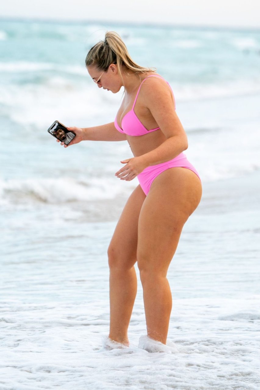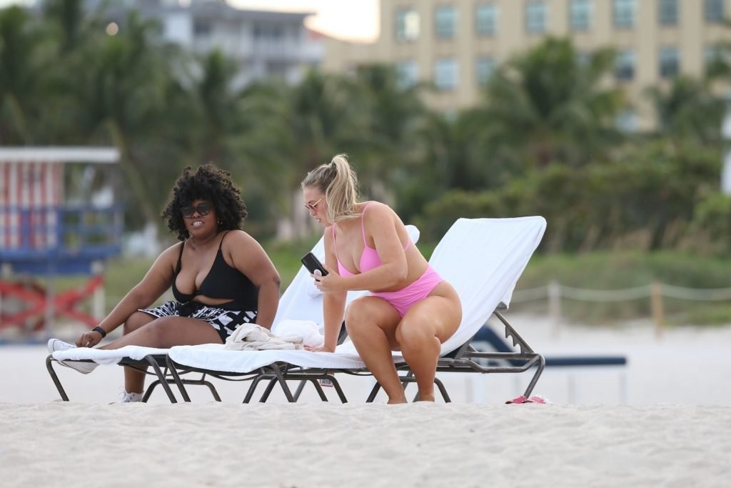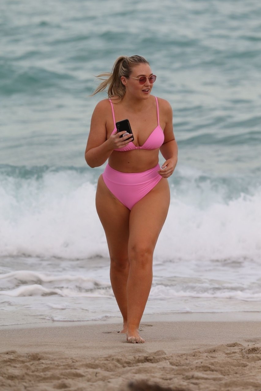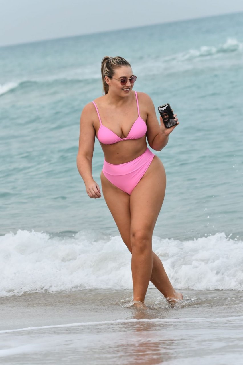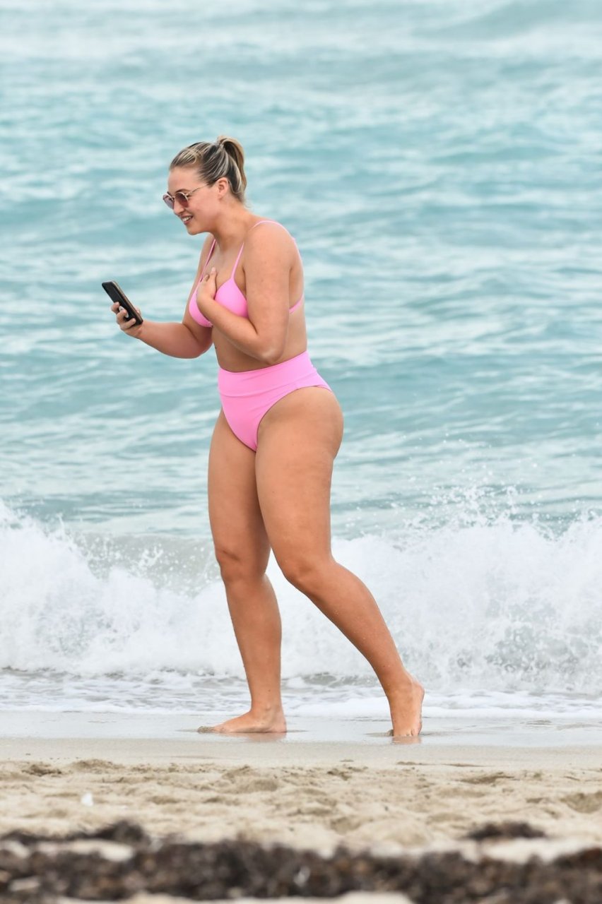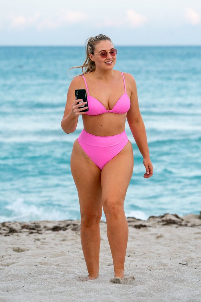 La modelo Iskra Lawrence muestra sus curvas en la playa con un bikini rosa en Miami, 12/09/2018. Iskra se ve genial mientras disfruta de su día en la playa.
