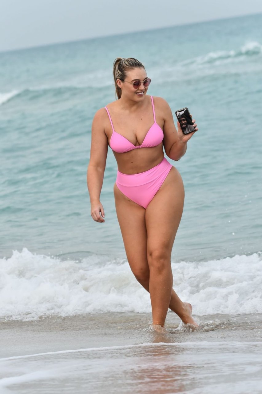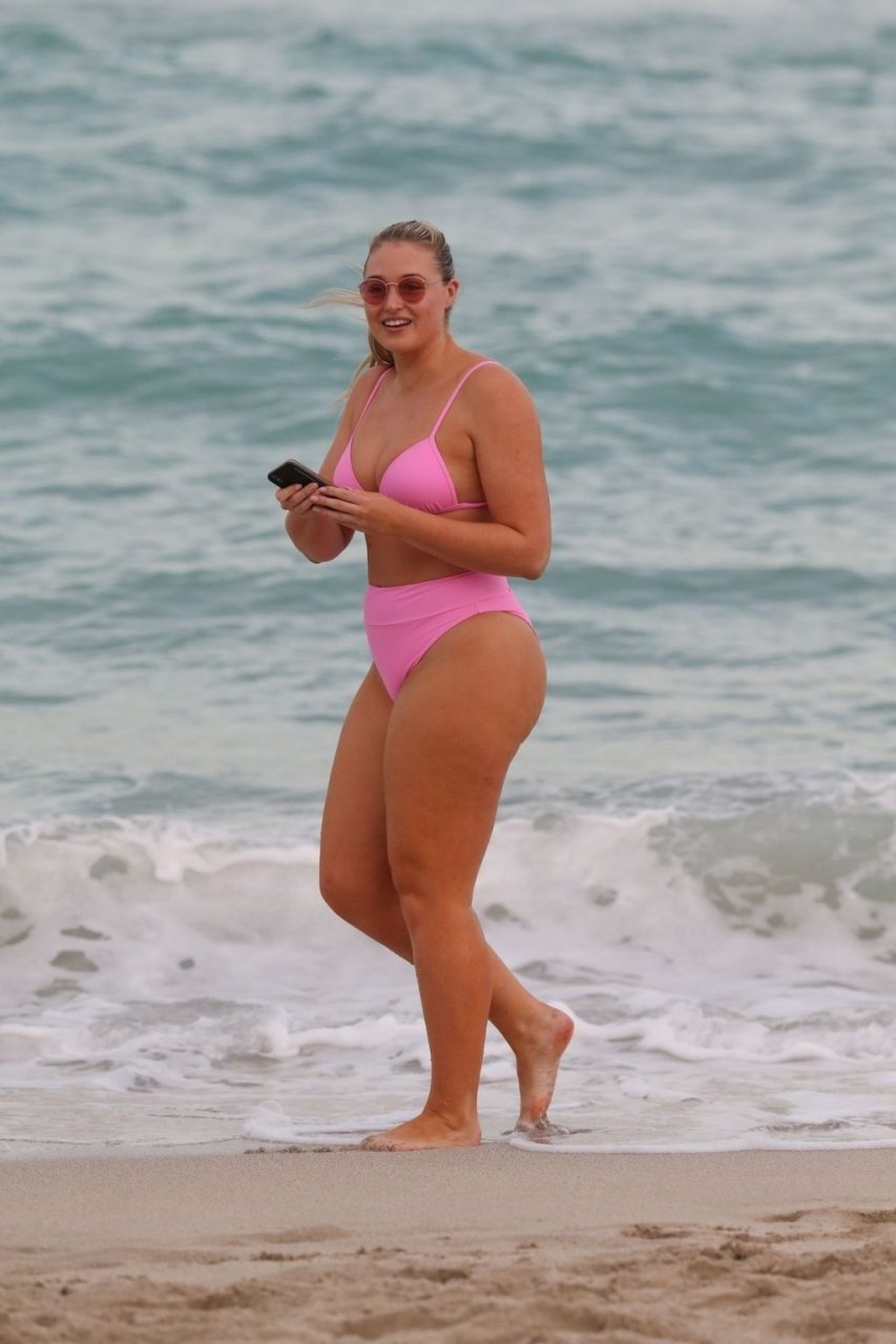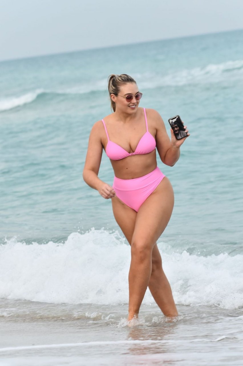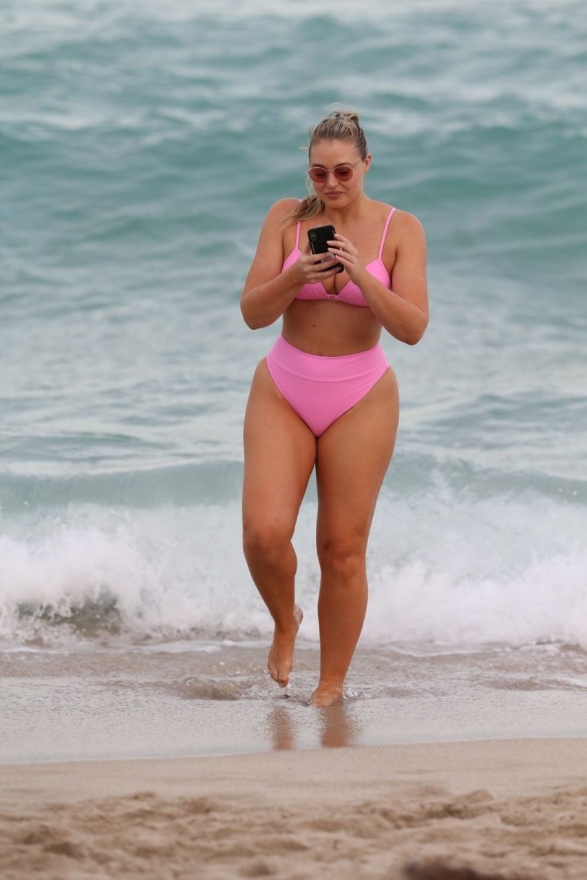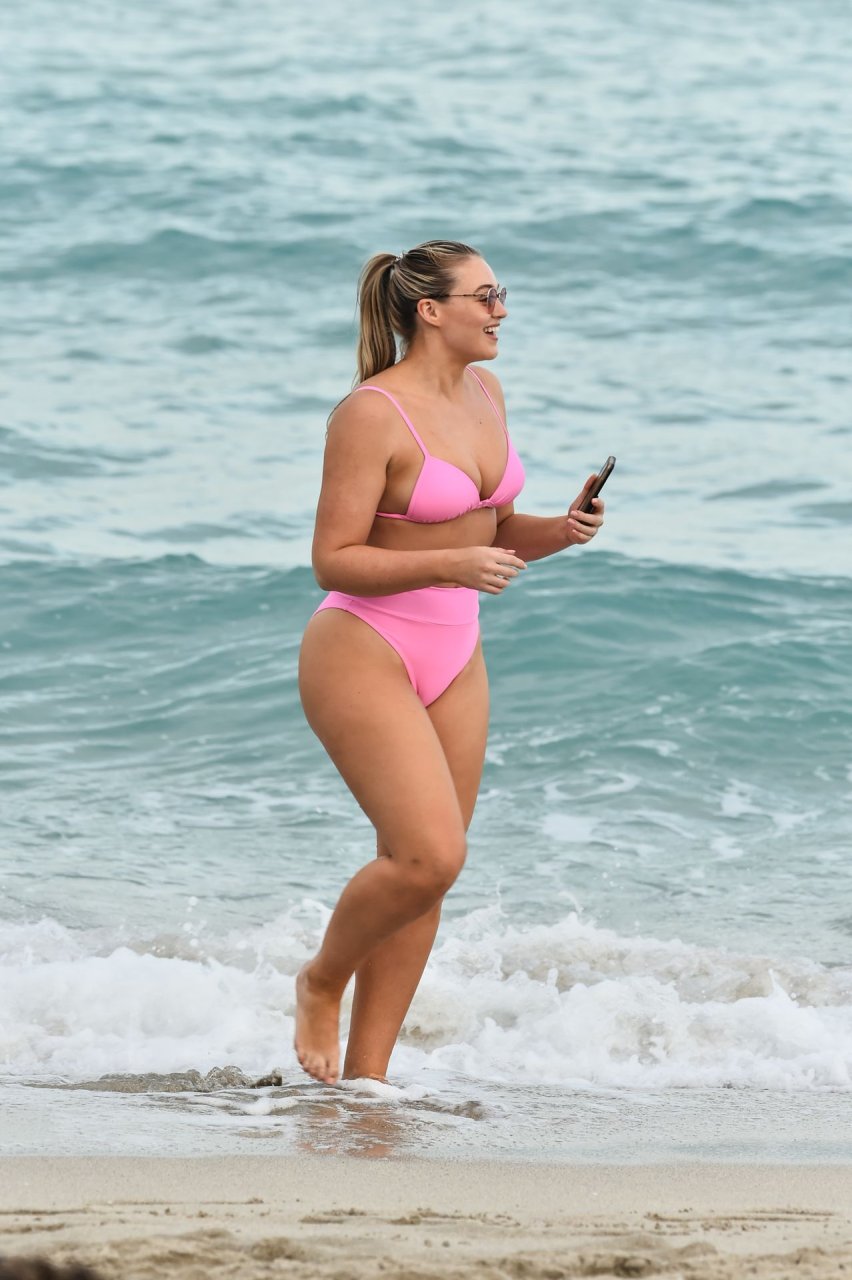 La modelo Iskra Lawrence muestra sus curvas en la playa con un bikini rosa en Miami, 12/09/2018. Iskra se ve genial mientras disfruta de su día en la playa.