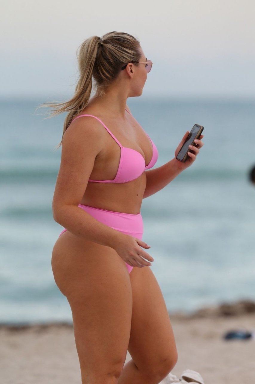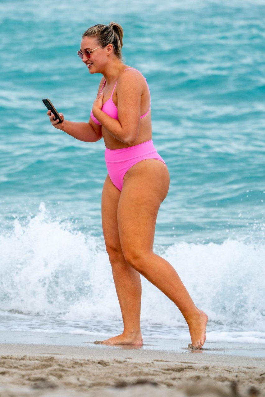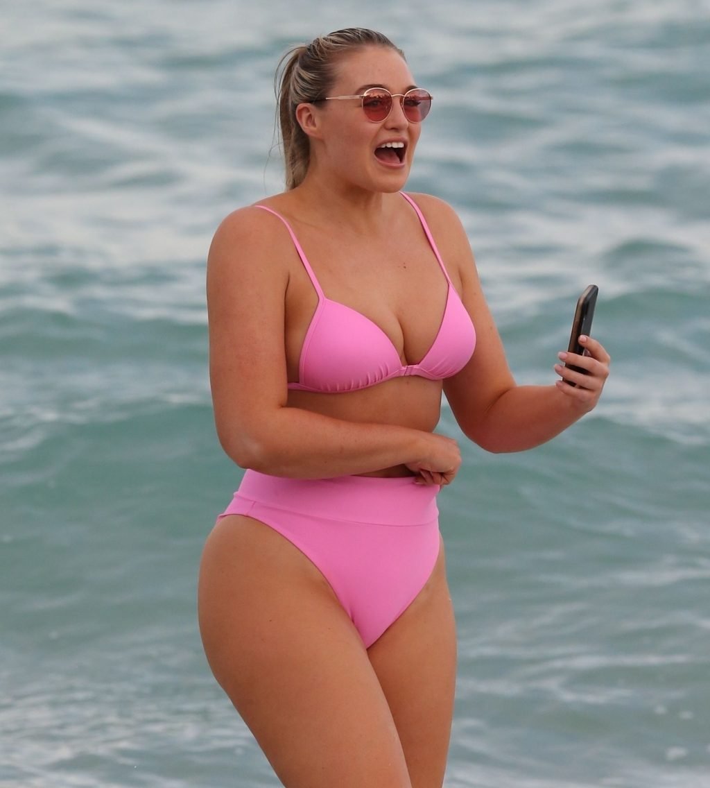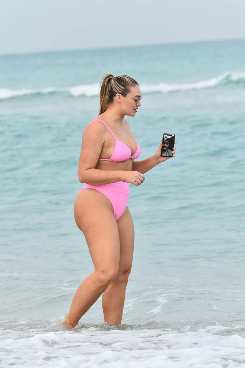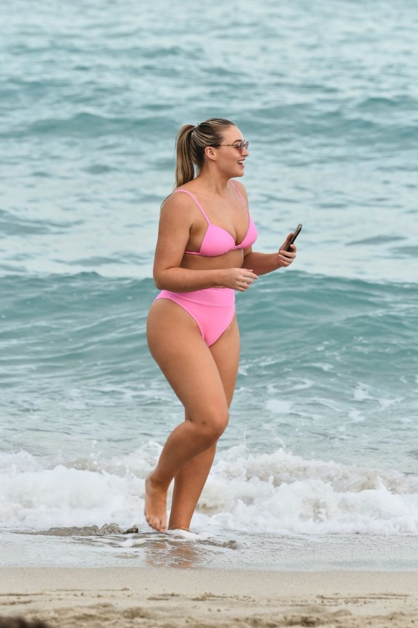 La modelo Iskra Lawrence muestra sus curvas en la playa con un bikini rosa en Miami, 12/09/2018. Iskra se ve genial mientras disfruta de su día en la playa.
