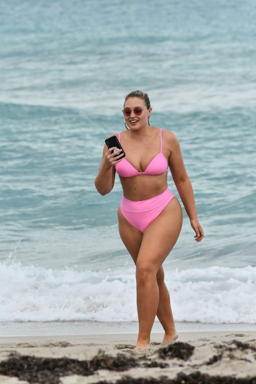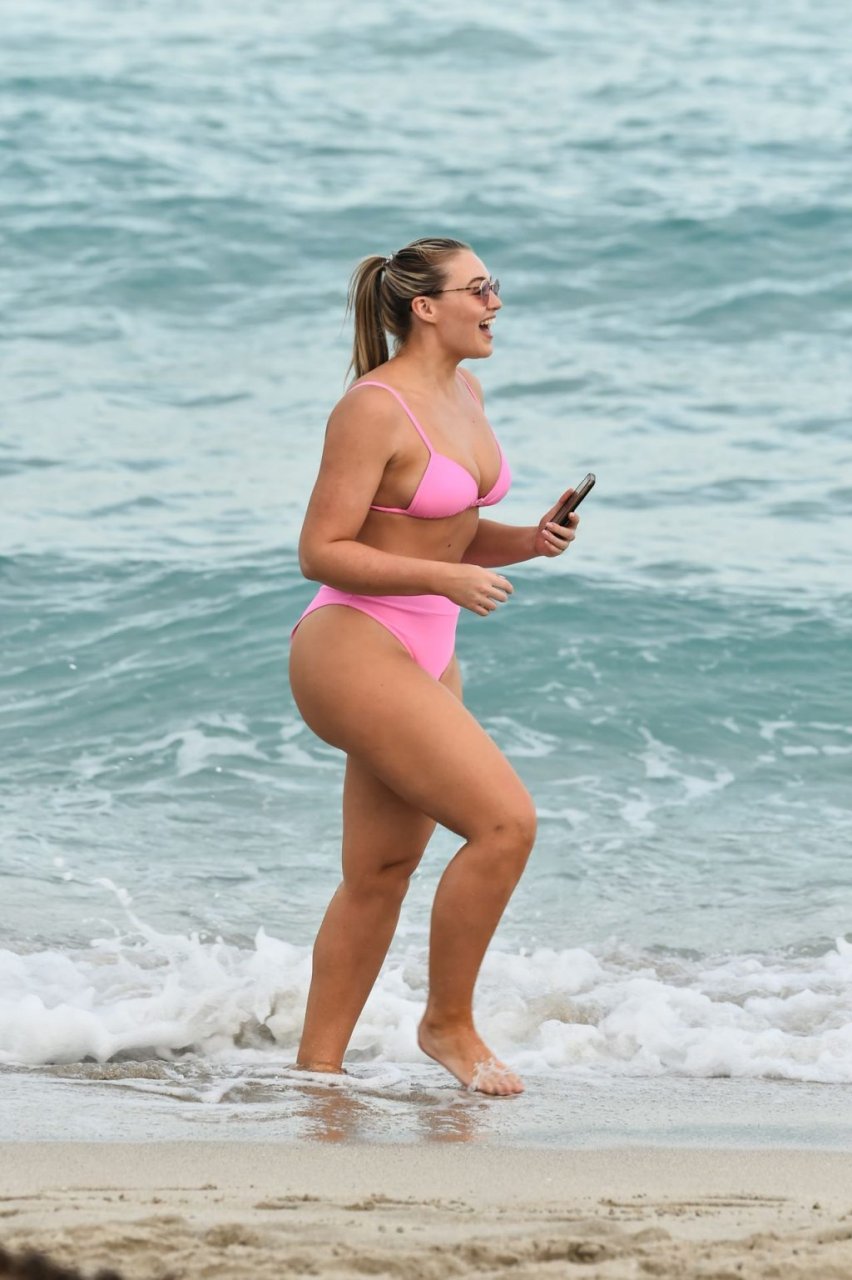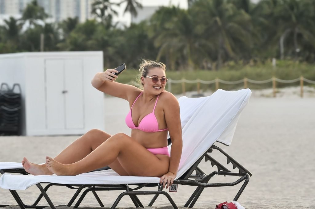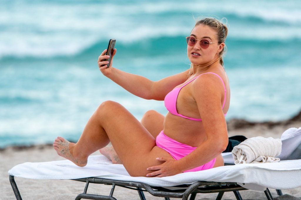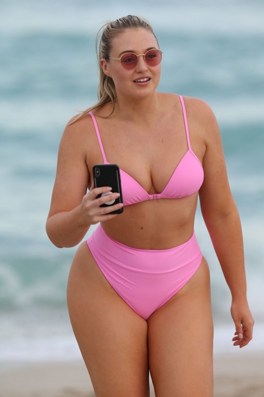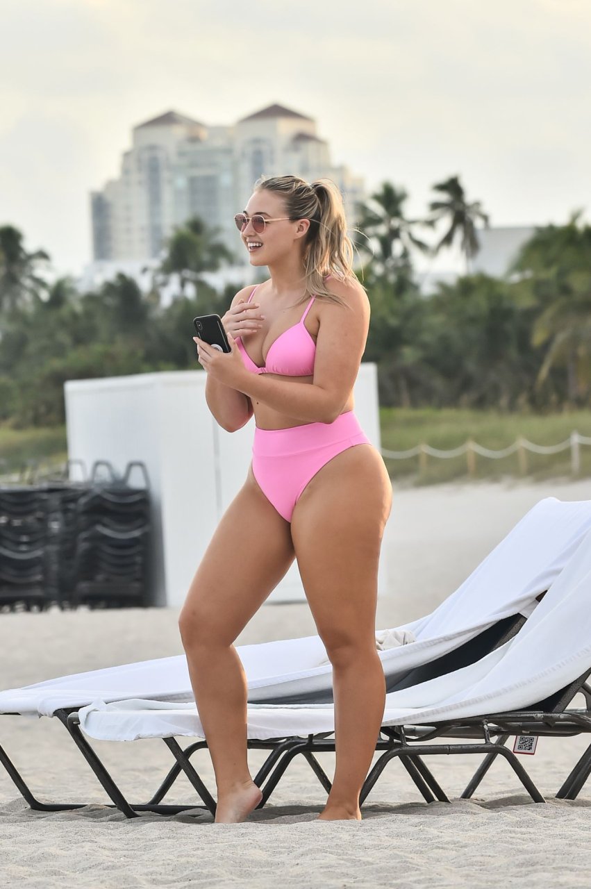La modelo Iskra Lawrence muestra sus curvas en la playa con un bikini rosa en Miami, 12/09/2018. Iskra se ve genial mientras disfruta de su día en la playa.