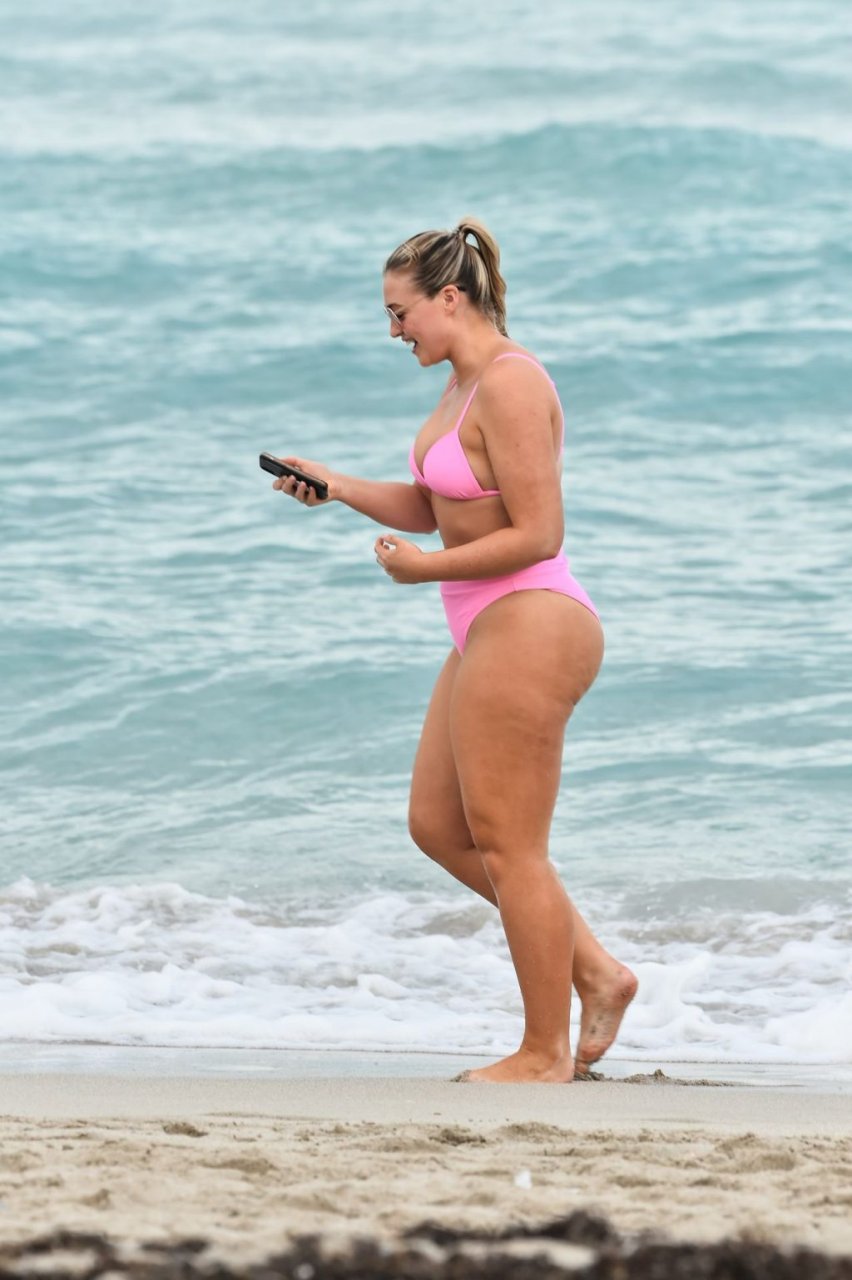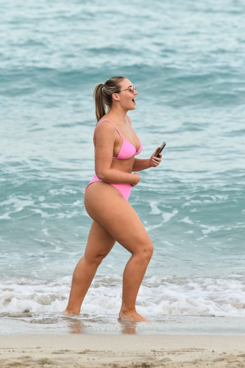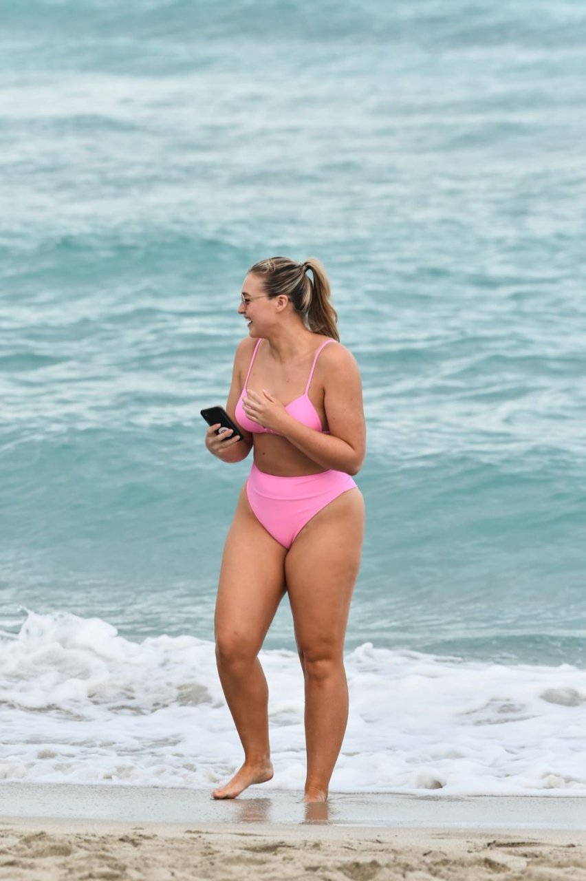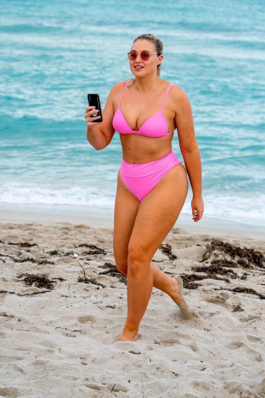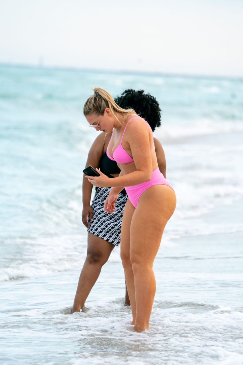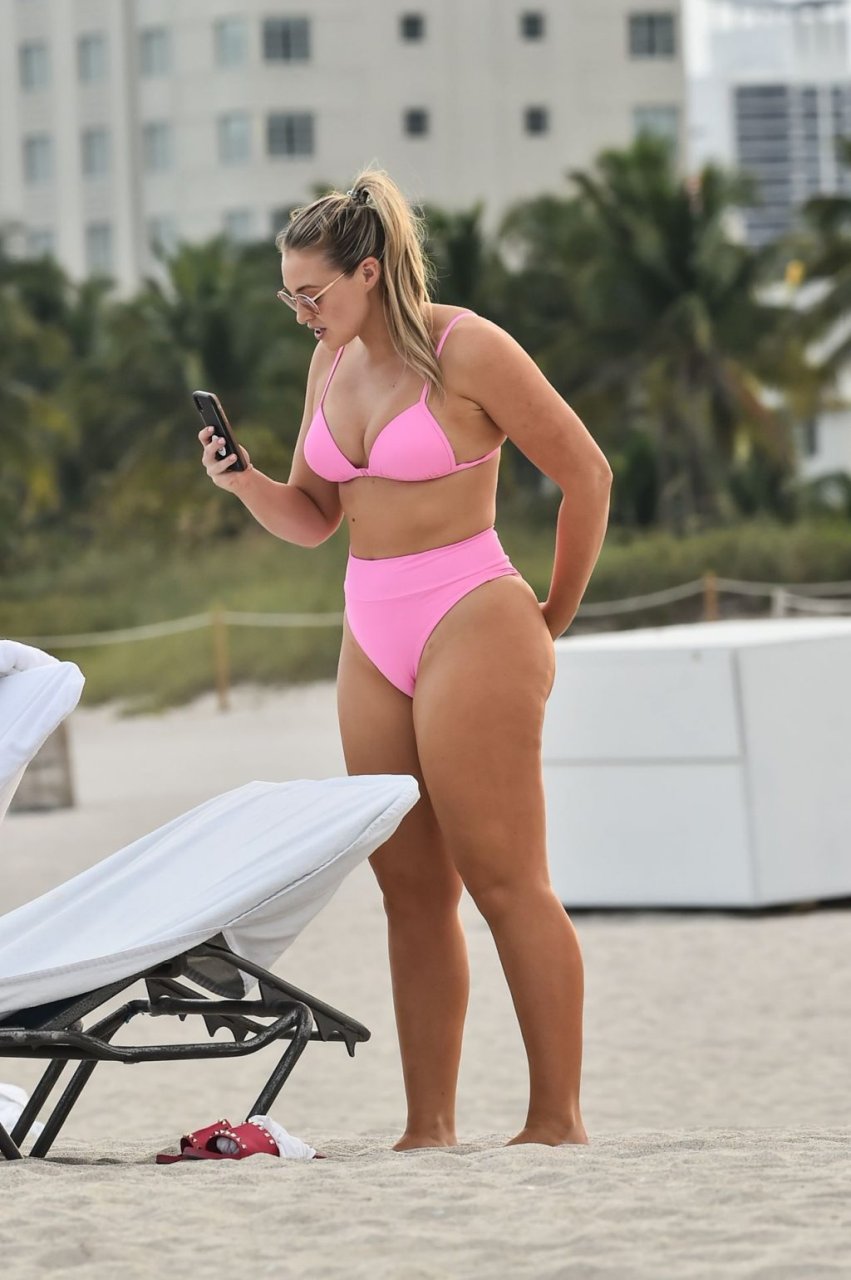 La modelo Iskra Lawrence muestra sus curvas en la playa con un bikini rosa en Miami, 12/09/2018. Iskra se ve genial mientras disfruta de su día en la playa.