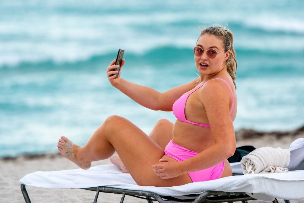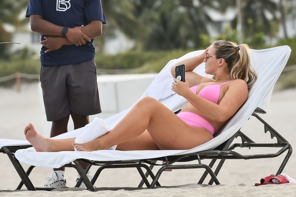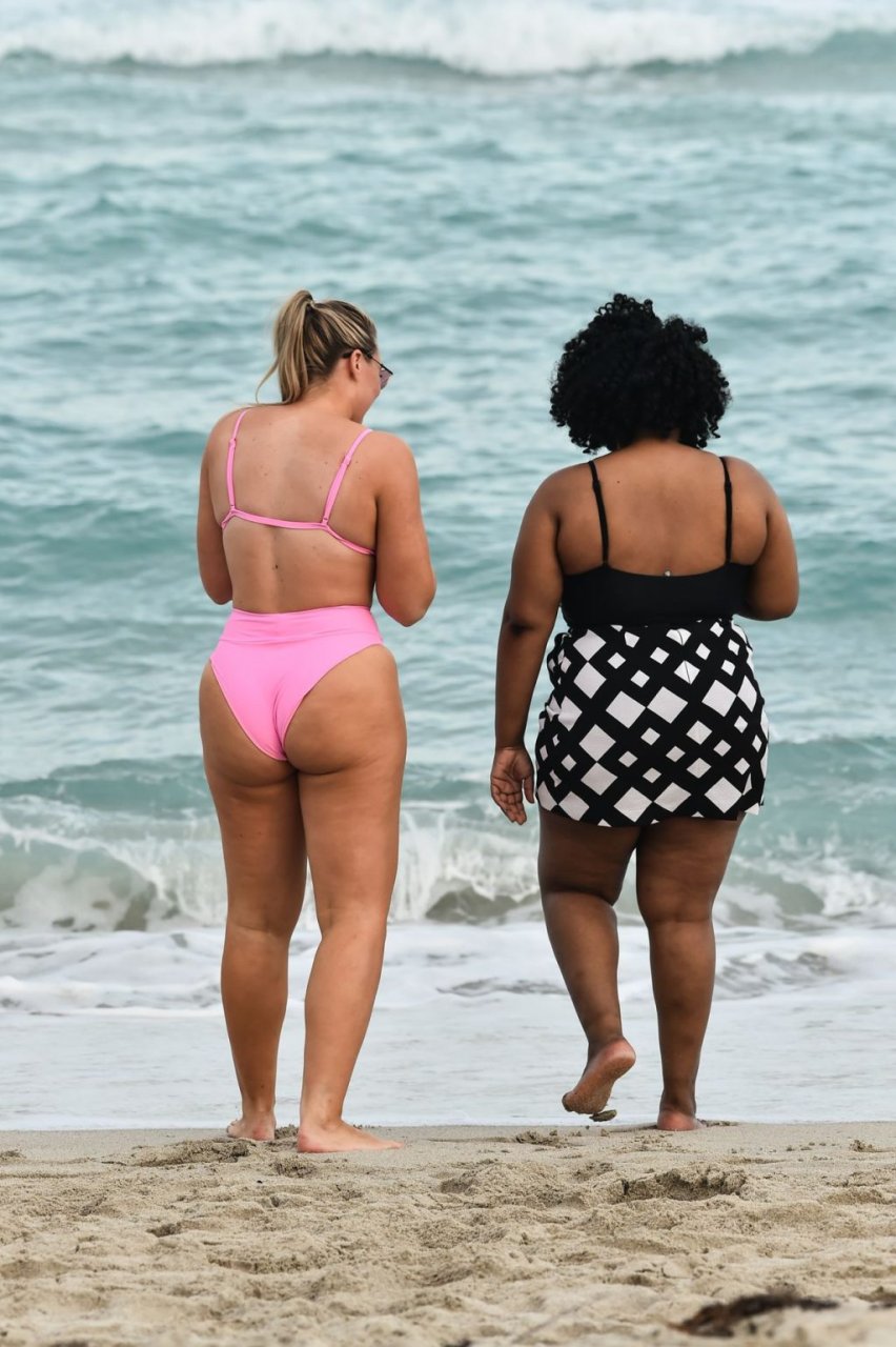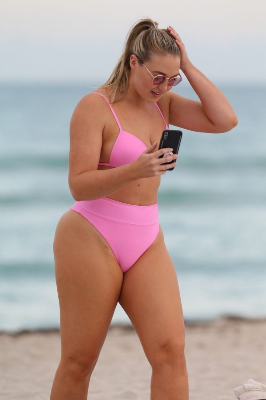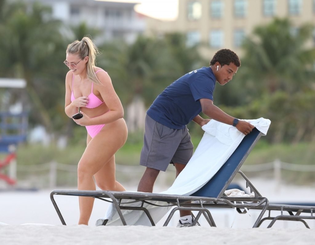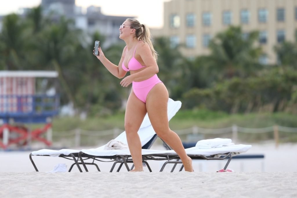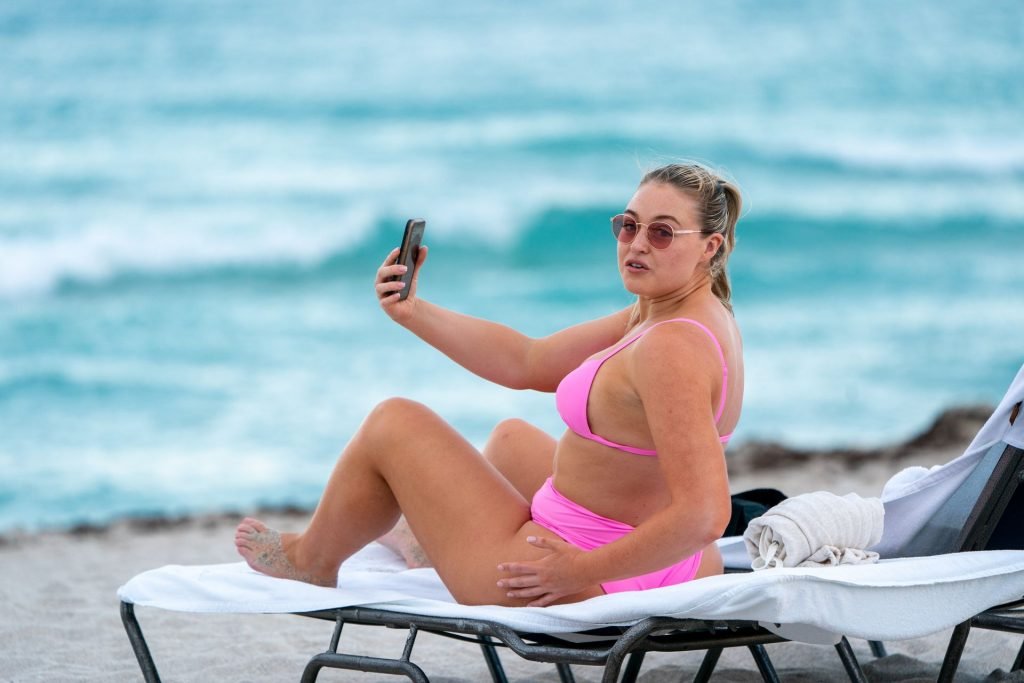 La modelo Iskra Lawrence muestra sus curvas en la playa con un bikini rosa en Miami, 12/09/2018. Iskra se ve genial mientras disfruta de su día en la playa.