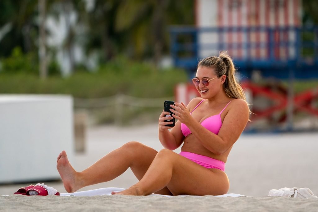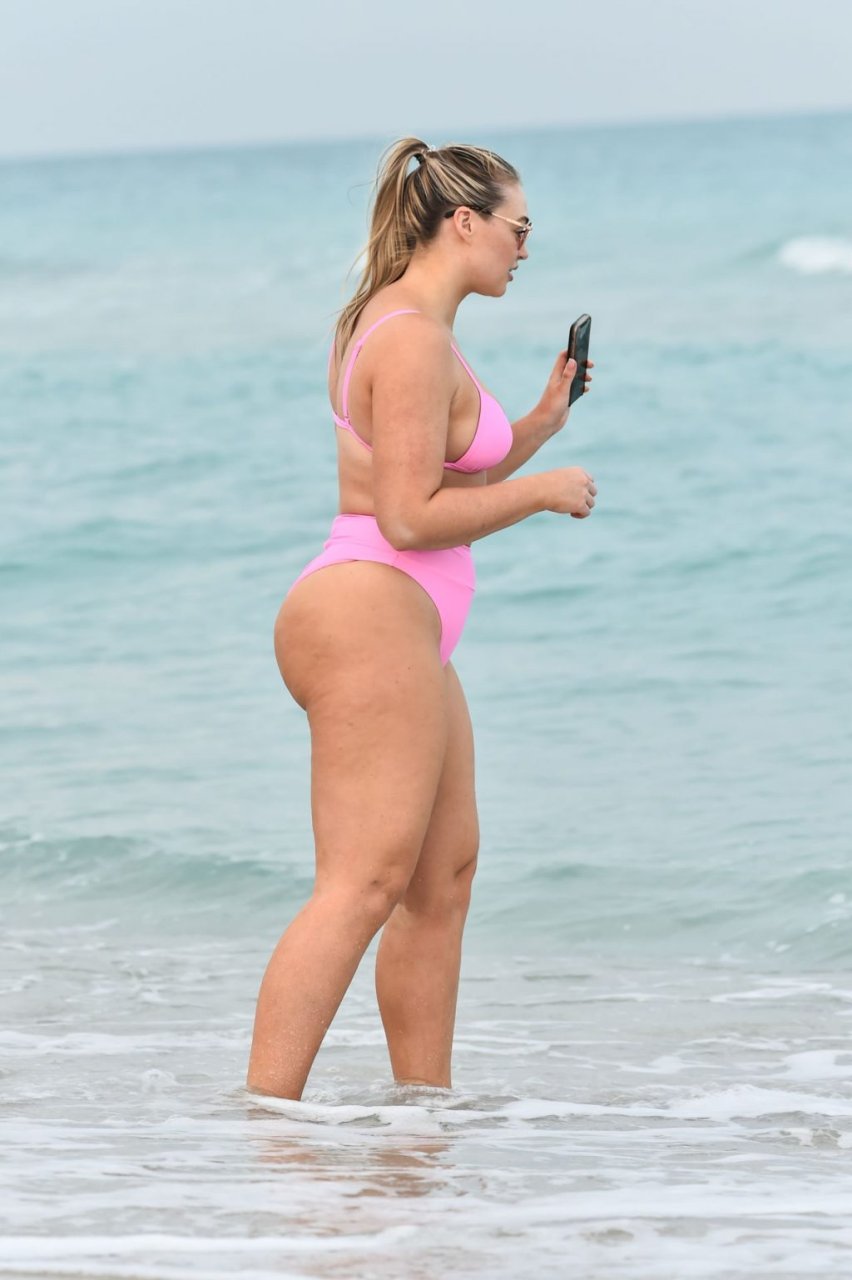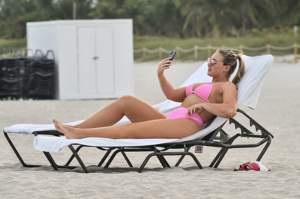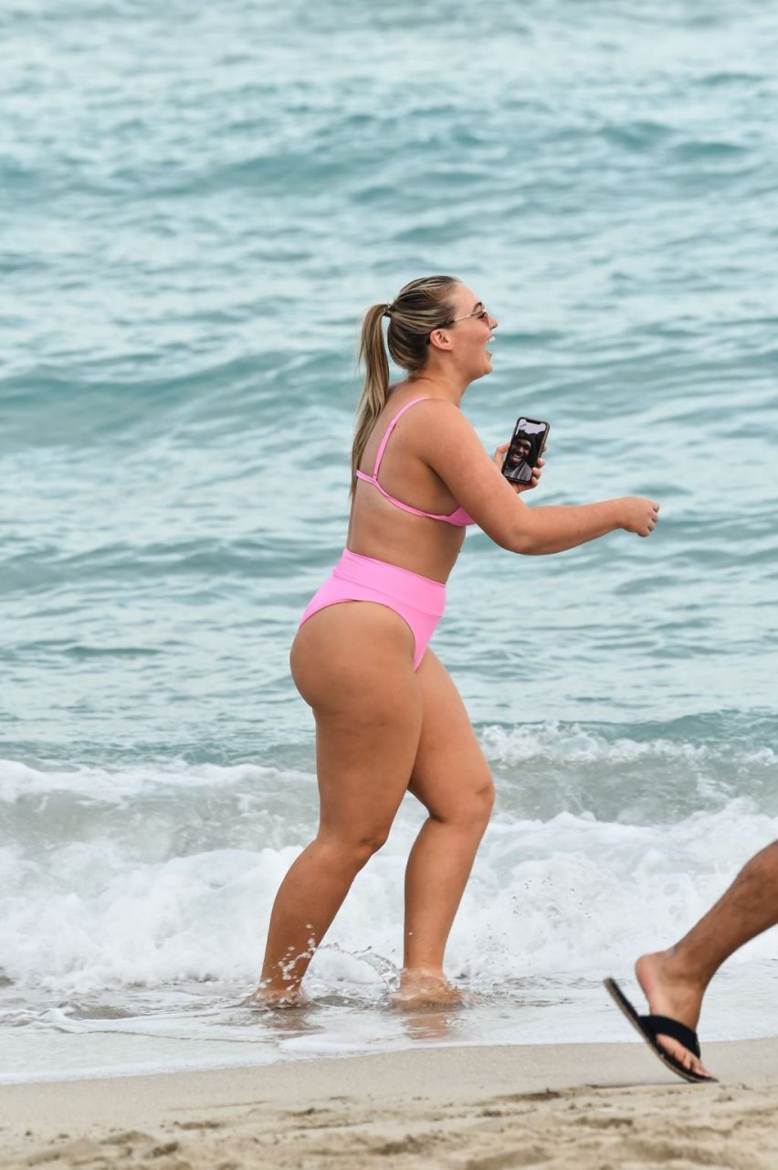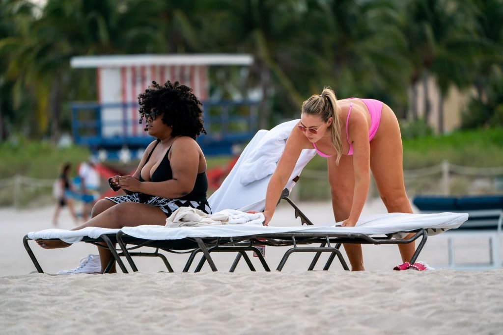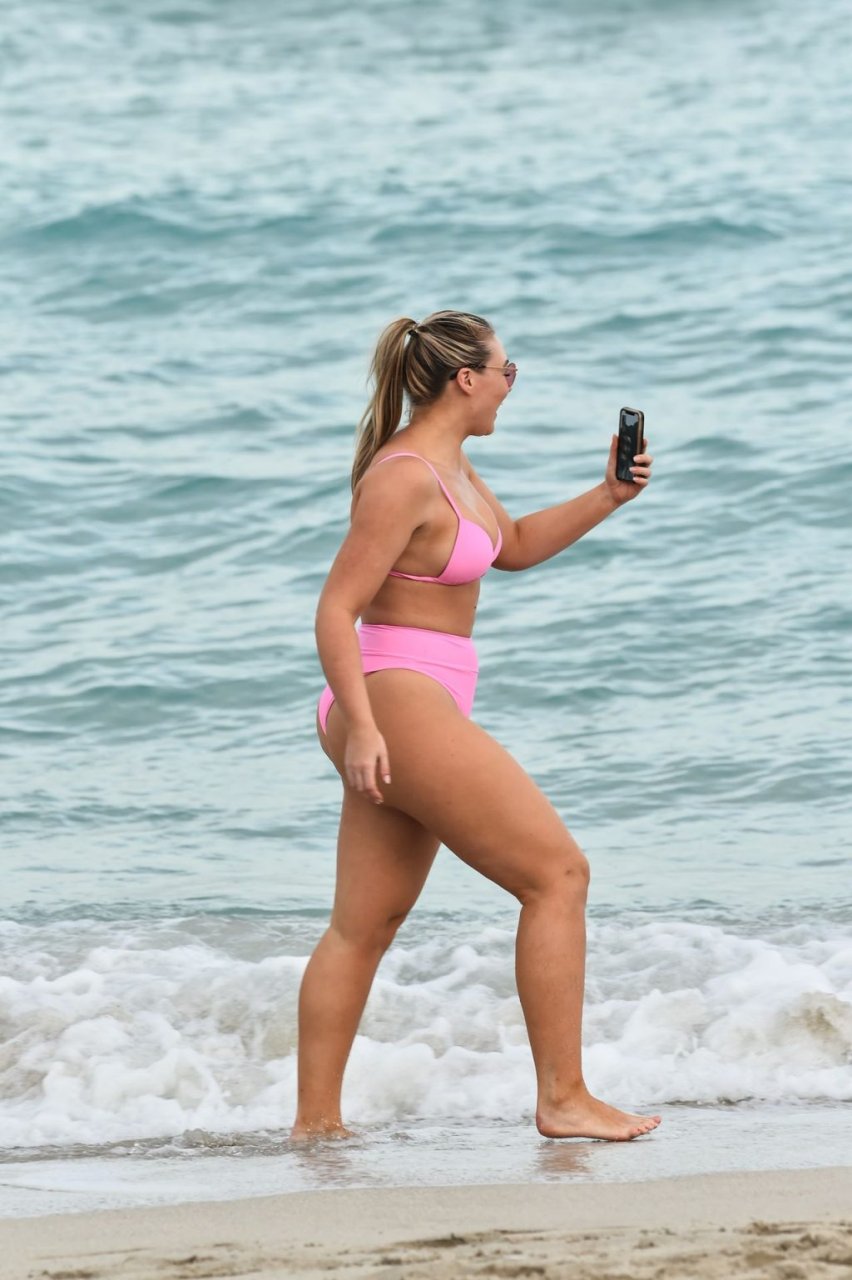 La modelo Iskra Lawrence muestra sus curvas en la playa con un bikini rosa en Miami, 12/09/2018. Iskra se ve genial mientras disfruta de su día en la playa.
