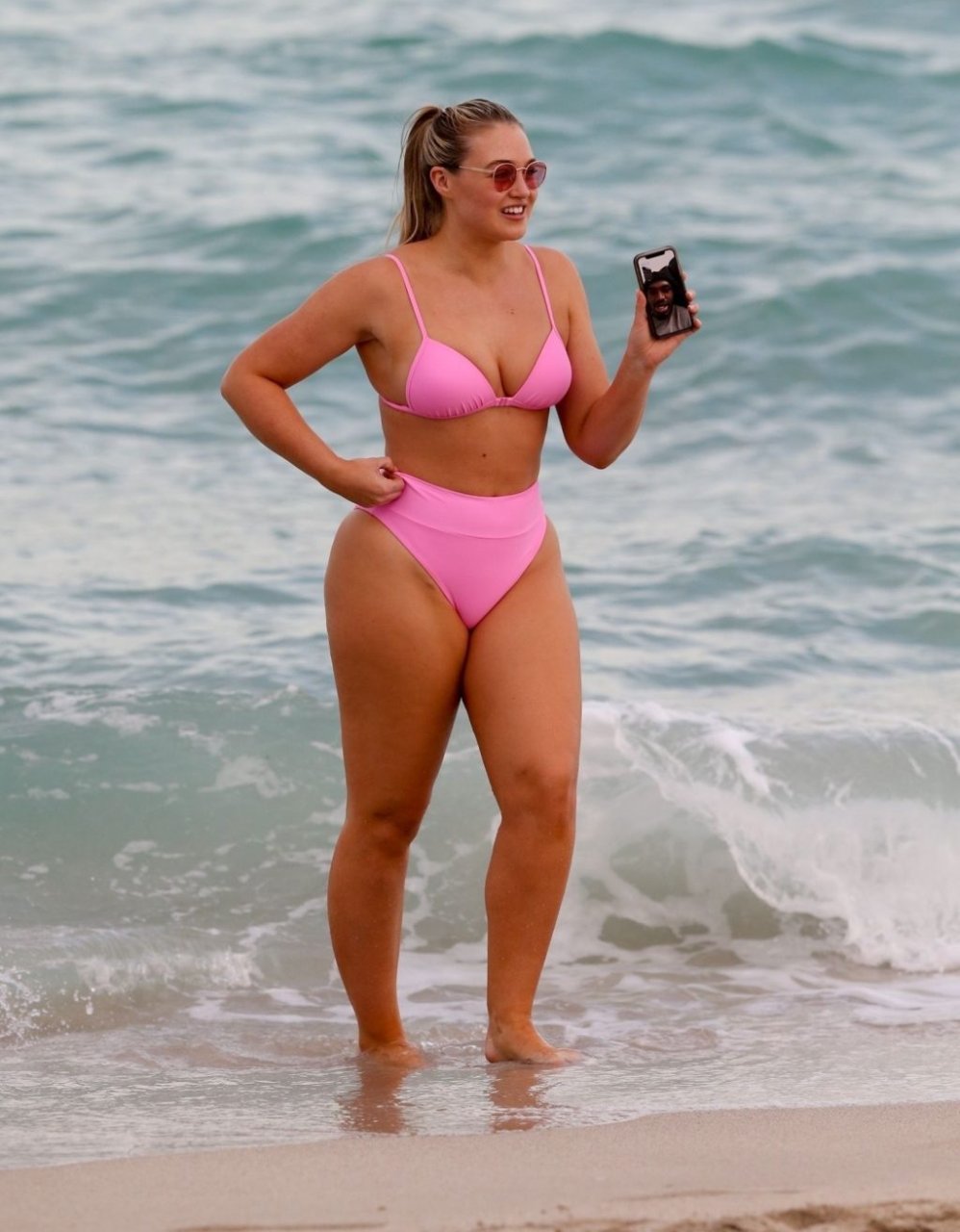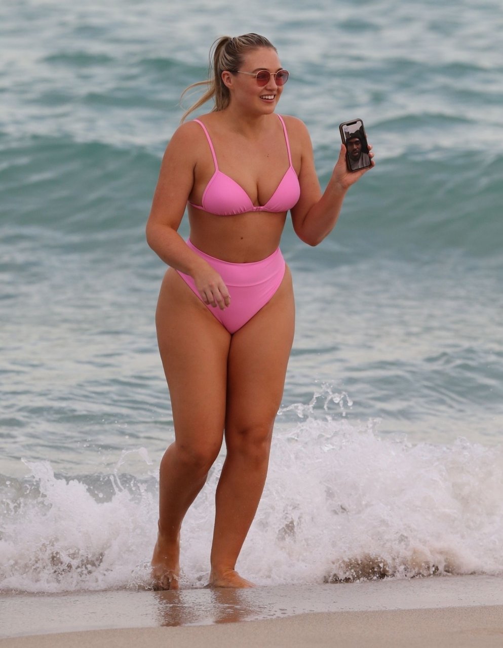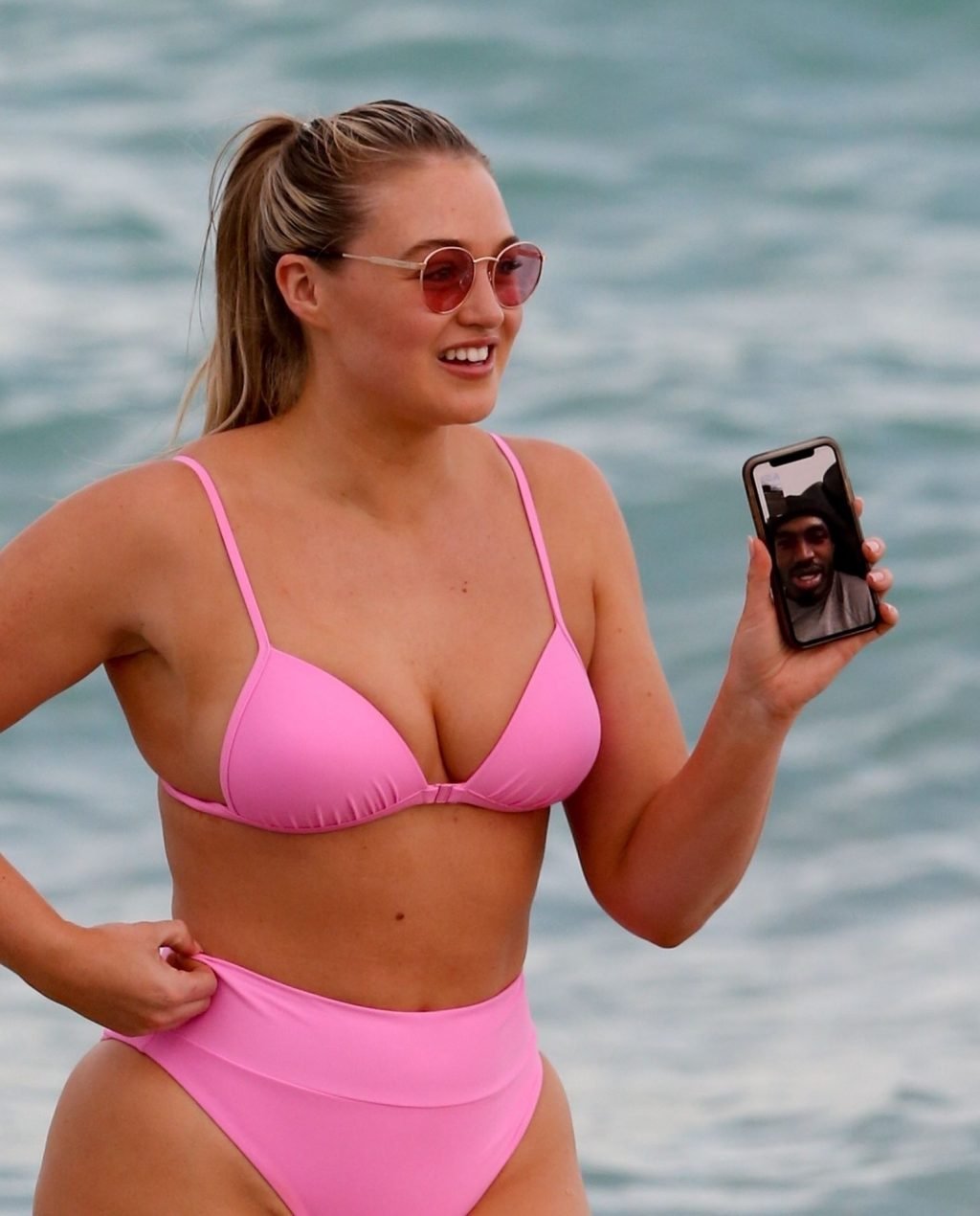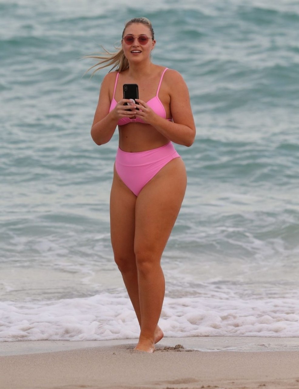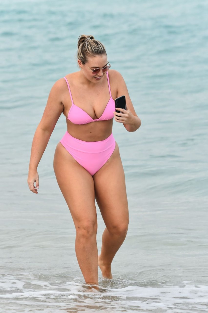 La modelo Iskra Lawrence muestra sus curvas en la playa con un bikini rosa en Miami, 12/09/2018. Iskra se ve genial mientras disfruta de su día en la playa.