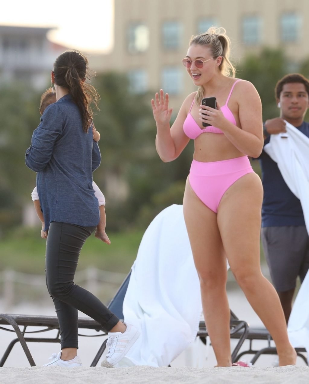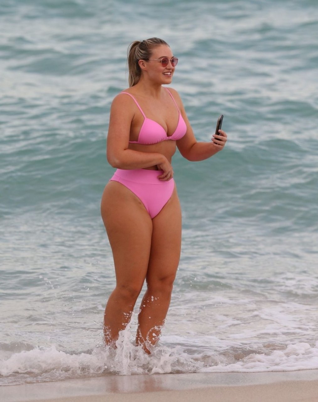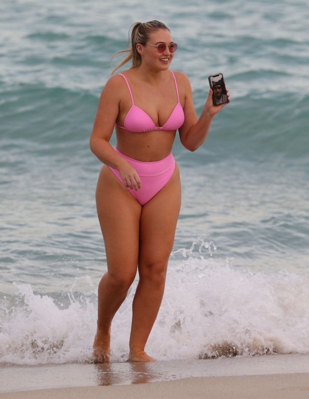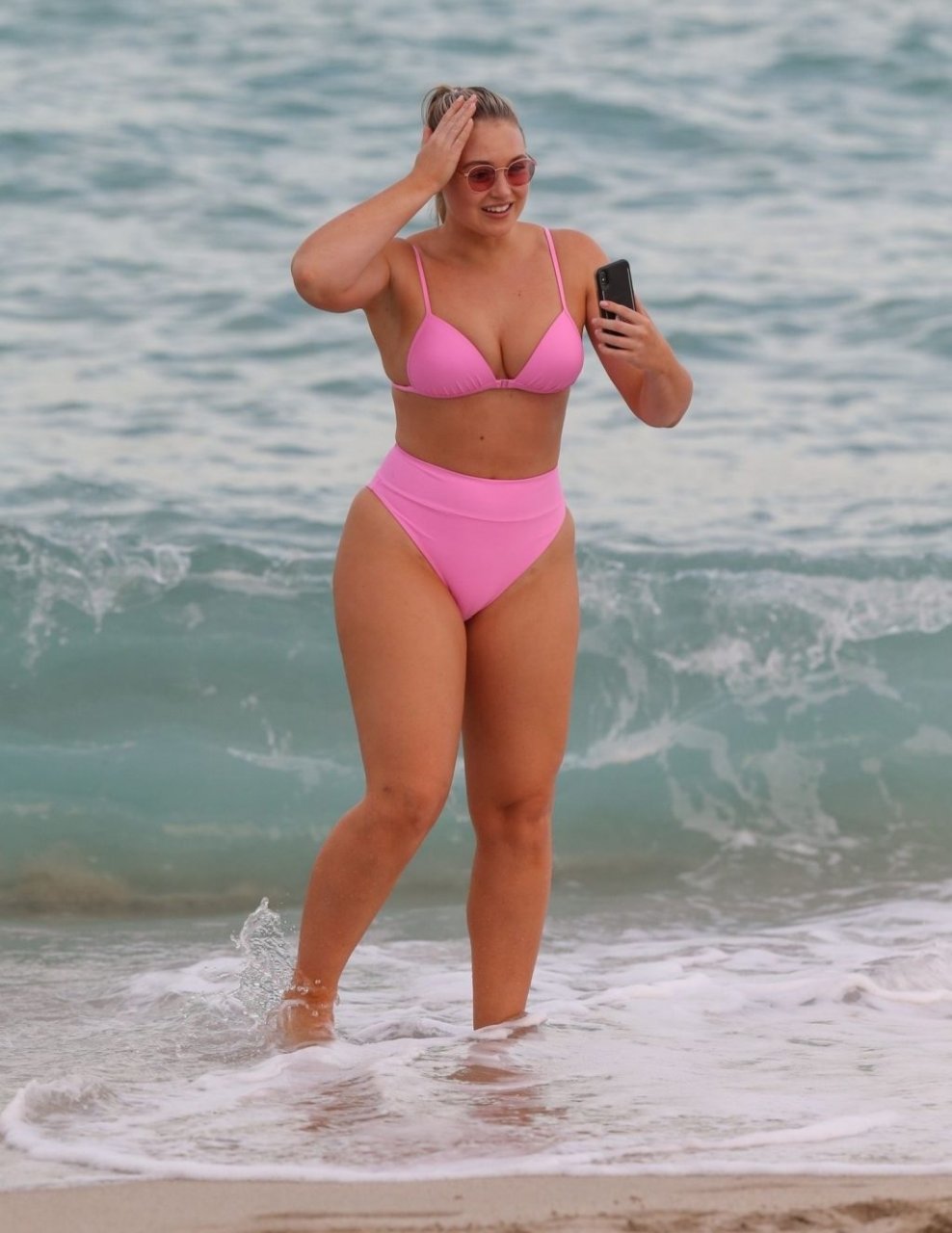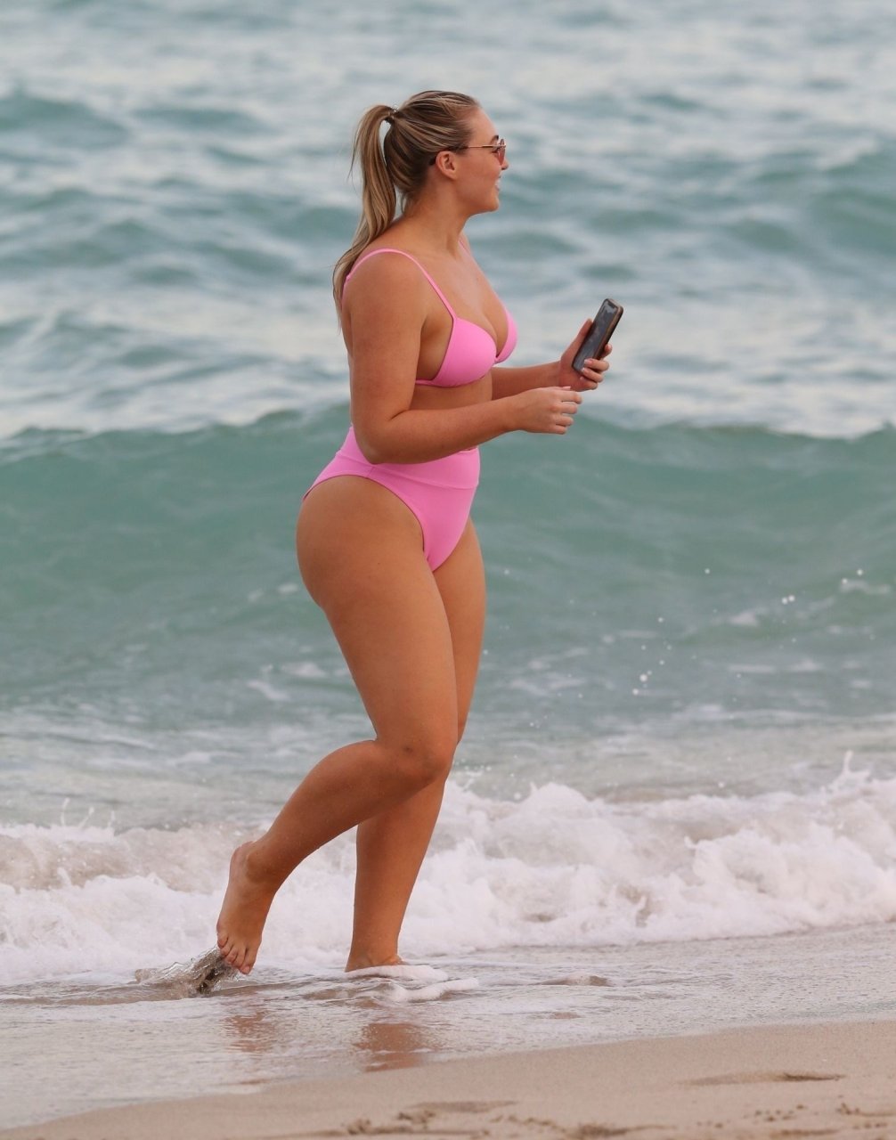 La modelo Iskra Lawrence muestra sus curvas en la playa con un bikini rosa en Miami, 12/09/2018. Iskra se ve genial mientras disfruta de su día en la playa.
