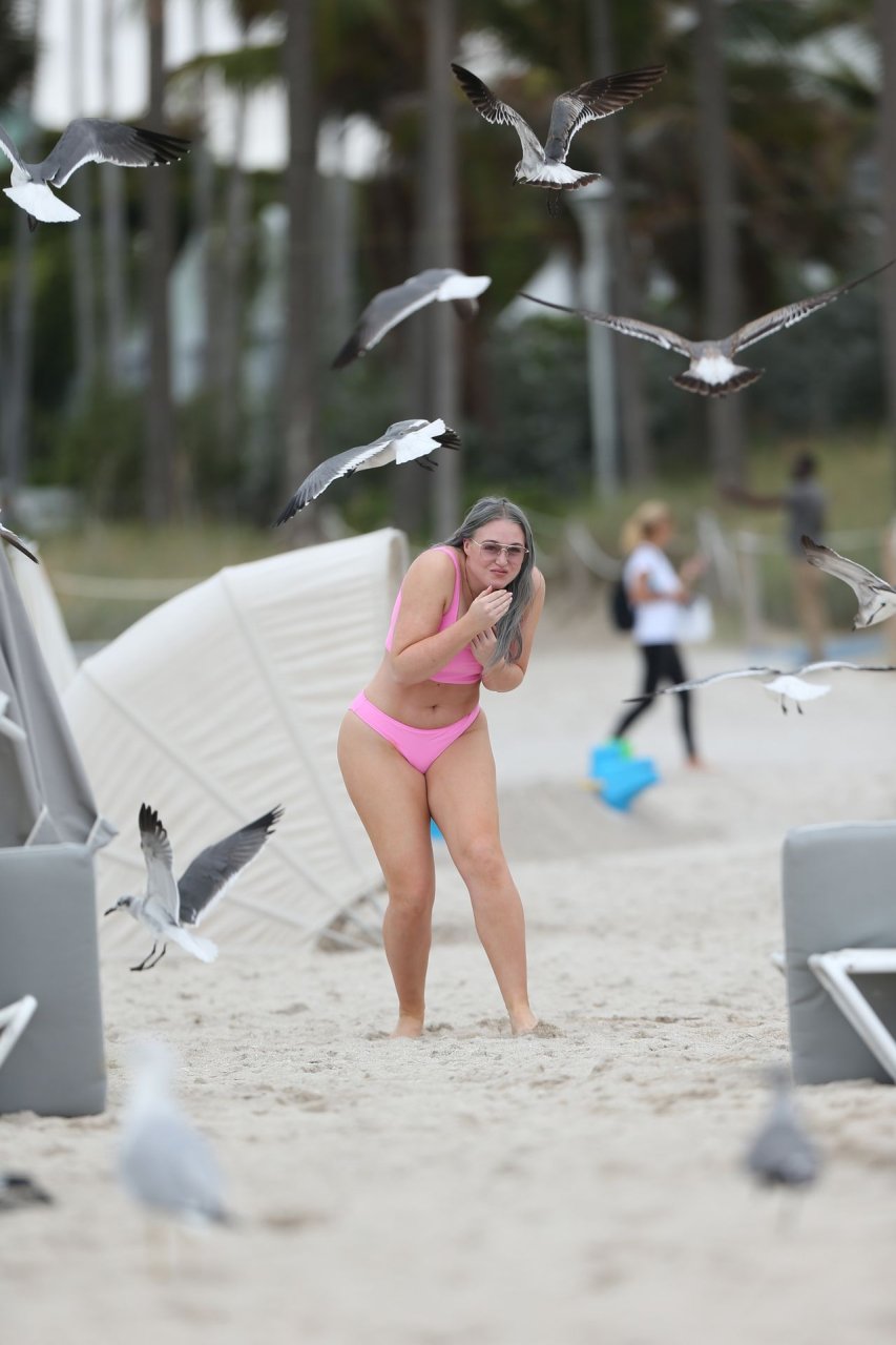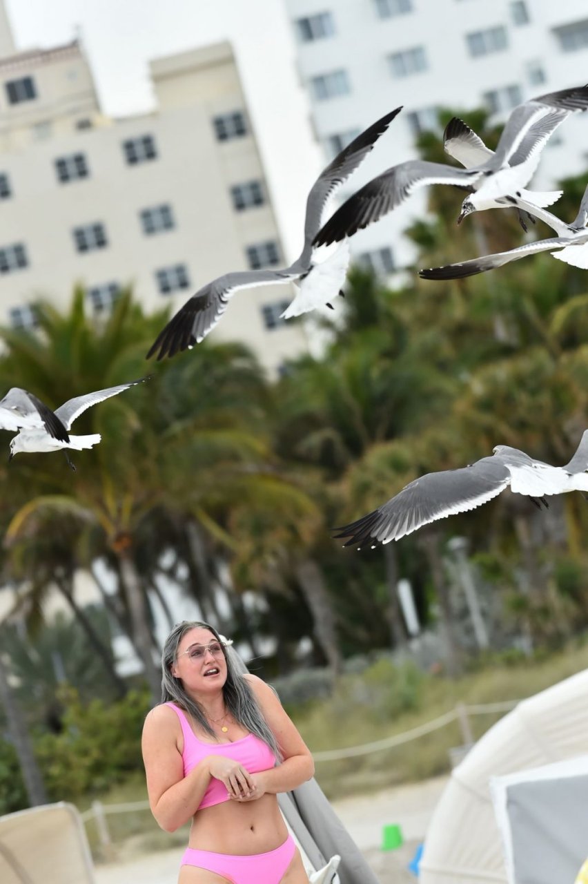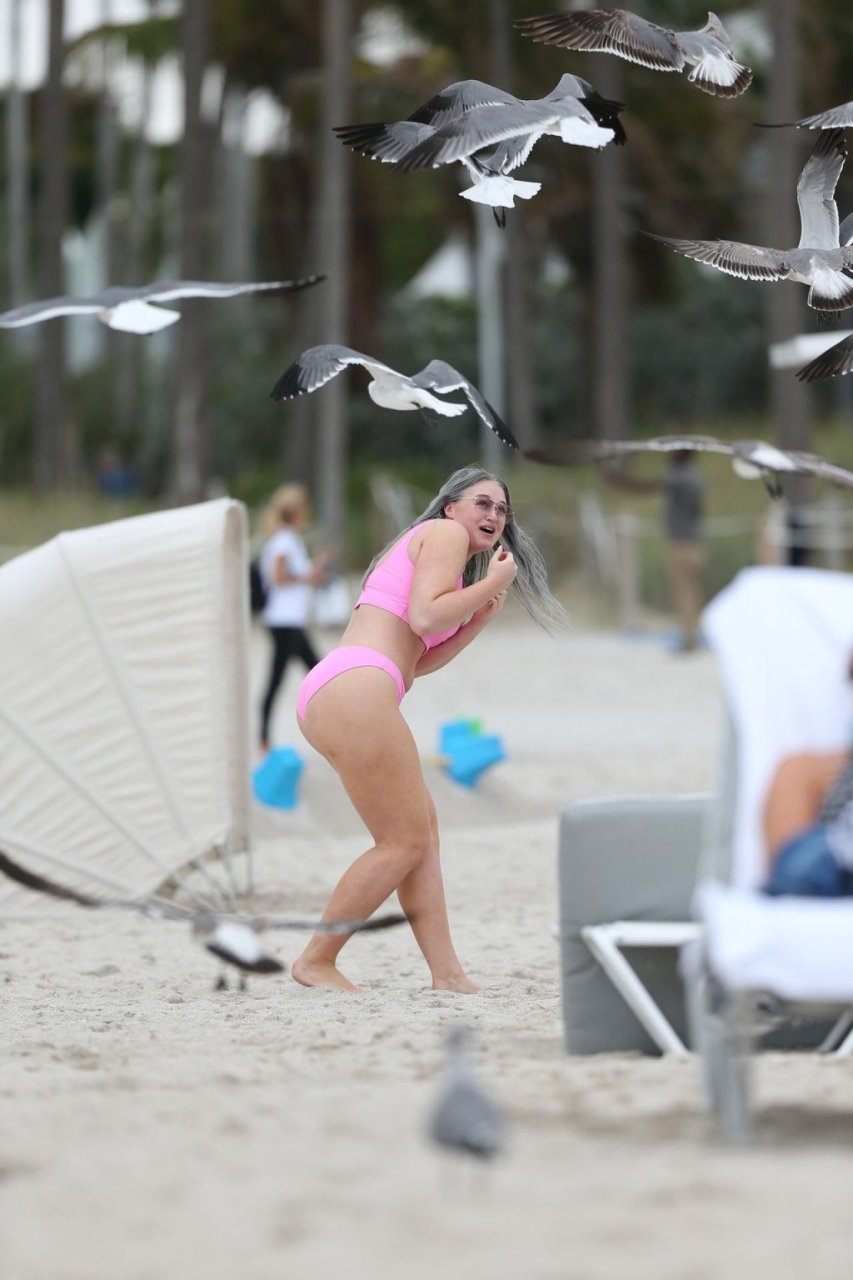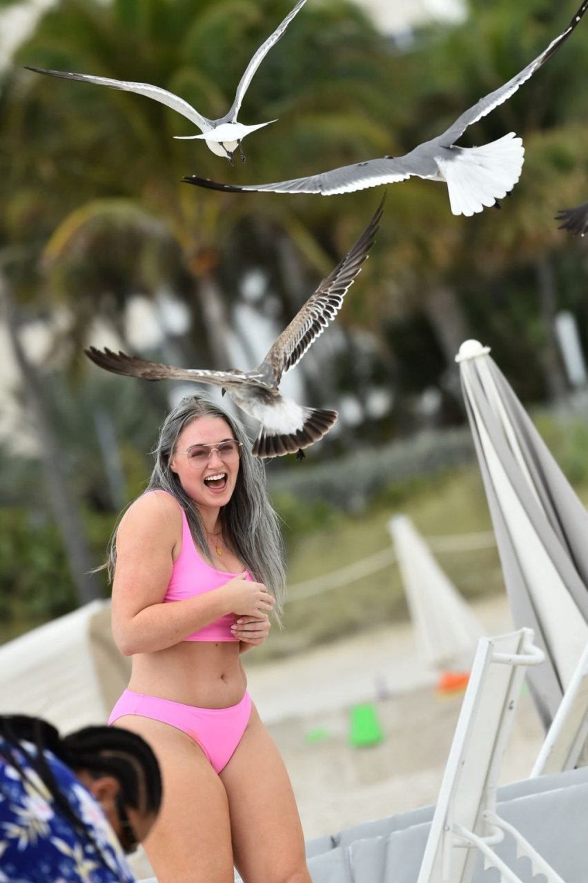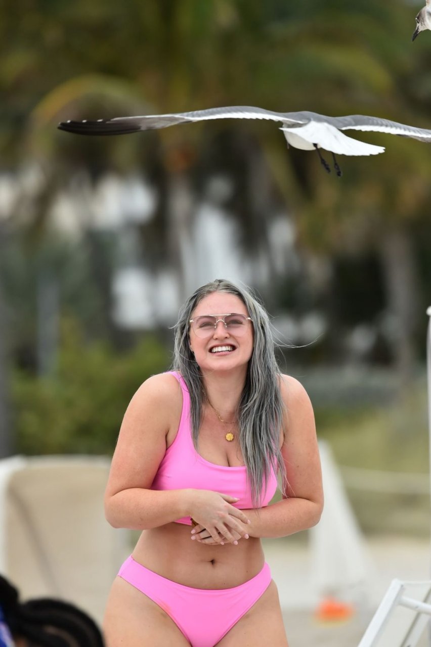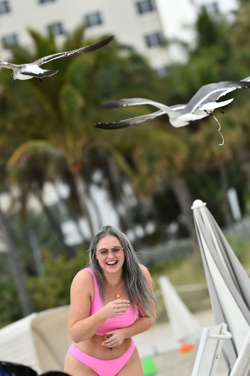 Mostrando sus curvas con un bikini rosa bebé de Aerie y su nuevo cabello plateado, Iskra intentó comer una galleta en la playa, sin saber que enfrentaría la furia de una hambrienta bandada de gaviotas. Afortunadamente, la modelo la comió rápidamente y pudo reírse de ello y disfrutar el resto de su día en la playa.