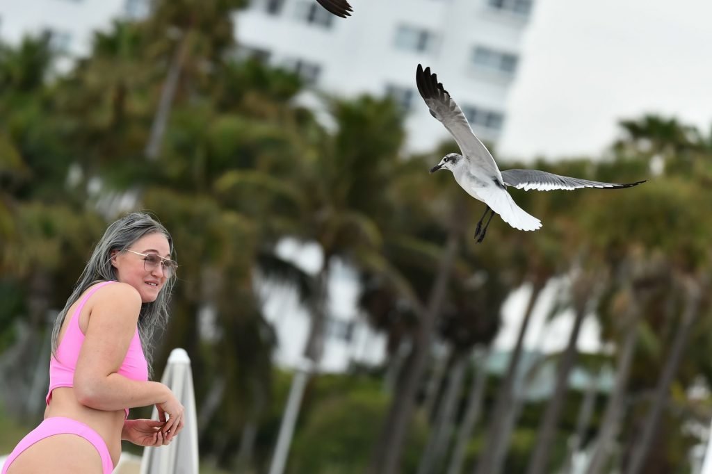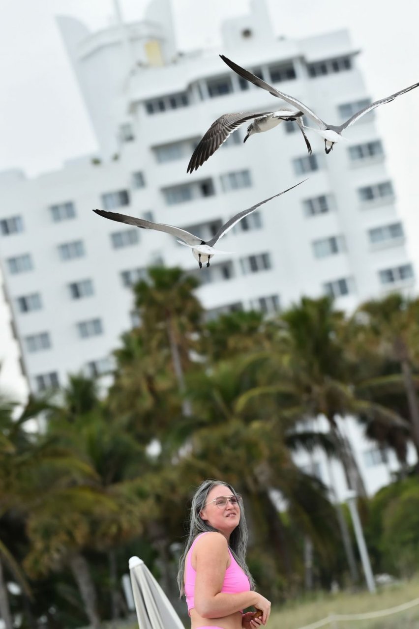 Iskra Lawrence, vestida con bikini, es atacada por una bandada de gaviotas mientras intenta comer una galleta disfrutando de un día en la playa en Miami, 27/01/2019.