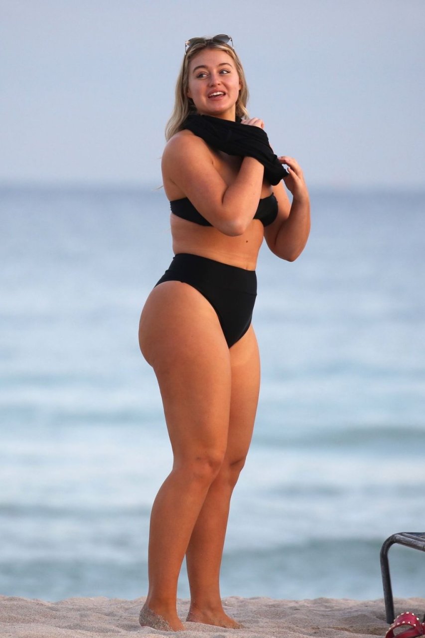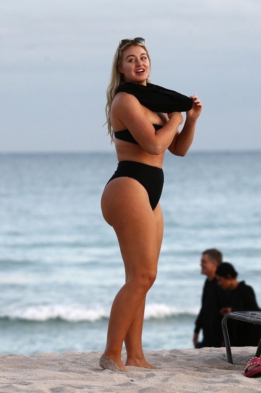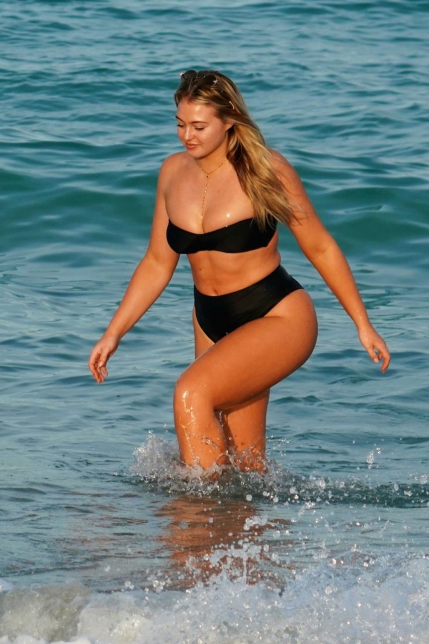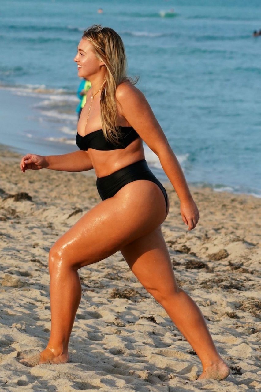 Iskra Lawrence muestra su figura mientras disfruta de otro día en la playa en Miami, 12/09/2018. La modelo de talla grande fue vista con amigos mientras se cubría después del día en la playa y se dirigía de regreso a su hotel.