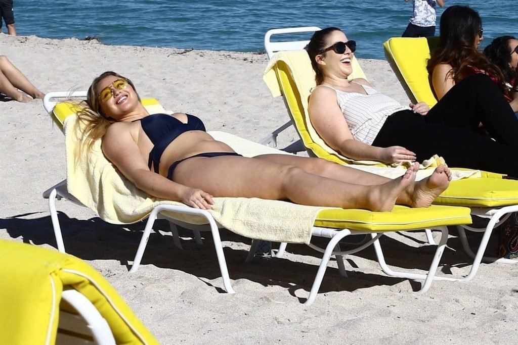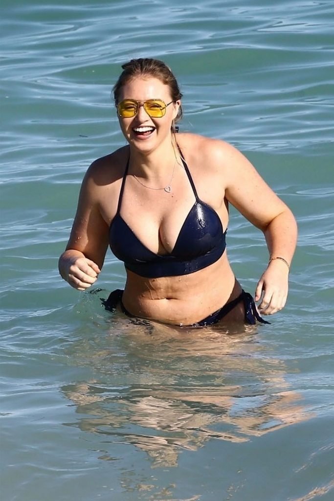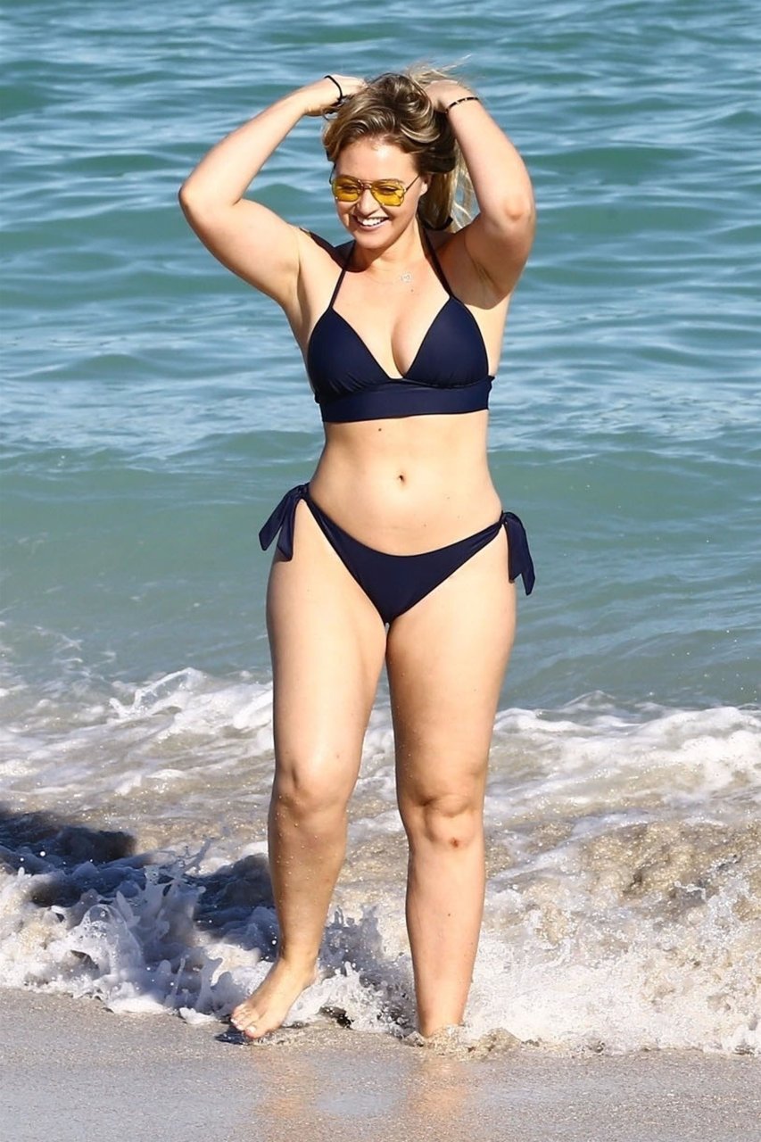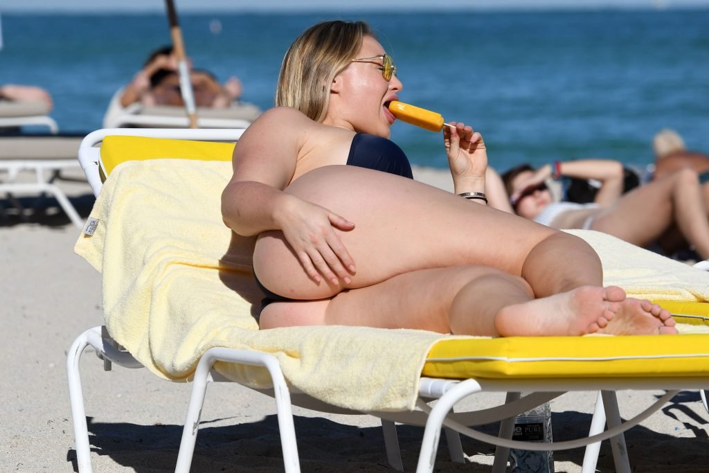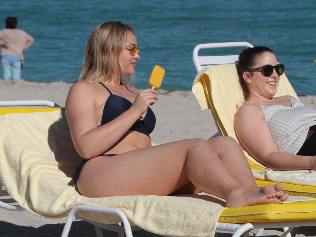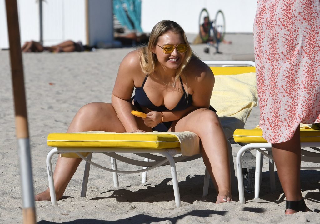 Iskra Lawrence y algunos amigos se ven disfrutando de un día en la playa en Miami, 11/12/2017. La modelo de 27 años y curvas pronunciadas mostró sus curvas con un bikini azul marino y disfrutó de una barra de helado mientras tomaba el sol.