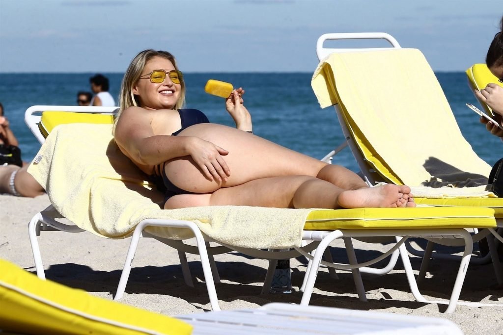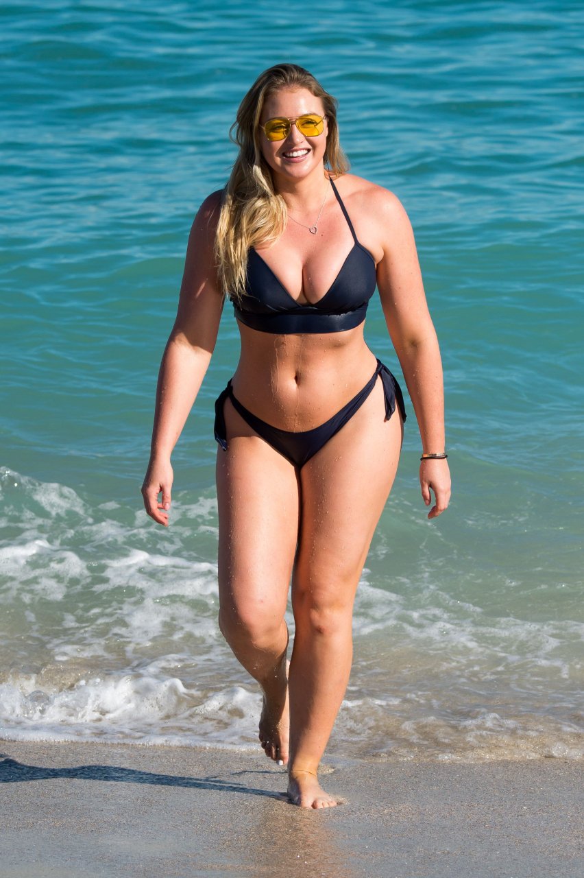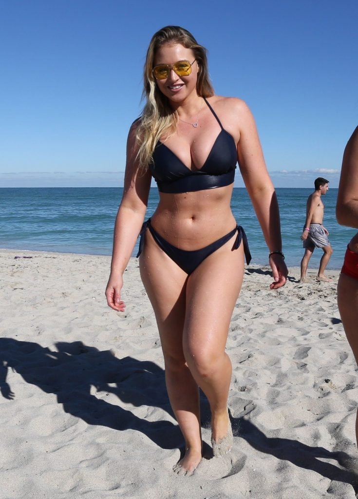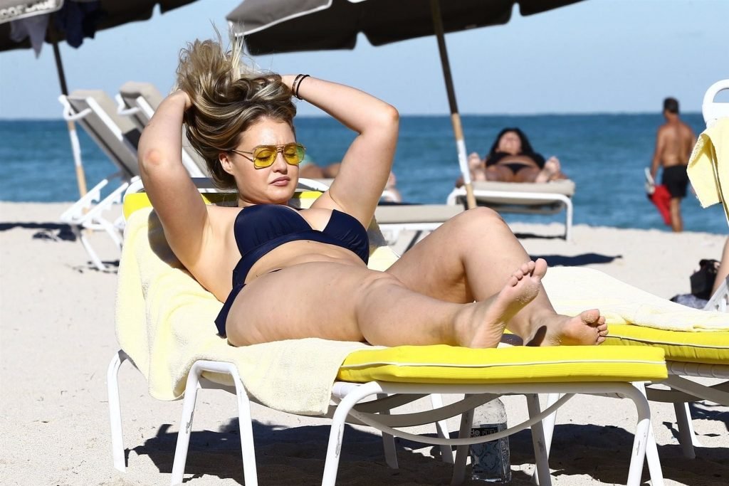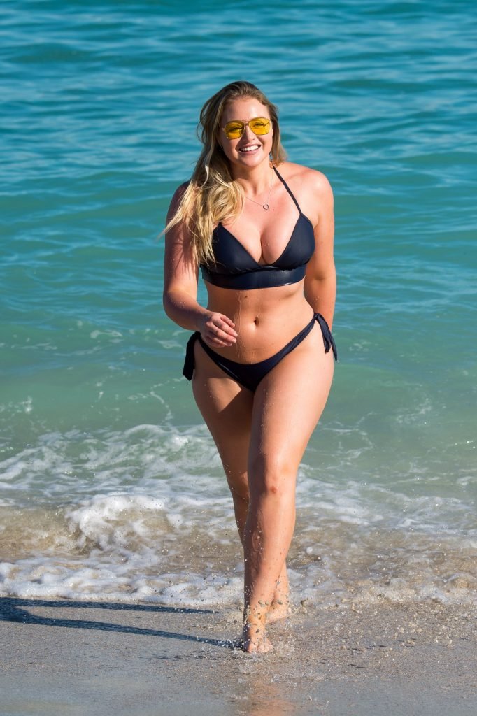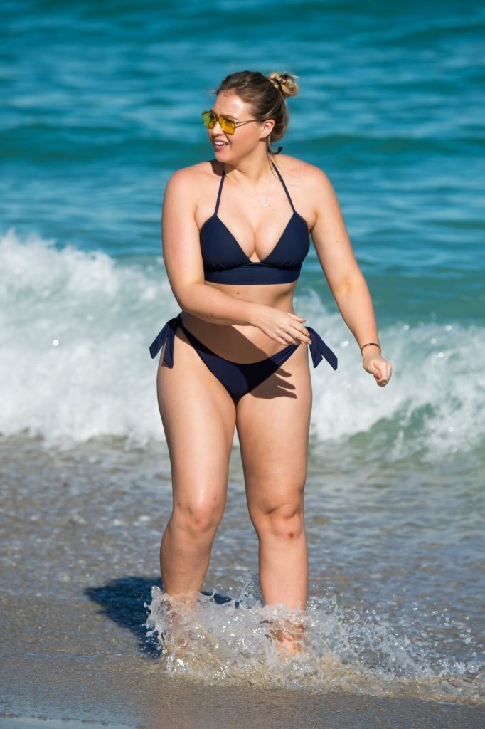Iskra Lawrence y algunos amigos se ven disfrutando de un día en la playa en Miami, 11/12/2017. La modelo de 27 años y curvas pronunciadas mostró sus curvas con un bikini azul marino y disfrutó de una barra de helado mientras tomaba el sol.