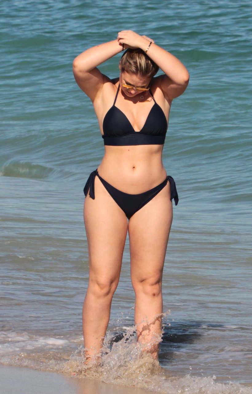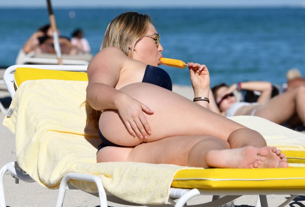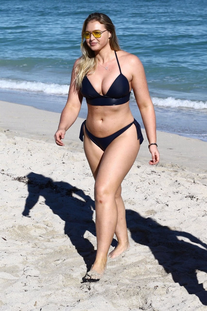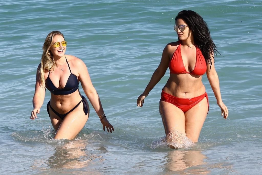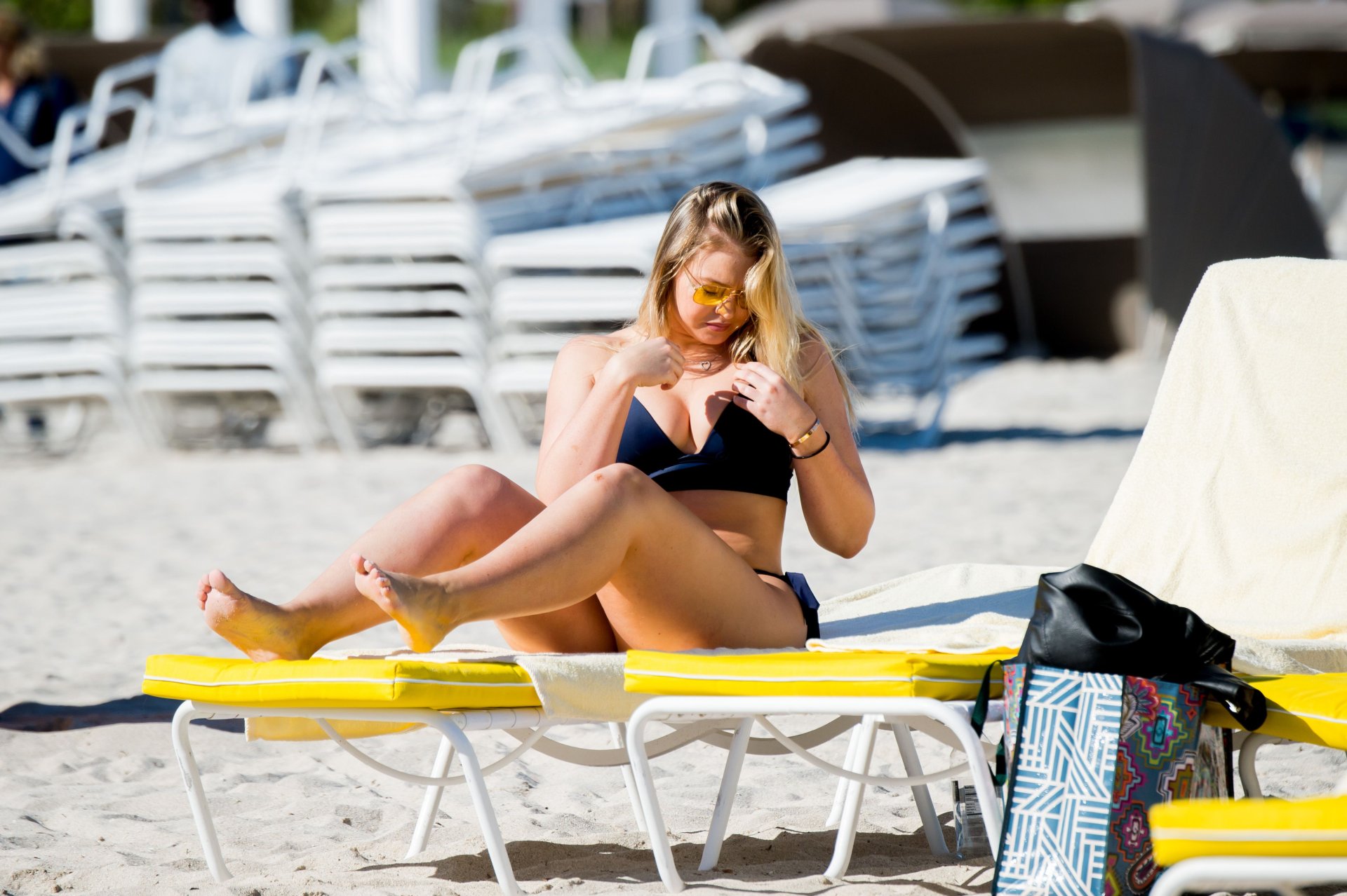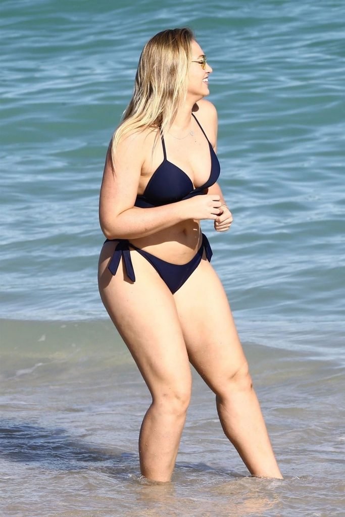Iskra Lawrence y algunos amigos se ven disfrutando de un día en la playa en Miami, 11/12/2017. La modelo de 27 años y curvas pronunciadas mostró sus curvas con un bikini azul marino y disfrutó de una barra de helado mientras tomaba el sol.