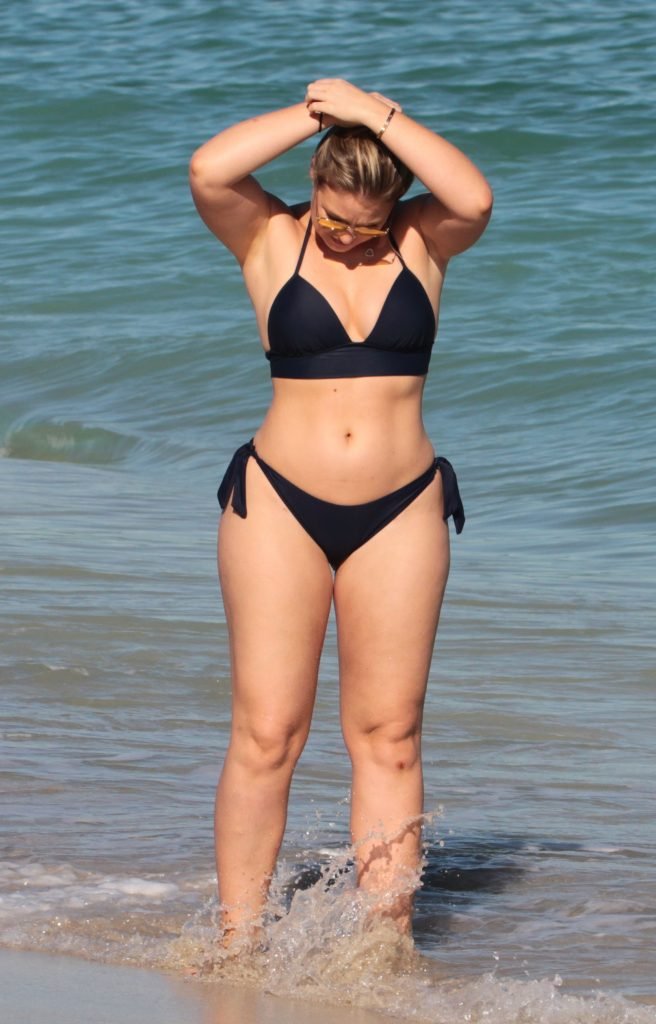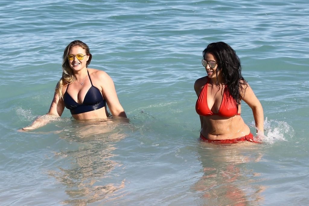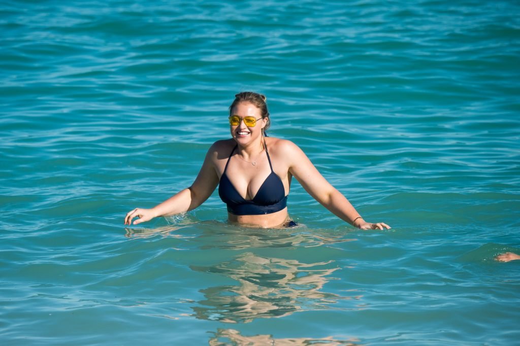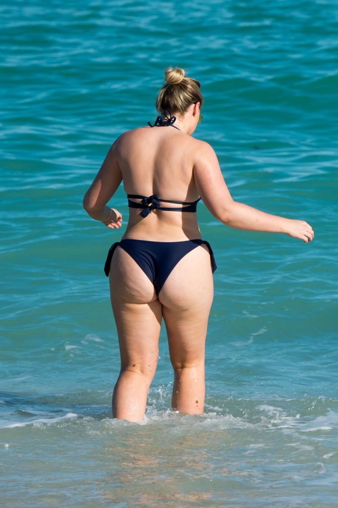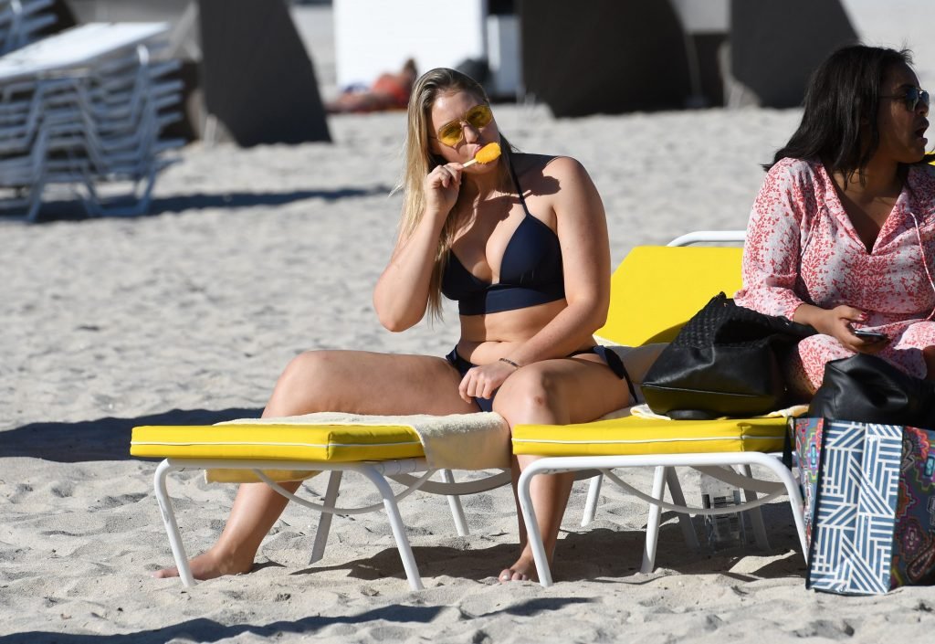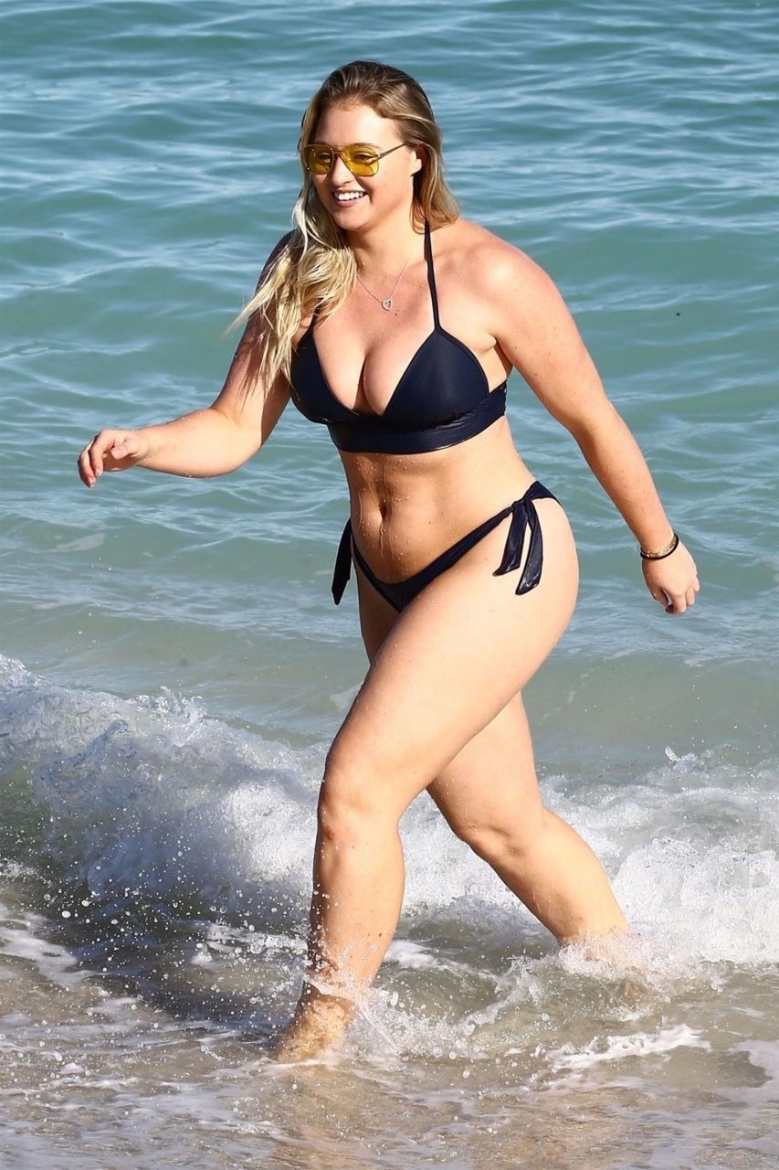 Iskra Lawrence y algunos amigos se ven disfrutando de un día en la playa en Miami, 11/12/2017. La modelo de 27 años y curvas pronunciadas mostró sus curvas con un bikini azul marino y disfrutó de una barra de helado mientras tomaba el sol.