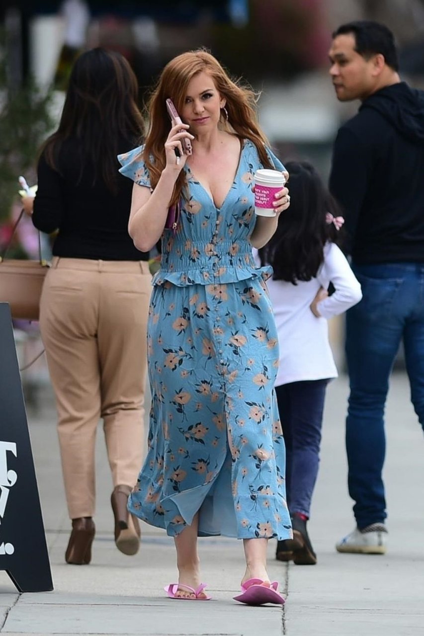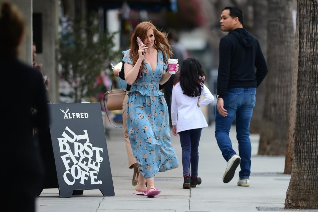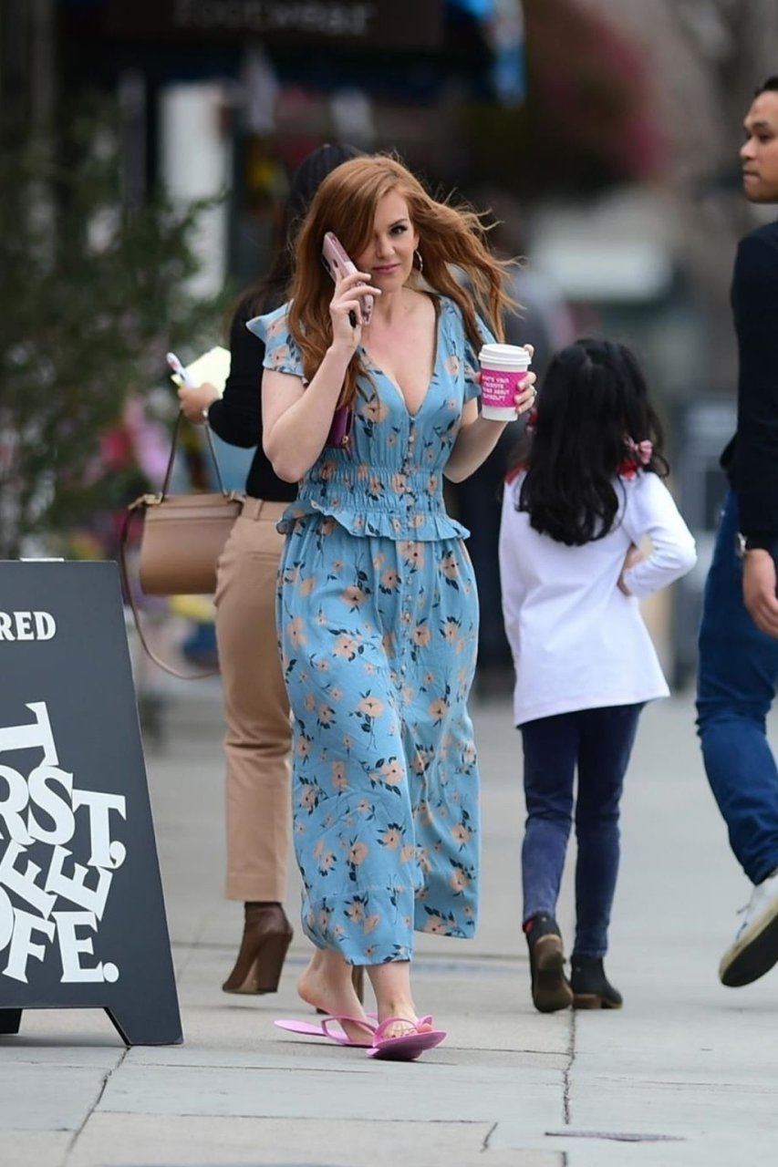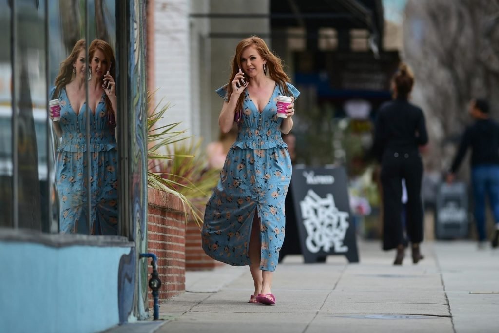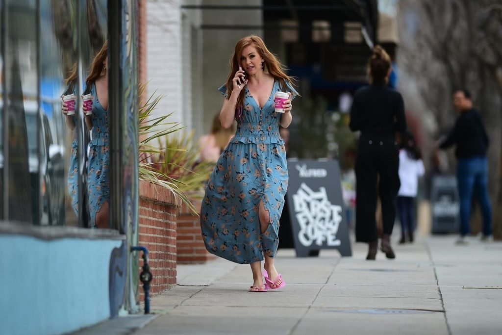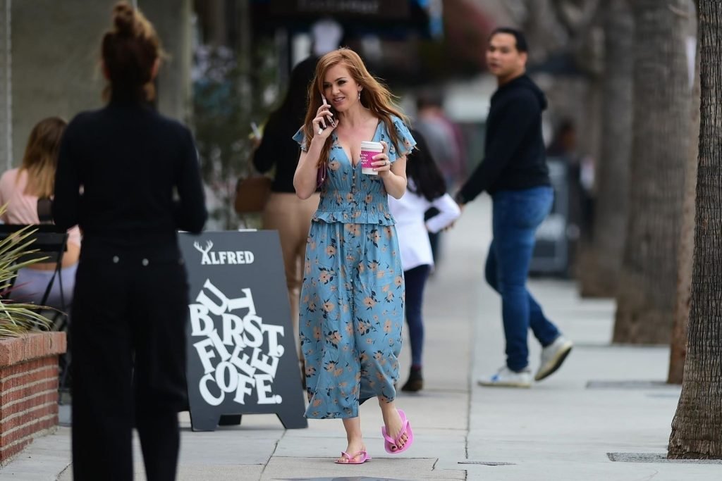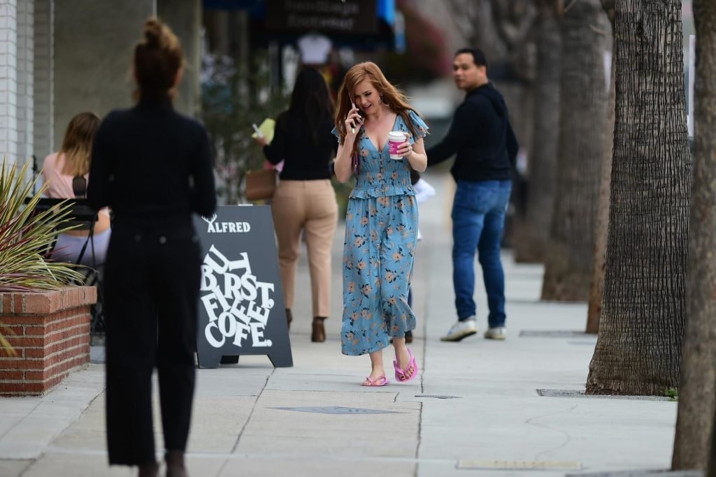Isla Fisher se ve encantadora con un vestido azul fluido que deja ver el escote mientras va a tomar un café a Alfred’s después de hacerse las uñas en Los Ángeles, 05/03/2019. La belleza de ‘The Beach Bum’ llama la atención mientras camina por la concurrida acera de regreso a su coche.