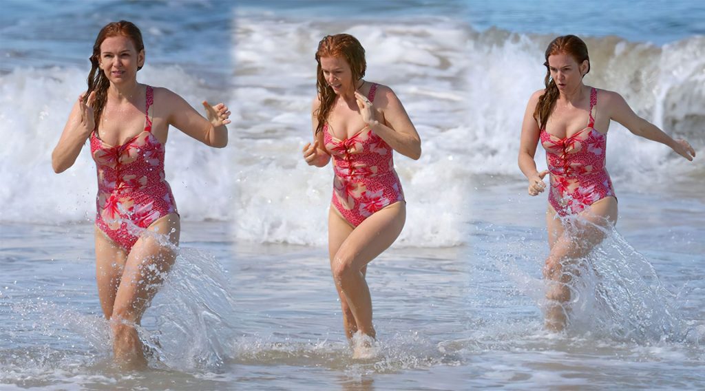Isla Fisher, 45, muestra su increíble figura en un traje de baño floral rosa mientras disfruta de la playa en unas vacaciones extendidas en Australia.