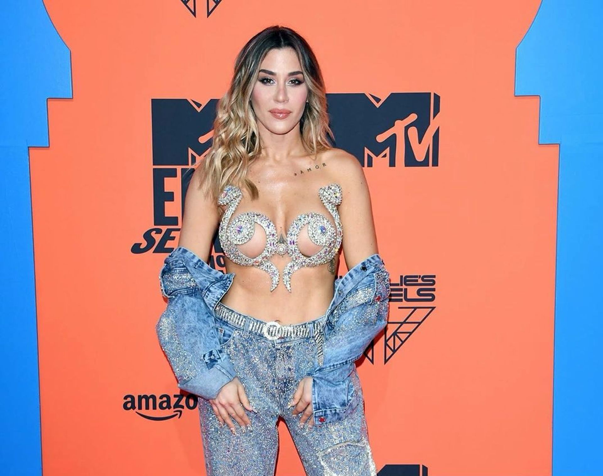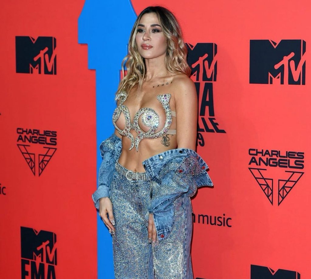 J Mena posa en una alfombra roja al llegar a los MTV Europe Music Awards 2019 en el Centro de Conferencias y Exposiciones FIBES en Sevilla, España, el 3 de noviembre de 2019. Ella mostró sus pechos, usando un sujetador interesante. Jimena Barón (también conocida como J Mena) es una actriz y cantante argentina. Es hermana del actor Federico Barón.