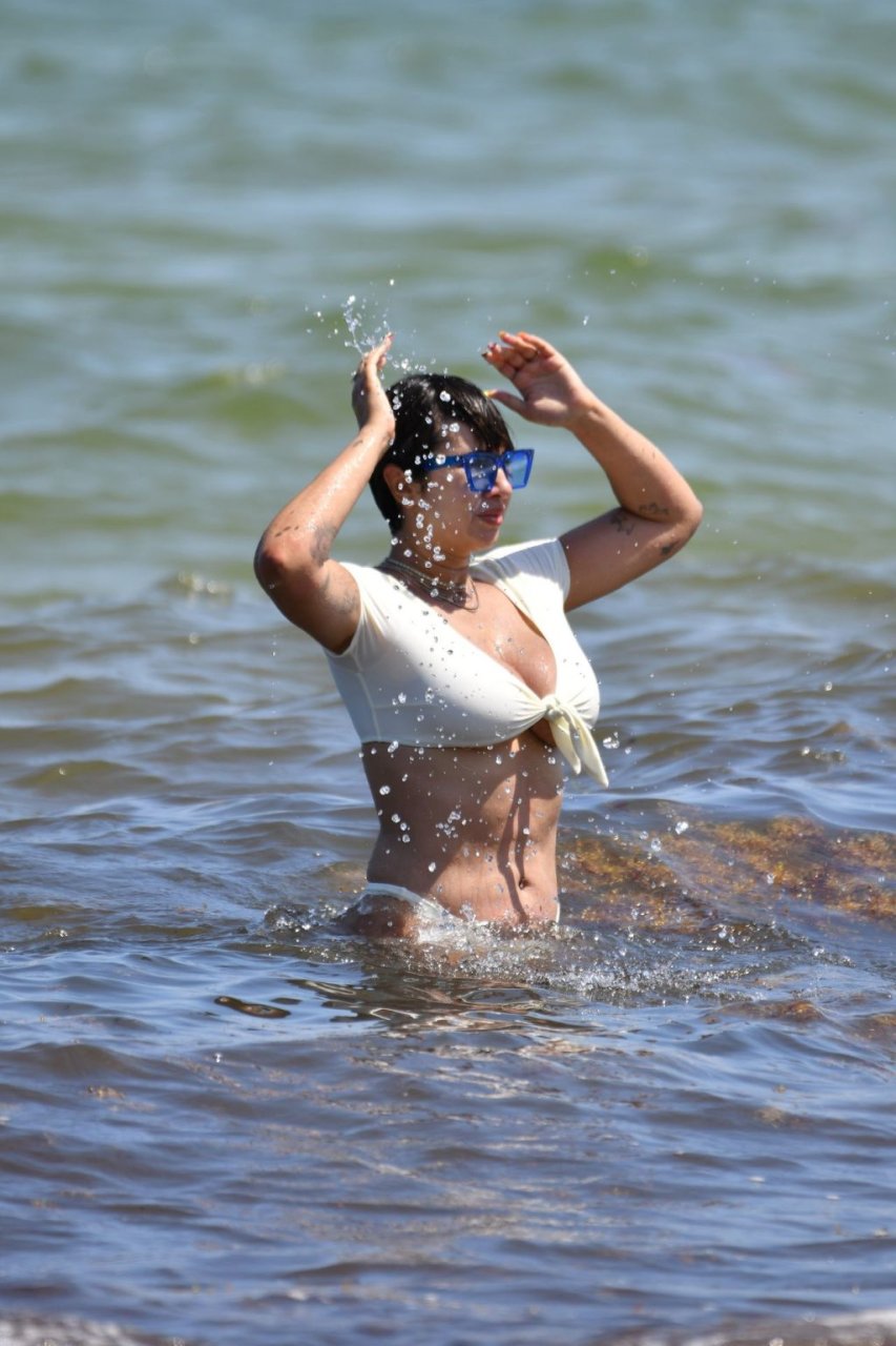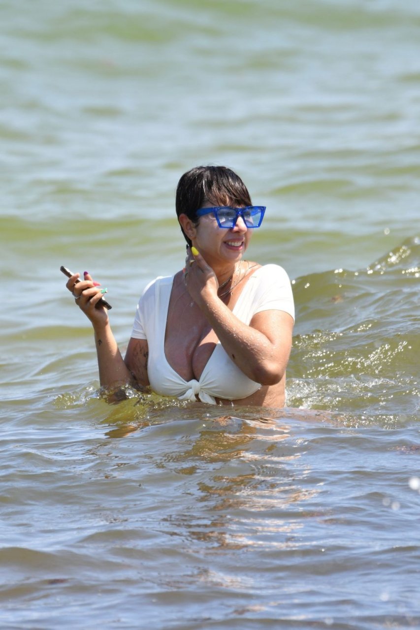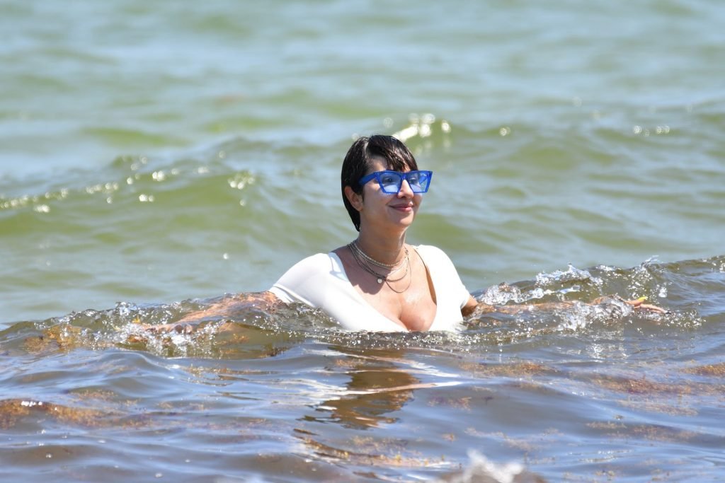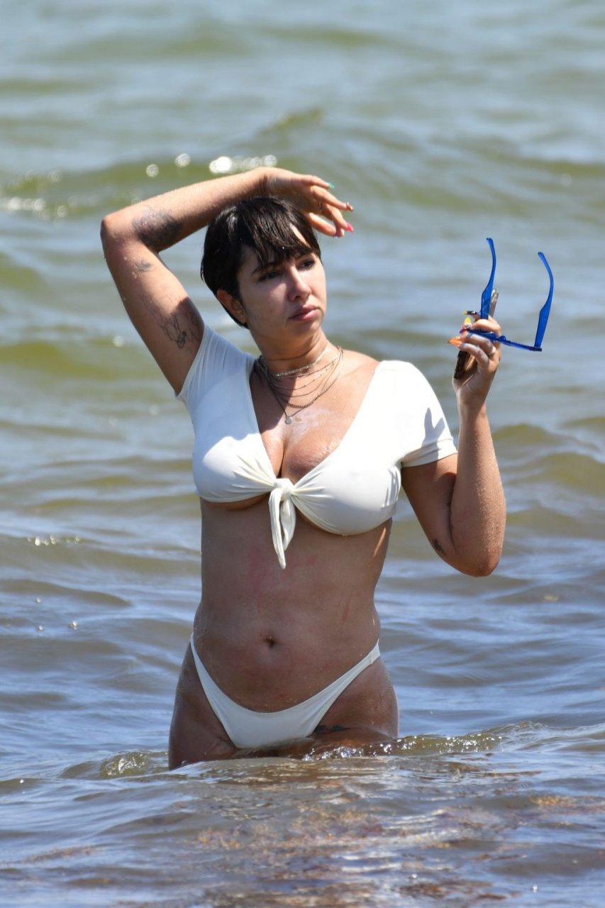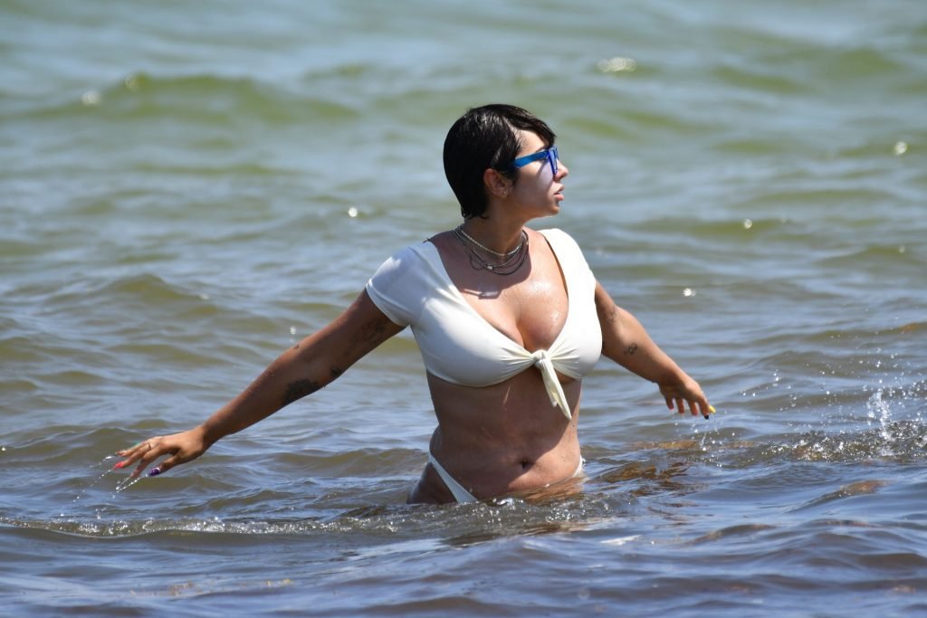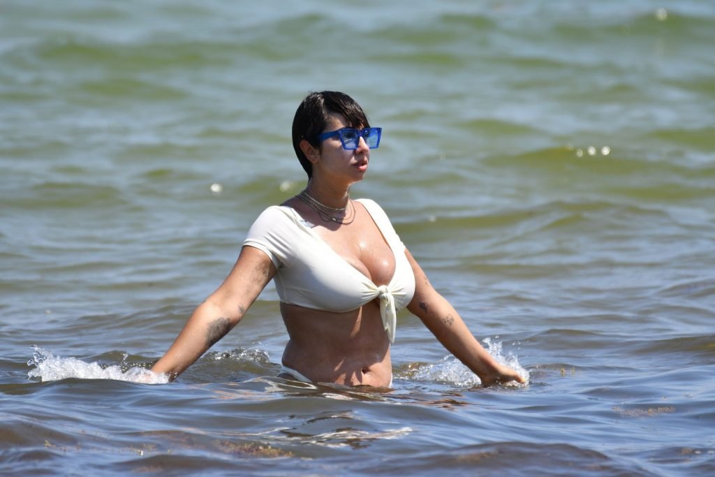 Jackie Cruz muestra sus impresionantes curvas con un bikini blanco anudado al frente mientras se relaja y se refresca en el agua en Miami Beach, 28/04/2019.