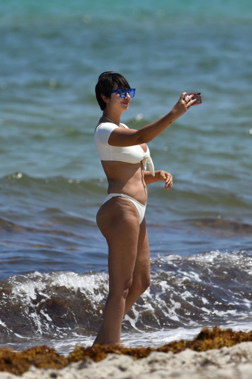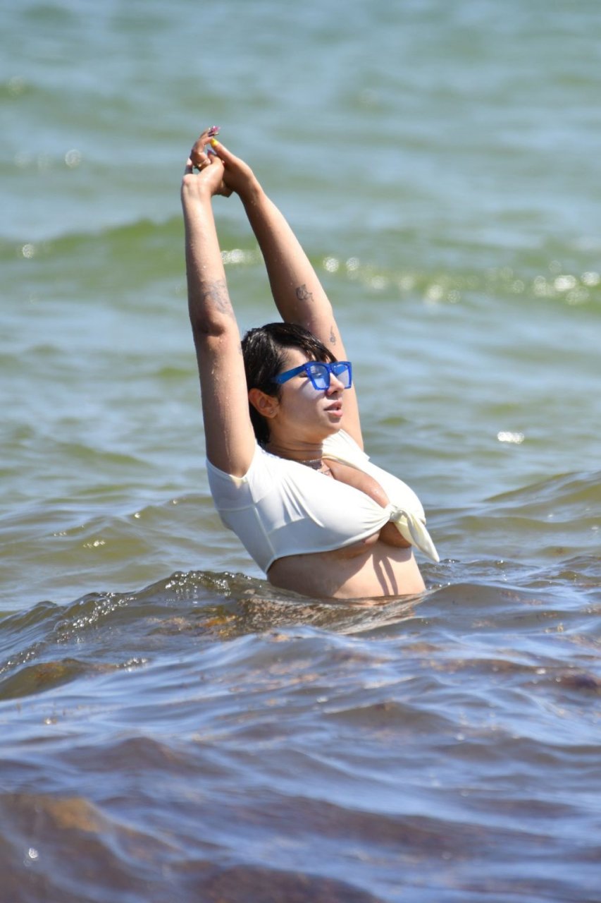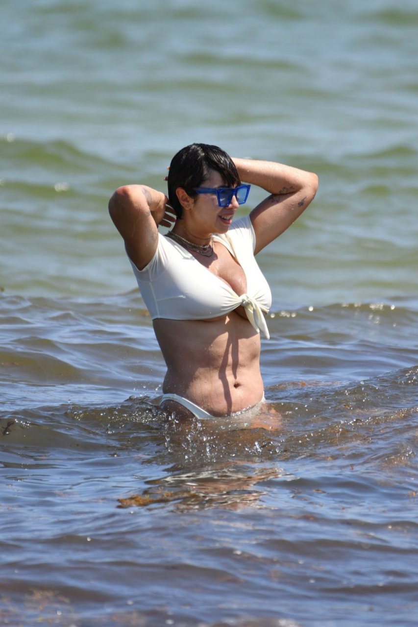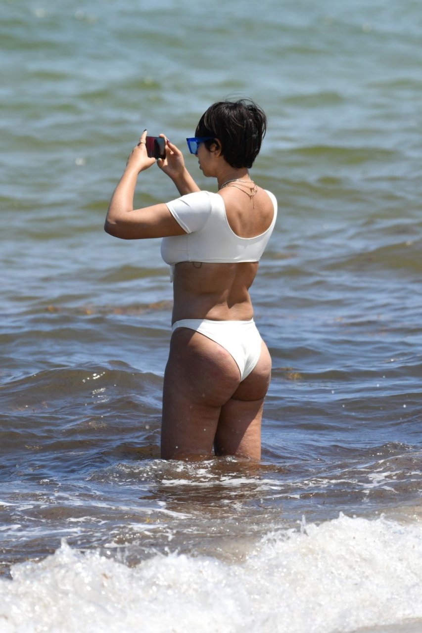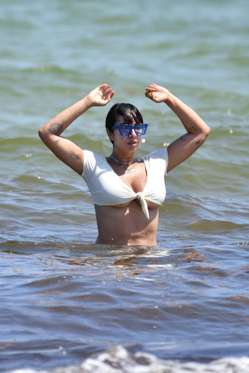 Jackie Cruz muestra sus impresionantes curvas con un bikini blanco anudado al frente mientras se relaja y se refresca en el agua en Miami Beach, 28/04/2019.