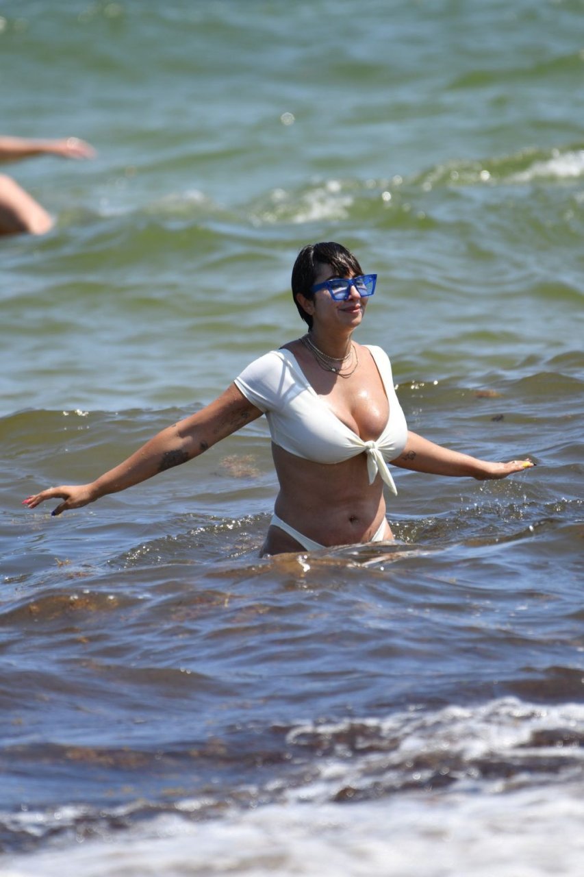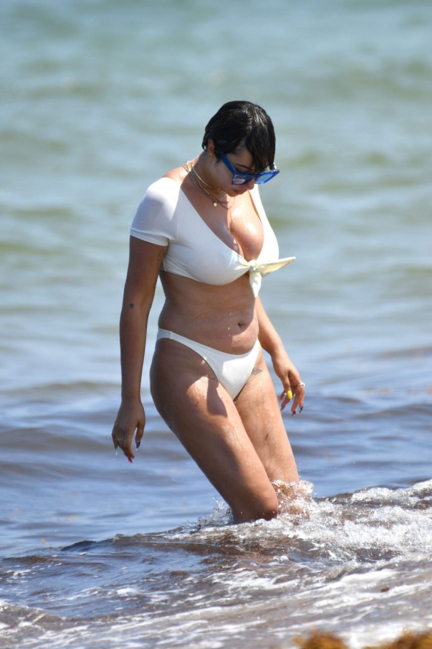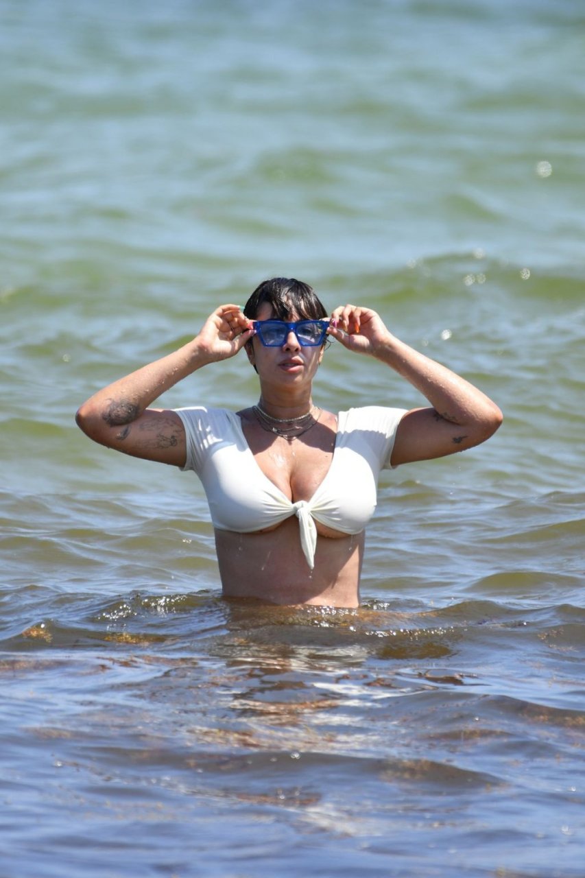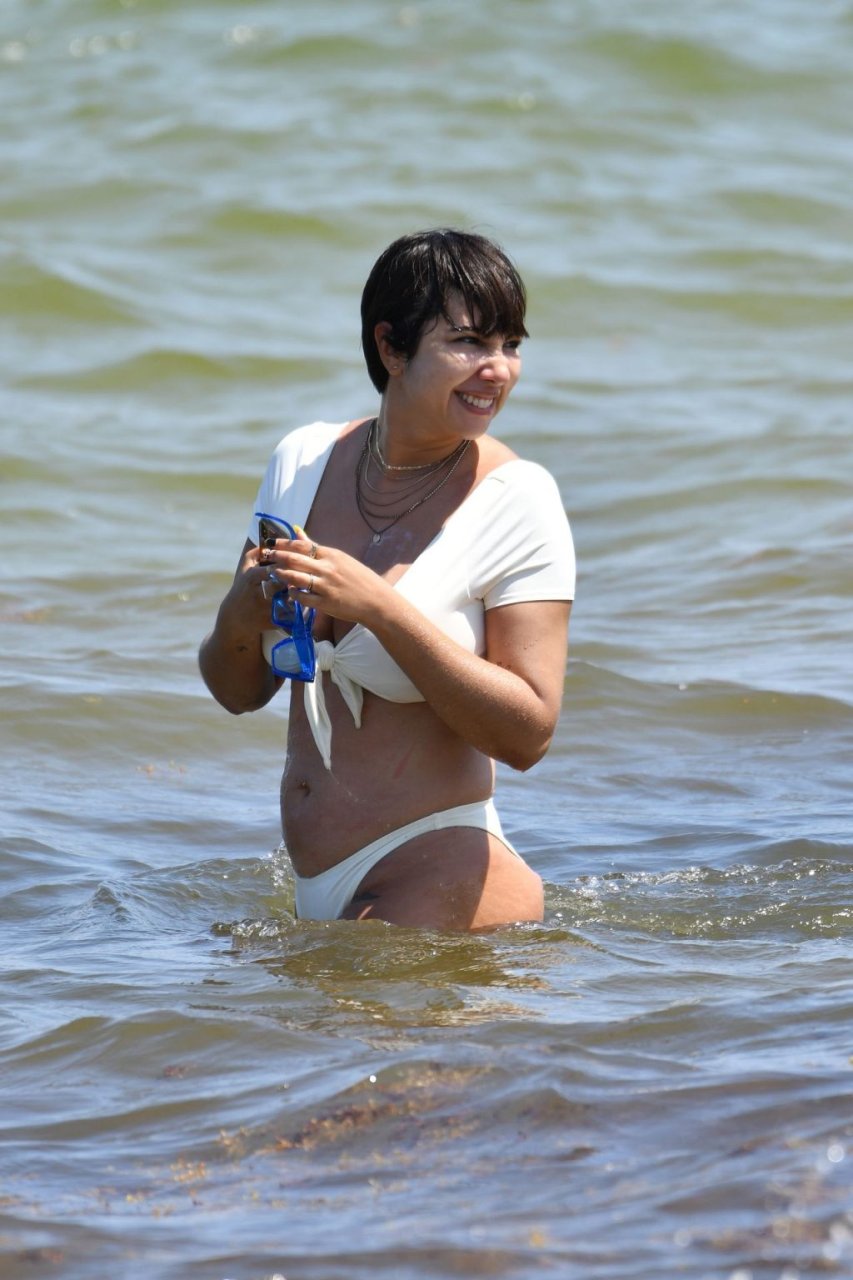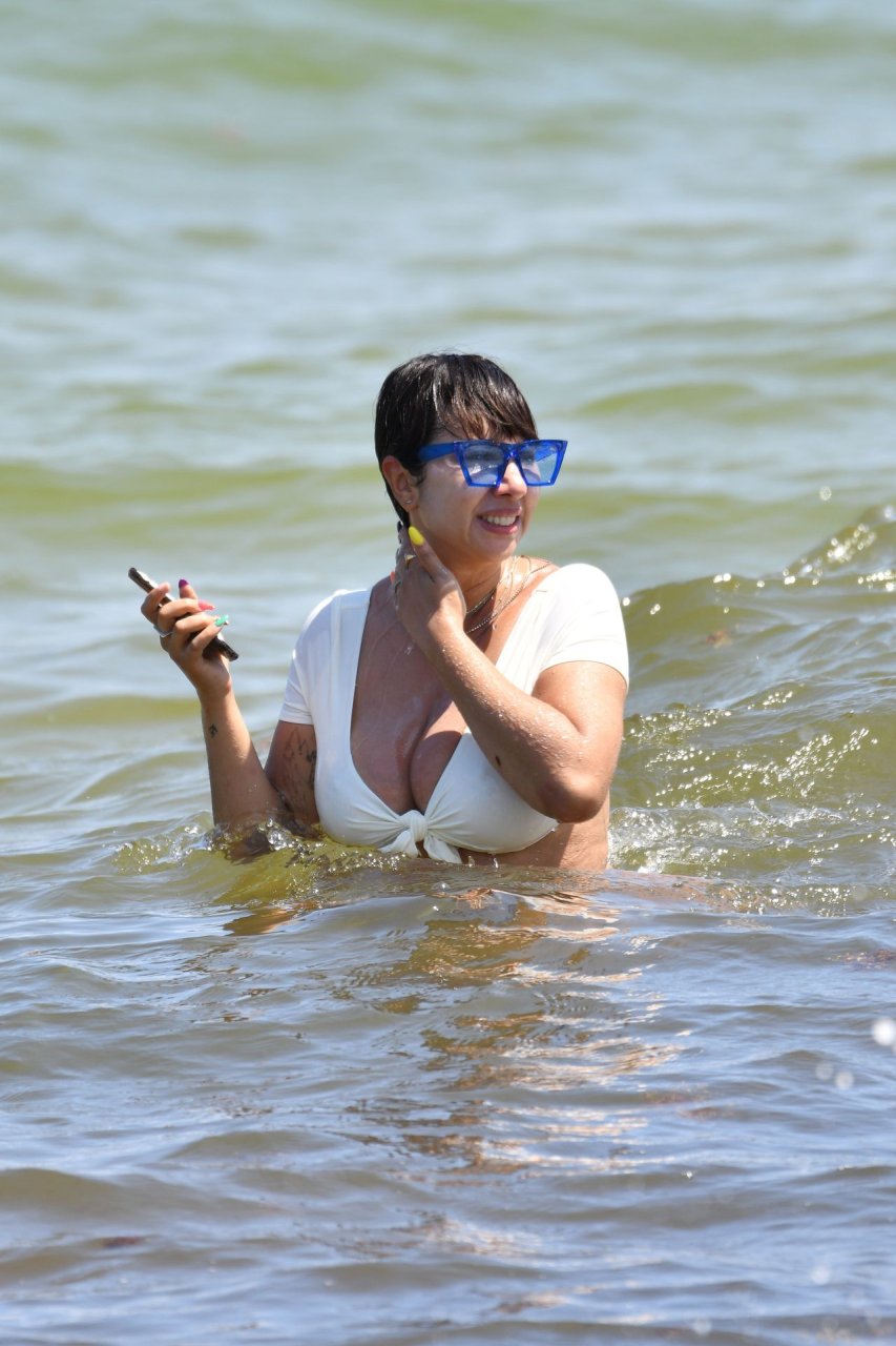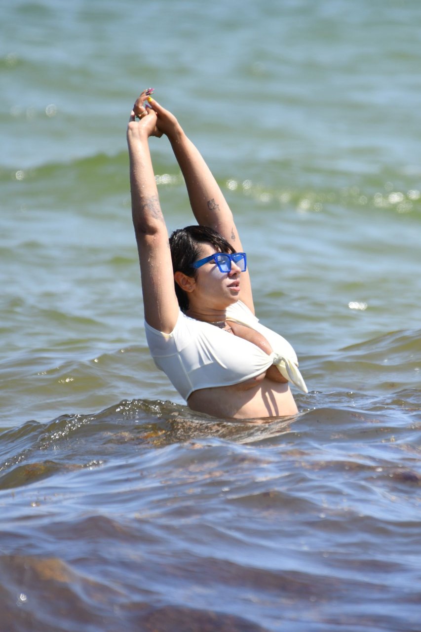 Jackie Cruz muestra sus impresionantes curvas con un bikini blanco anudado al frente mientras se relaja y se refresca en el agua en Miami Beach, 28/04/2019.