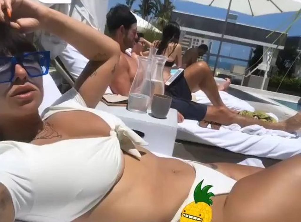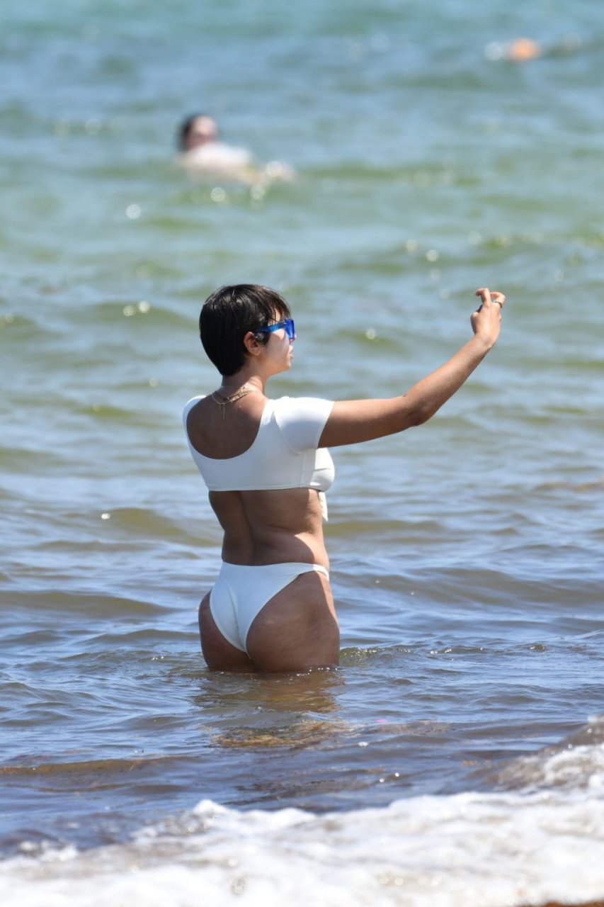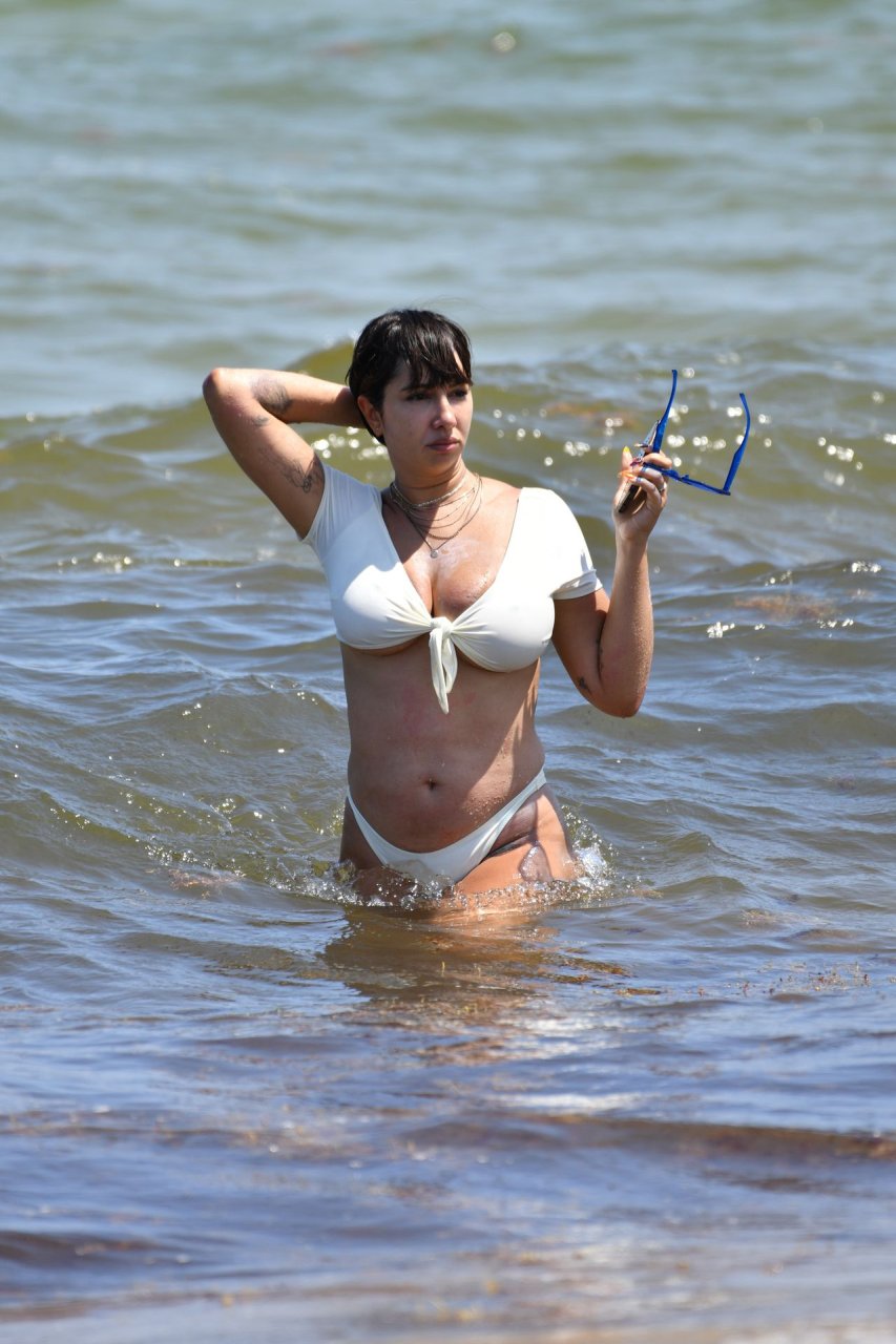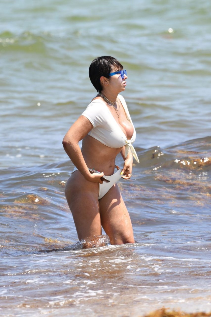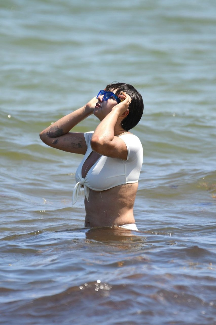 Jackie Cruz muestra sus impresionantes curvas con un bikini blanco anudado al frente mientras se relaja y se refresca en el agua en Miami Beach, 28/04/2019.