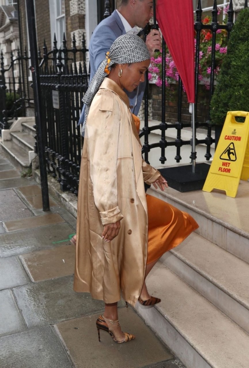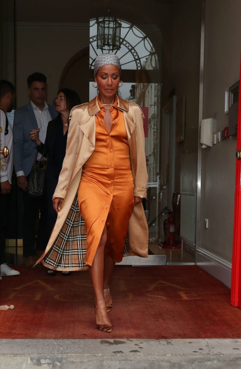La actriz estadounidense Jada Pinkett Smith llega a Asia House con un abrigo beige tipo trench en Londres, 30/07/2019.