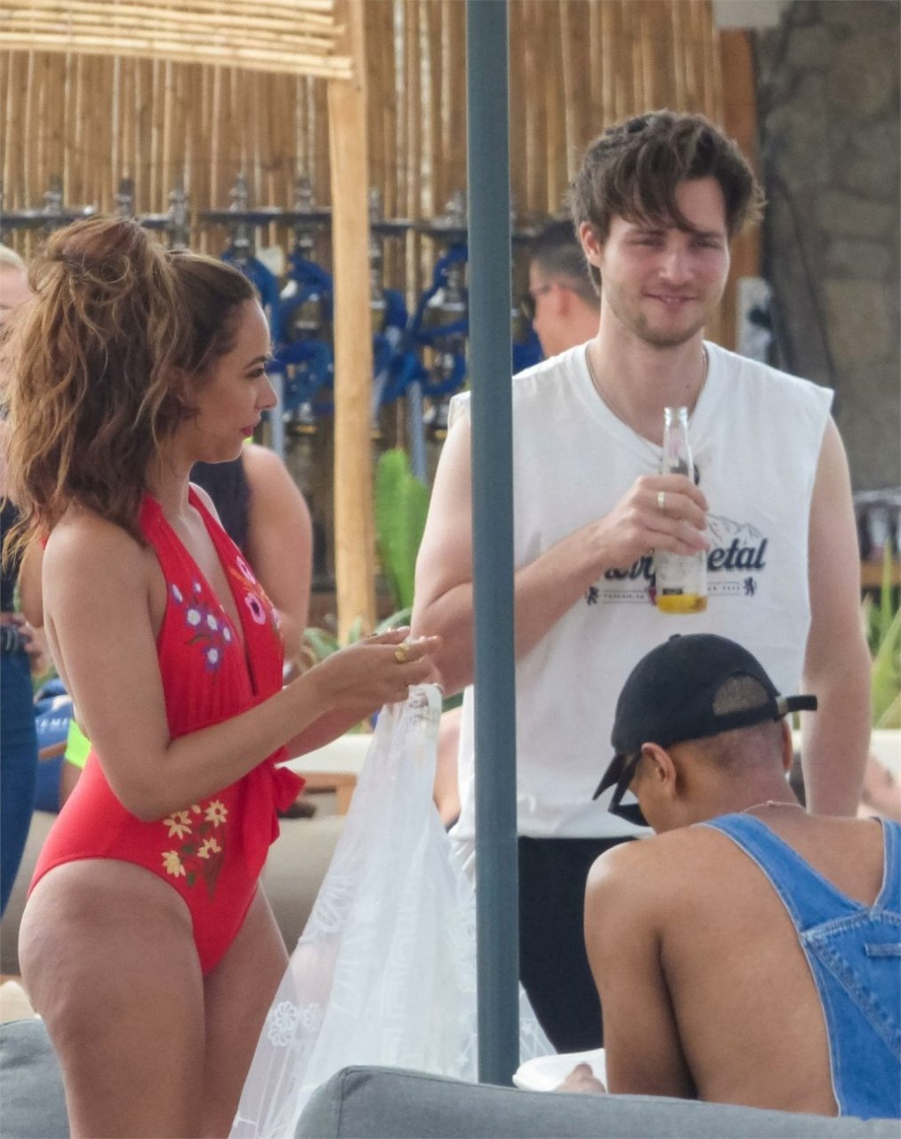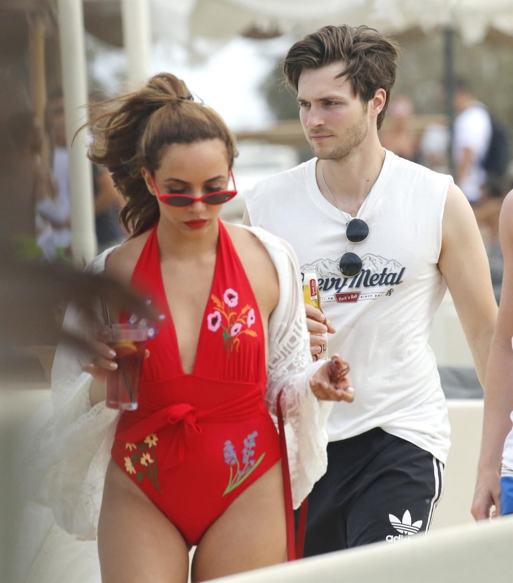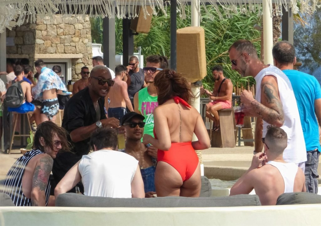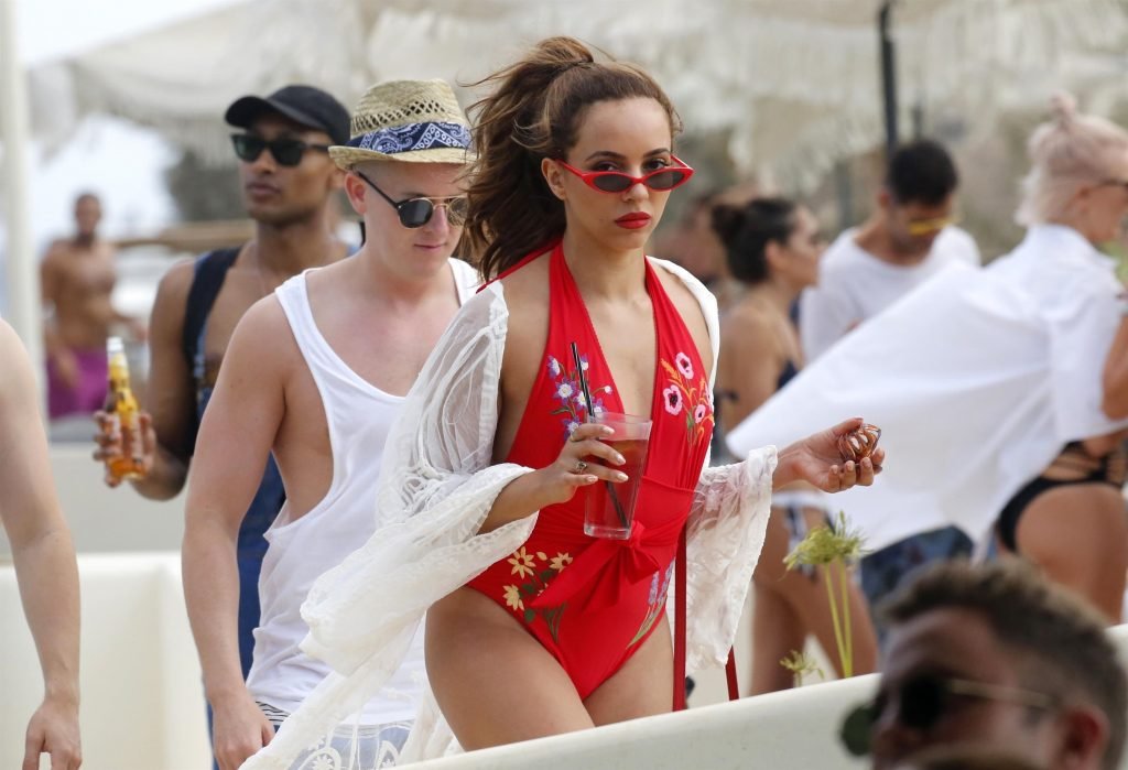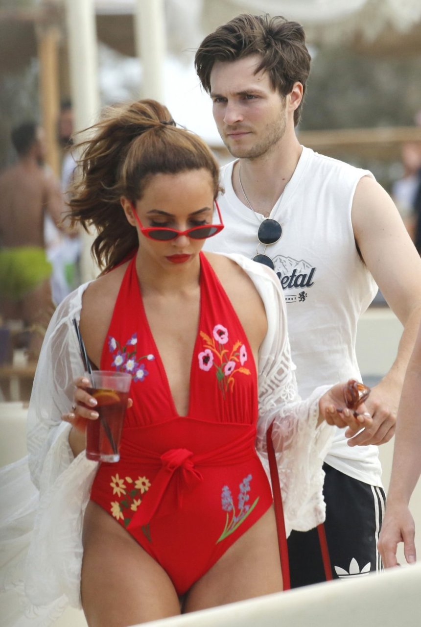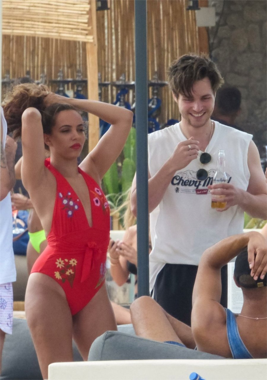 Curvilínea Jade Thirlwall fue vista con un traje de baño rojo mientras visitaba un bar en la playa con su novio Jed Elliott en Mykonos, Grecia, 04/08/2018. Jade Amelia Thirlwall es una cantante británica de 25 años (Little Mix), bailarina y estrella de televisión.
