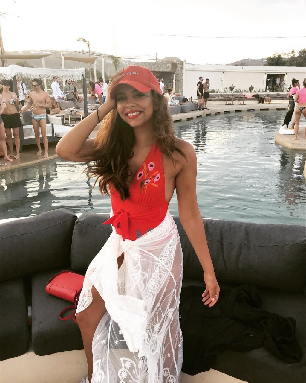 Curvilínea Jade Thirlwall fue vista con un traje de baño rojo mientras visitaba un bar en la playa con su novio Jed Elliott en Mykonos, Grecia, 04/08/2018. Jade Amelia Thirlwall es una cantante británica de 25 años (Little Mix), bailarina y estrella de televisión.