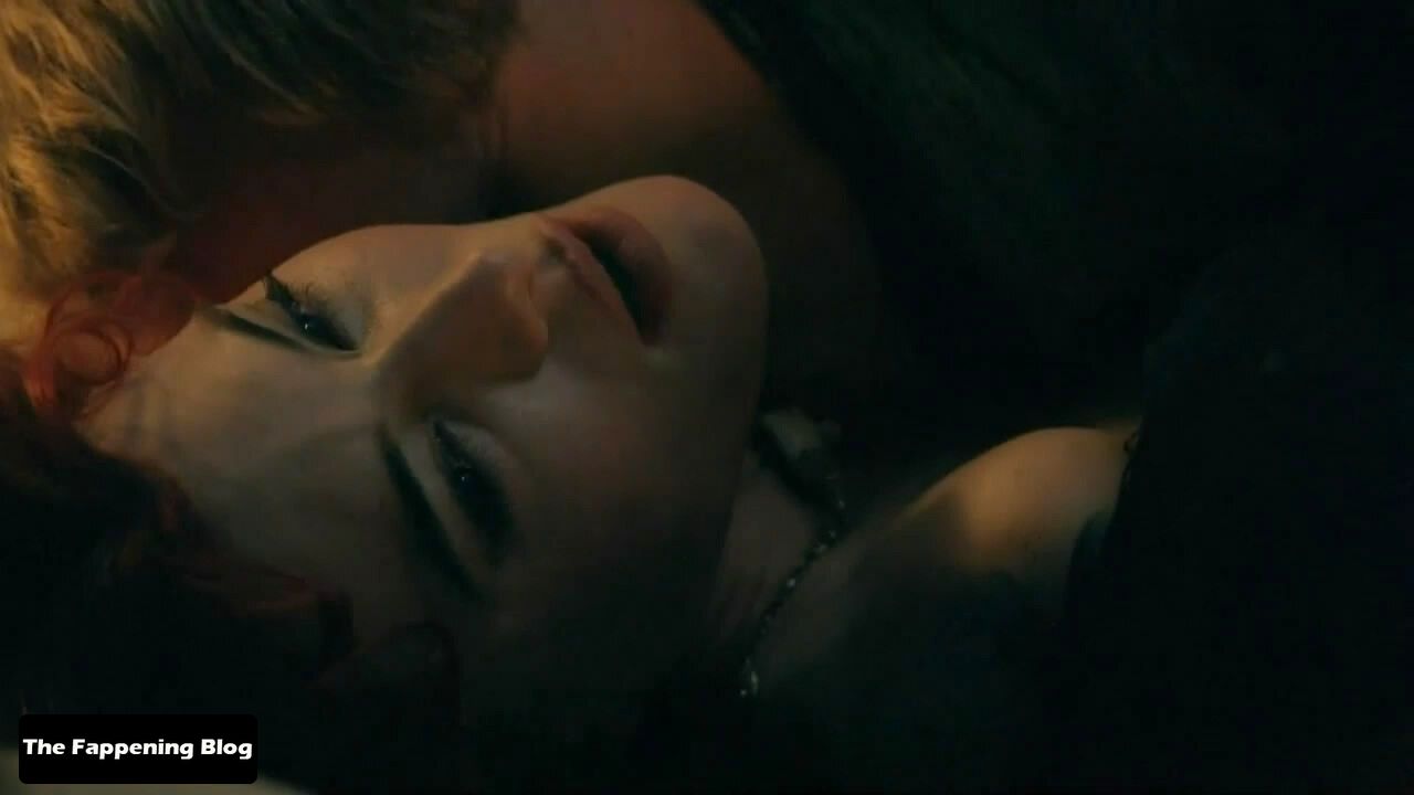 Jaime Murray está sentada mientras un hombre está detrás de ella y le desabrocha el vestido, exponiendo su pecho izquierdo, metiendo la mano para apretarlo antes de besarse con ella y acostarla para tener sexo.