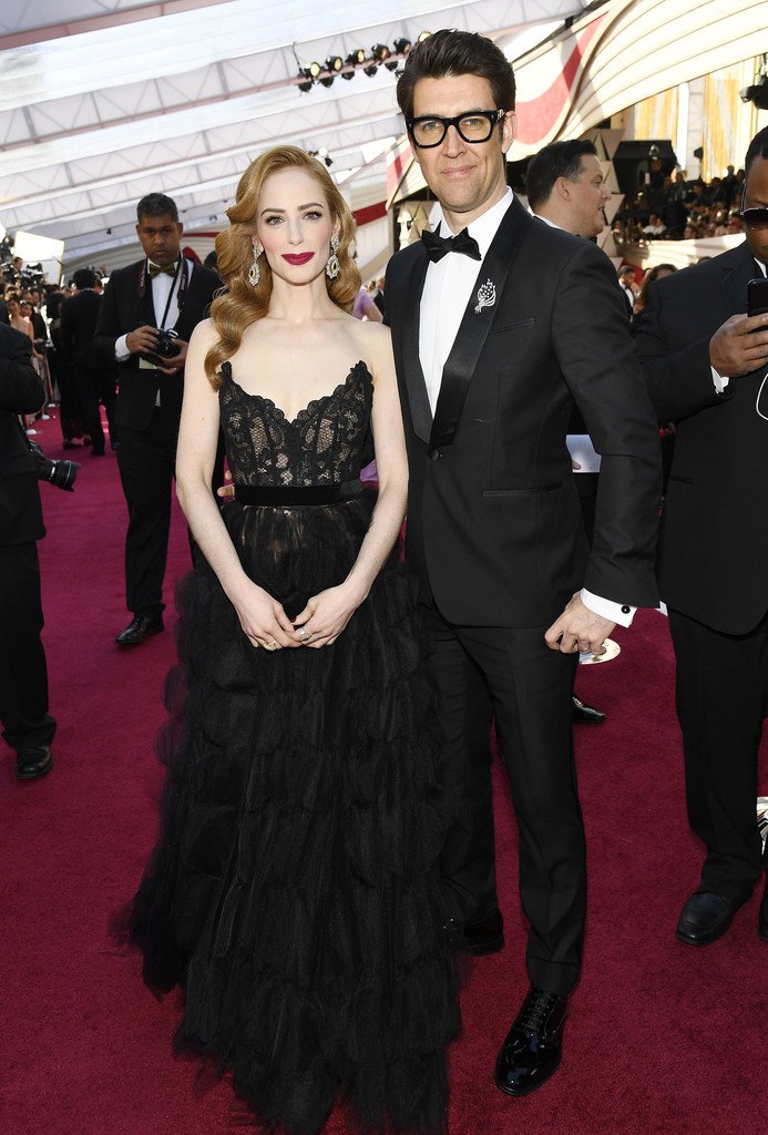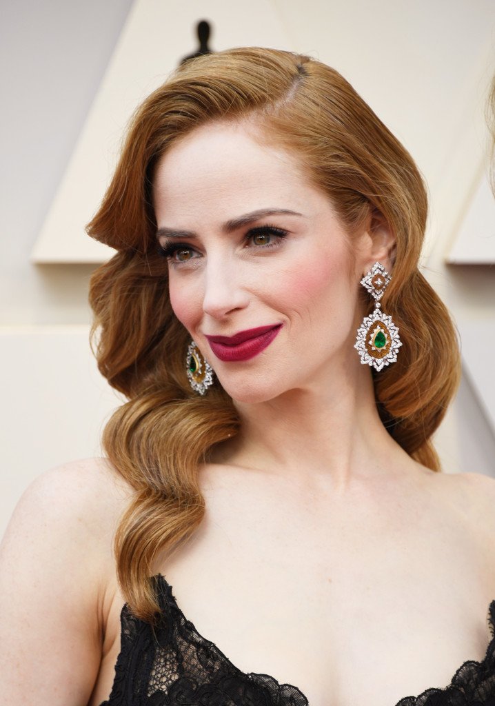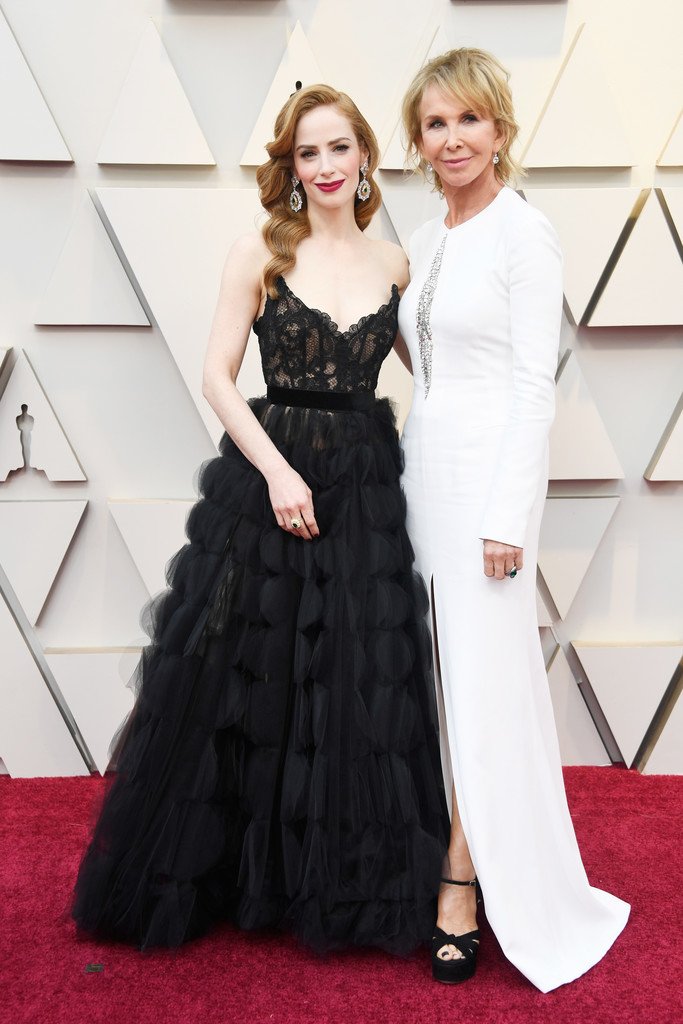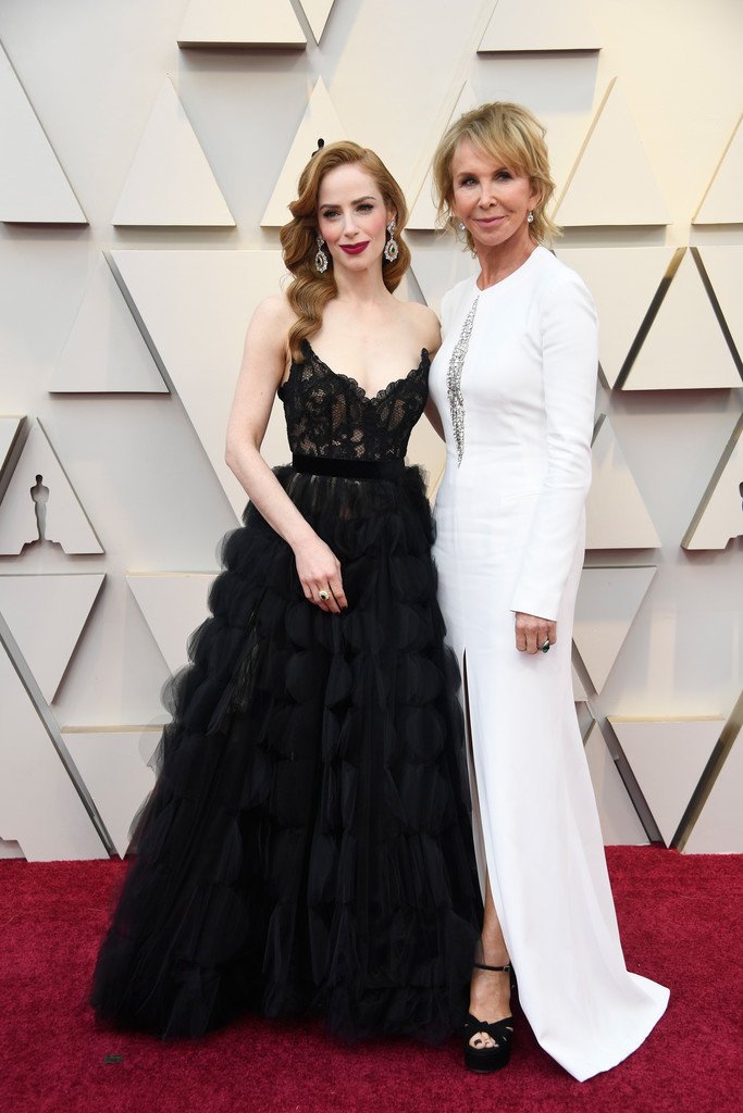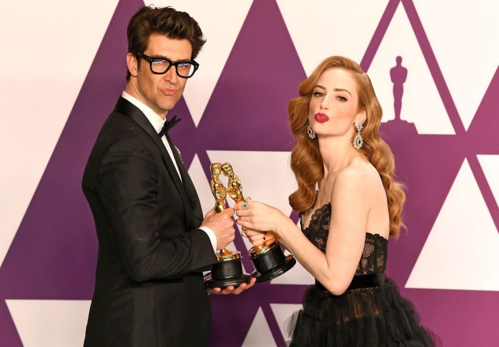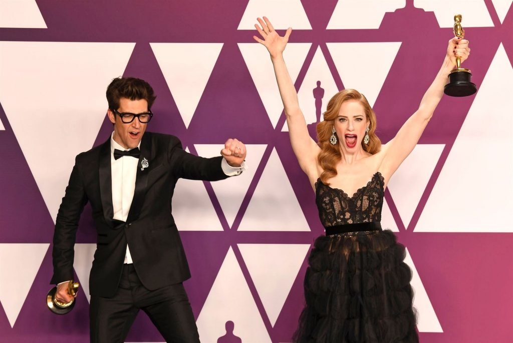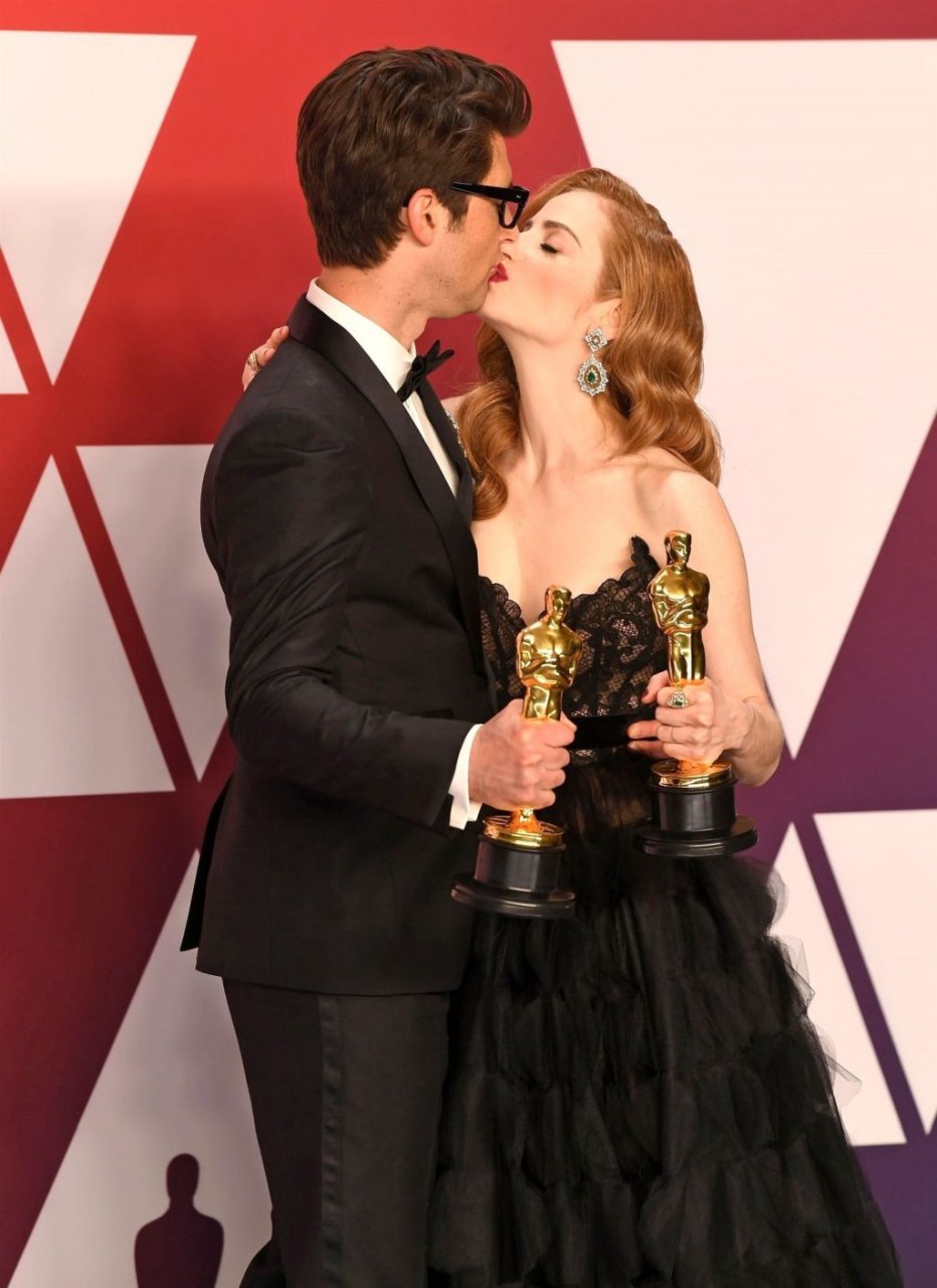 Actriz Jaime Ray Newman muestra su escote y la alegría de la victoria en la sala de prensa en la 91ª Entrega Anual de los Premios de la Academia (Oscars) presentados por la Academia de Artes y Ciencias Cinematográficas – Hollywood, 24/02/2019.
